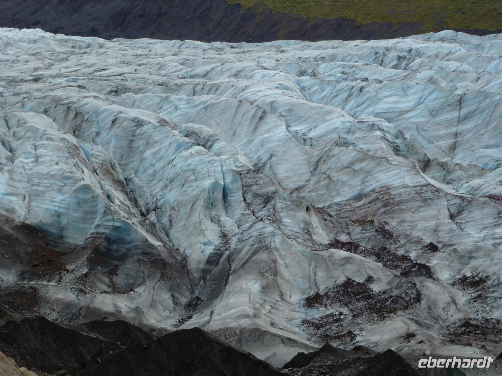 Nach dem Frühstück sind wir gleich nochmal zur Gletscherlagune gefahren - heute war die Sicht viel besser und wir haben das Ausmaß und die Größe von diesem gigantischen Gletscher erstmal gesehen! Und die blauen Eisblöcke im Wasser - traumhaft! Weiter ging es zu einem von Snorris „Geheimtipps“ - die Gletscherzunge Svinafellsjökull. Wir haben dort gehalten und sind ganz nah an die riesengroße Gletscherzunge ran gelaufen - wirklich beeindruckend das ewige Eis!