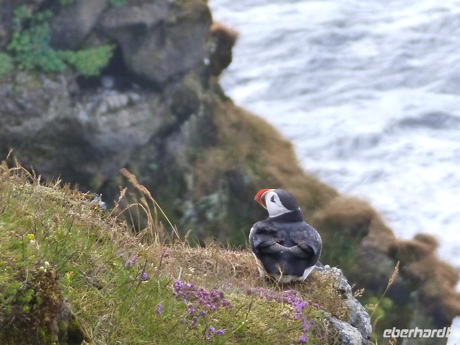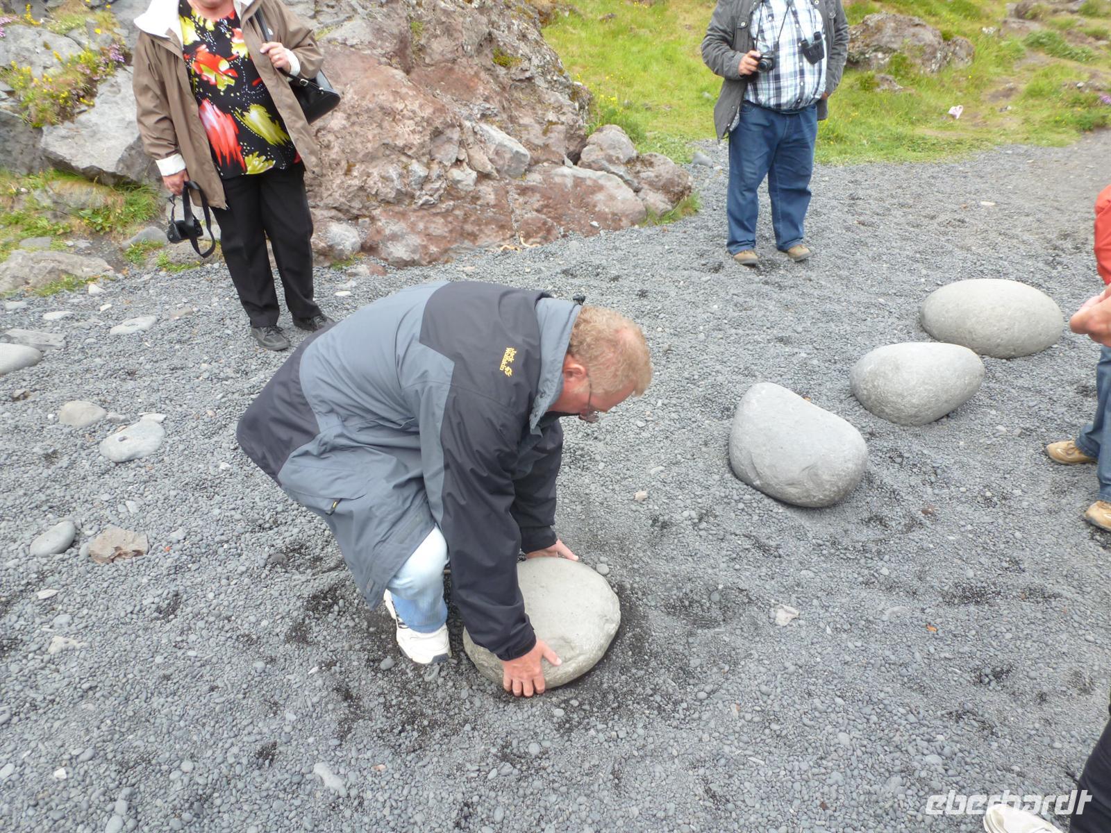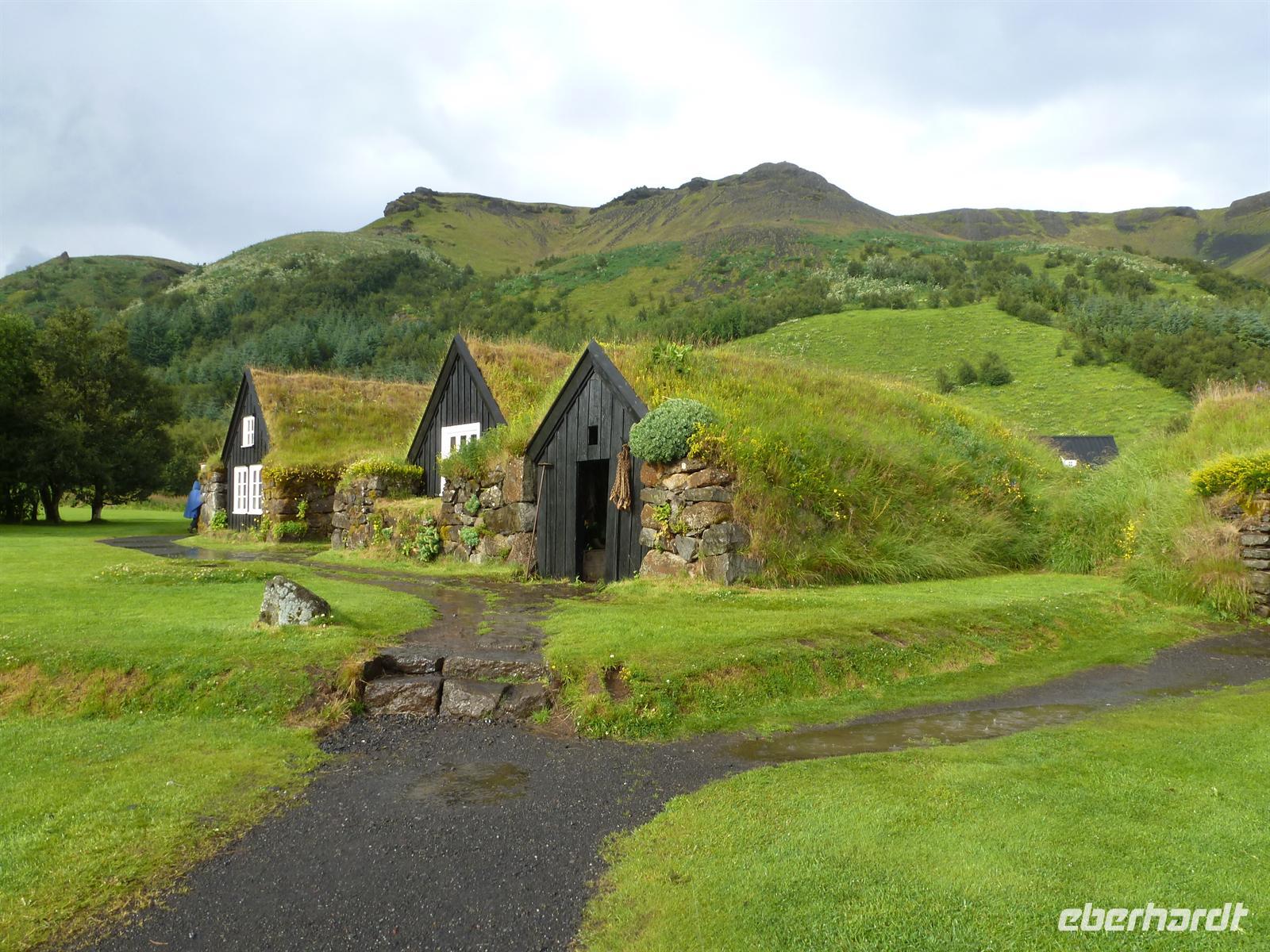 Moos überwachsen - kilometerweit nichts als erstarrte Lava aus von einem Ausbruch aus dem 18. Jahrhundert. Nach diesem Spaziergang fuhren wir entlang der wunderbaren Südküste Islands nach Vik und dann zum Naturwunder Dyrholaey. Hier leben hunderte von putzigen Papageientauchern - der Nationalvogel Islands mit seinem orangenen Schnabel hat sich hier niedergelassen und oben vom Leuchtturmfelsen aus kann man ihn gut beobachten. Nach diesem Erlebnis machten wir uns wieder auf den Weg und besuchten das Heimatmuseum von Skogar. Hier entdeckten wir hunderte von isländischen Dingen der Bauernfamilien und auch deren Torfhäuser mit Grasdach. Weiter ging es zu den imposanten Wasserfällen Skogarfoss und Seljalandsfoss - auch bei Regen sahen die beiden wunderschön aus. Wir stoppten auch noch unterm dem für die Aschewolke 2010 verantwortlichen Vulkan Eyjafjallajökull. Schließlich erreichten wir nach einem weiteren Tag voller Höhepunkte und tollen Erklärungen und Erzählungen durch Snorri unser traumhaft schönes Hotel am Ranga Fluß. Whirlpools im Garten und frischer Lachs im Restaurant mit Blick auf die weite Landschaft mit dem Fluß rundeten diesen schönen Tag ab!