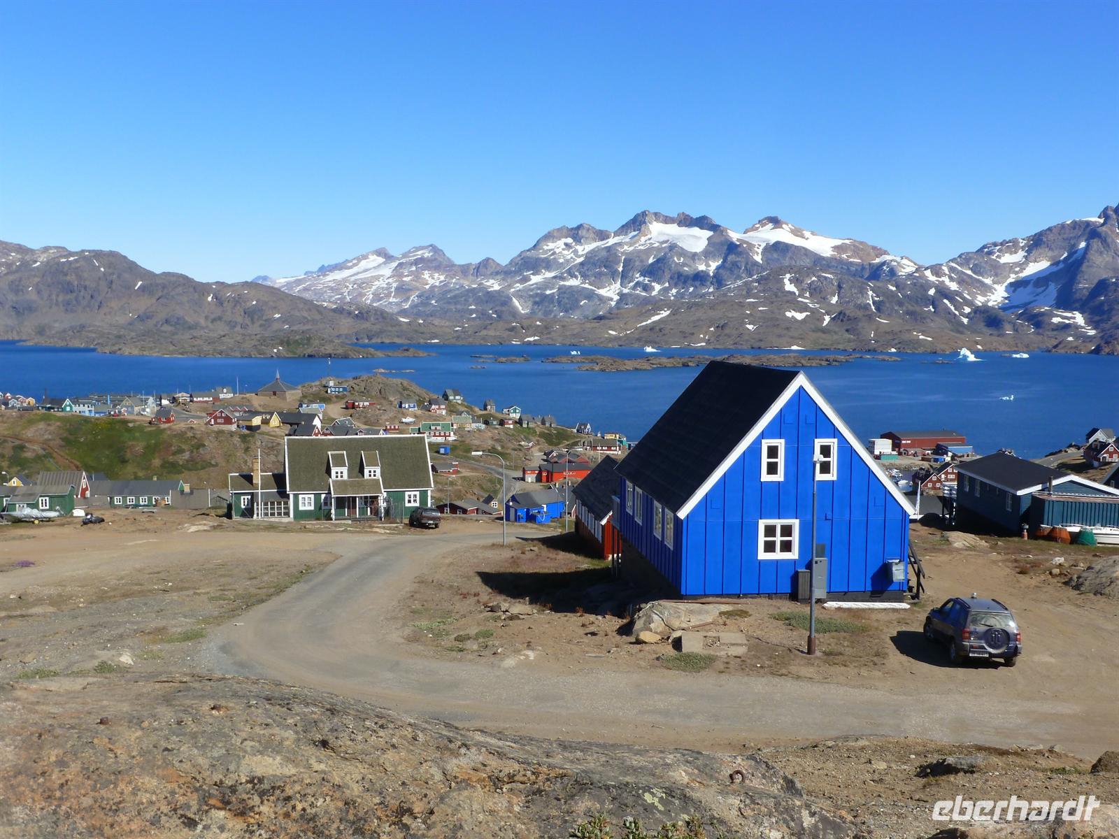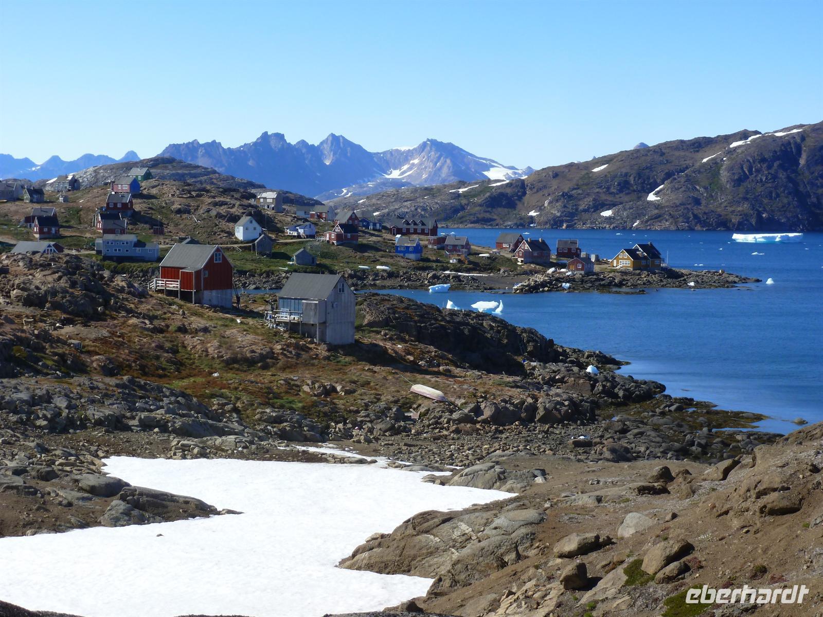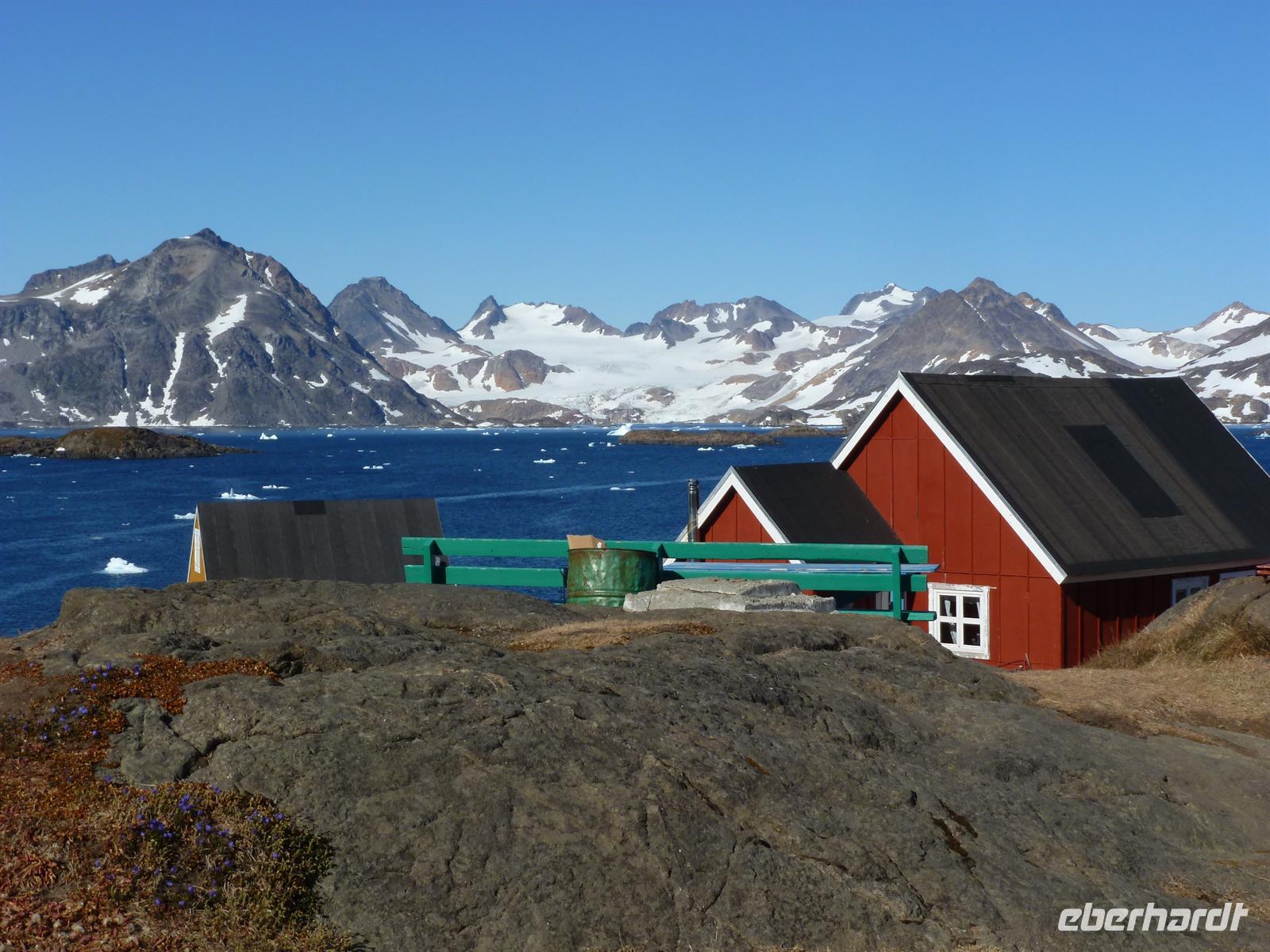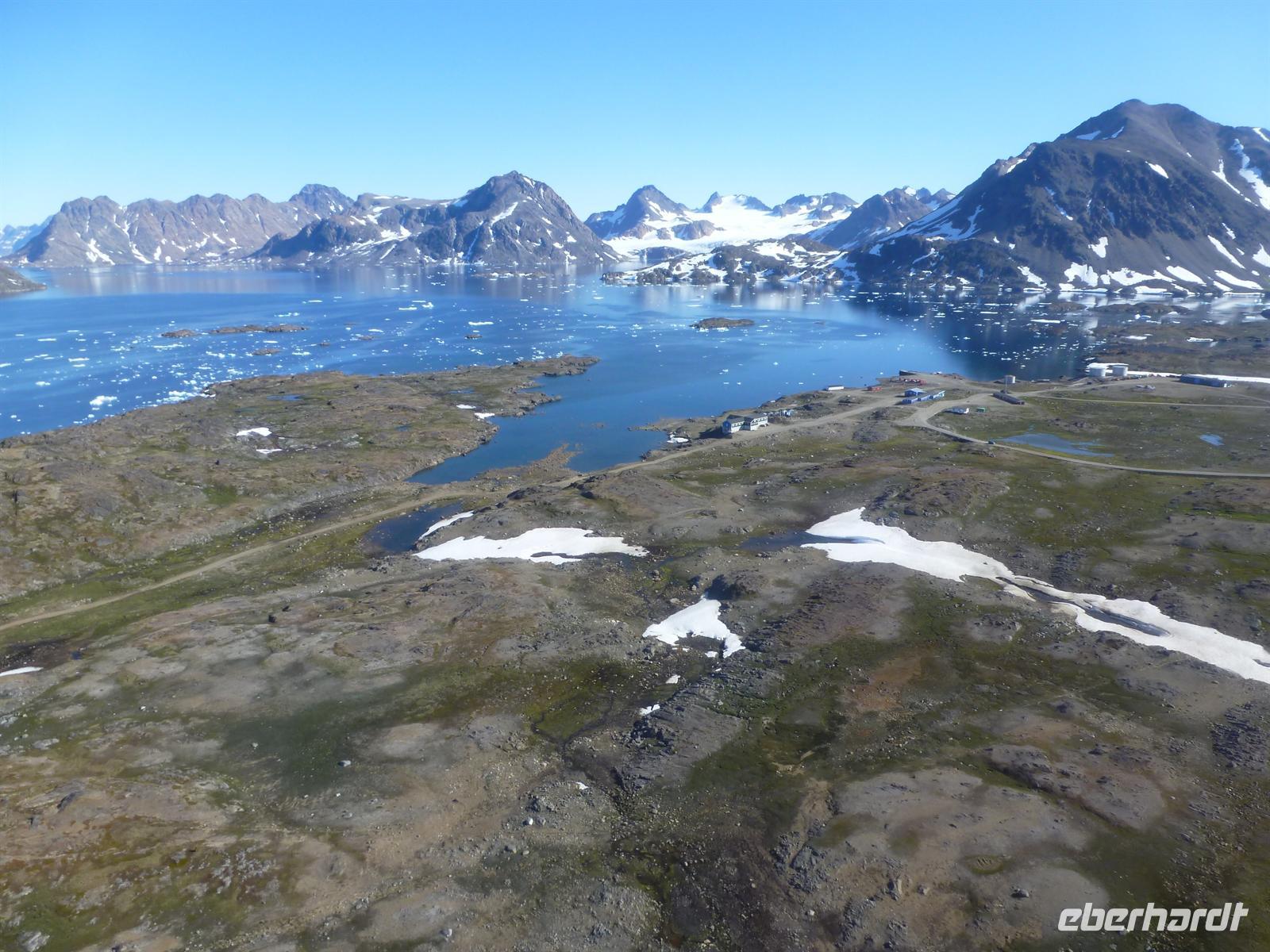 ab Kulusuk nach Tasilaq oder Ammassalik genannt. Es passen 9 Gäste in den Hubschrauber, deshalb haben wir die Gruppe geteilt. Der Flug war kurz aber unwahrscheinlich schön - bei klarem Sonnenschein flogen wir über Eisberge und Fjorde zu der größten Siedlung in Ostgrönland. Es ist ein Dorf mit knapp 3000 Einwohnern, malerisch an einem Fjord gelegen und wie wir bald bemerkten sehr hügelig. Wir wurden vom Hoteltransfer abgeholt und sind gleich los zu einem Spaziergang auf einen Berg, um die einmalige Aussicht auf die herumschwimmenden weißen Eisberge zu genießen. Nach dem Mittagessen im Hotel liefen wir runter zum Hafen. Dort gingen wir an Bord eines Bootes um raus zu den majestätischen Eisbergen zu fahren - ein absoluter Traum! Diese Giganten treiben ganz sanft im offenen Meer und wir konnten Sie im Sonnschein glitzern sehen und von allen Seiten aus betrachten! Einmalig…! Und nach der Bootstour der nächste große Höhepunkt. Fast alle Gäste buchten den Helikopterflug auf einen nahegelegenen Gletscher. Circa 15min flogen sie über diese einmalige Landschaft von Ammassalik, bevor sie auf dem Gletscher gelandet sind. Von dort aus genossen sie einen unbeschreiblich schönen Ausblick auf den mit Eisbergen bestückten Fjord, die Bergwelt mit seinen vielen Seen und sogar bis zum Inlandeis von Grönland. Nachdem alle die Stille hoch oben genossen haben ging es zurück nach Tasilaq. Das war für alle ein wunderbares Erlebnis. Noch ein leckeres Abendessen im Hotelrestaurant im Blick auf die Siedlung und den Kong Oscar Fjord und nachher ein gemütliches Ausklingen des Tages oder für einige noch ein Spaziergang durch den Ort oder hoch auf den Hausberg und dann ging unser aufregender Tag in Tasilaq zu Ende.