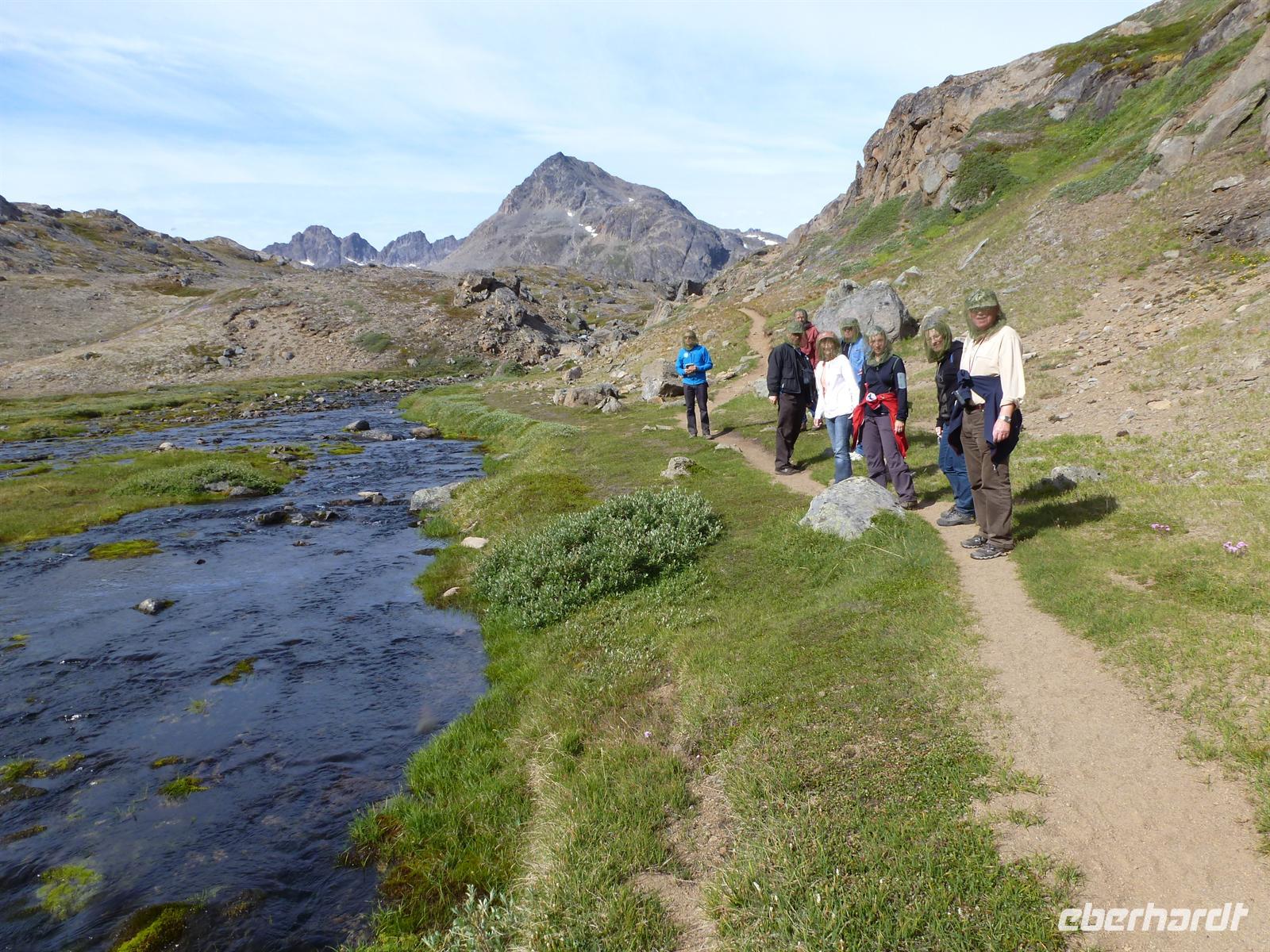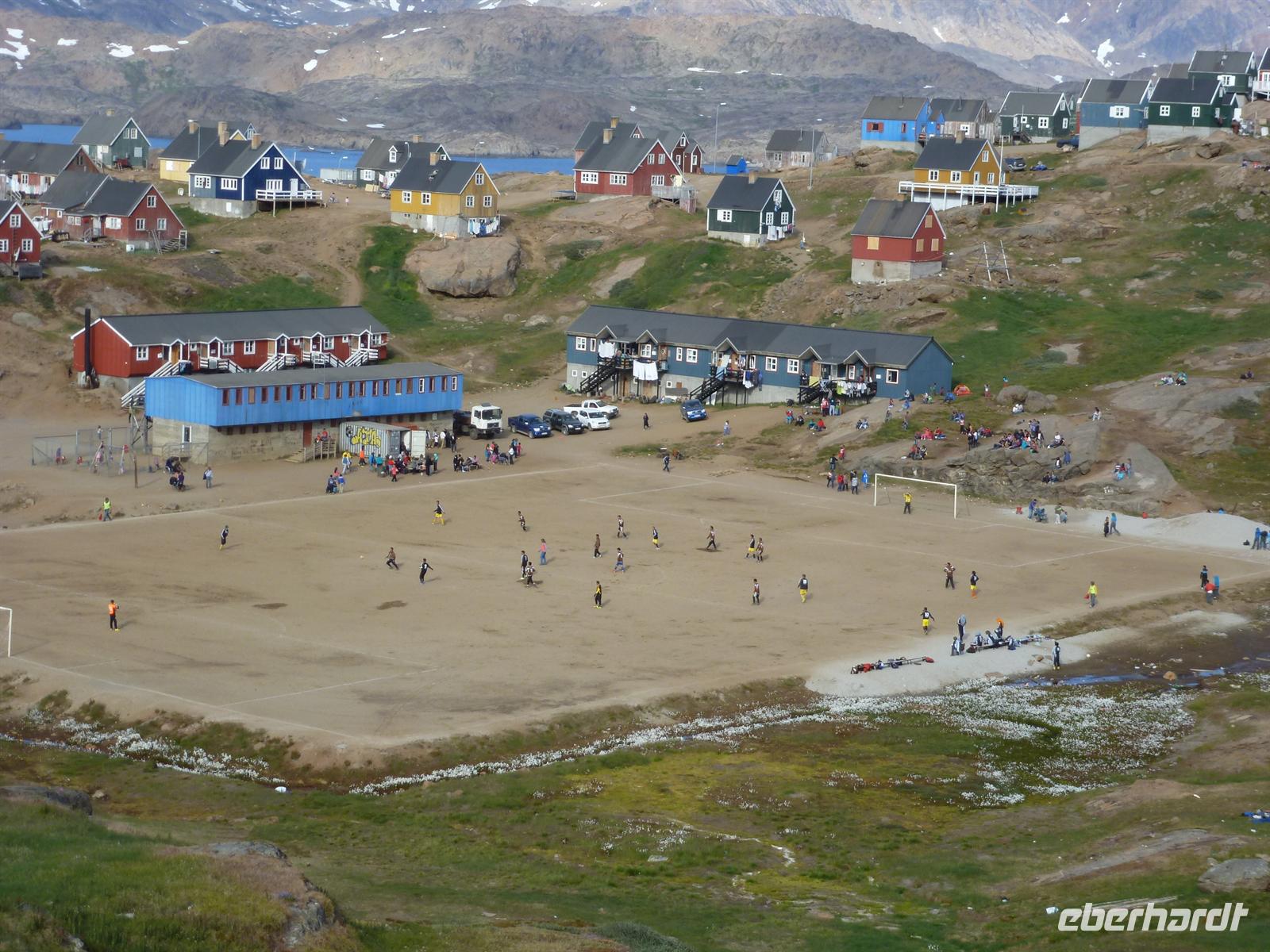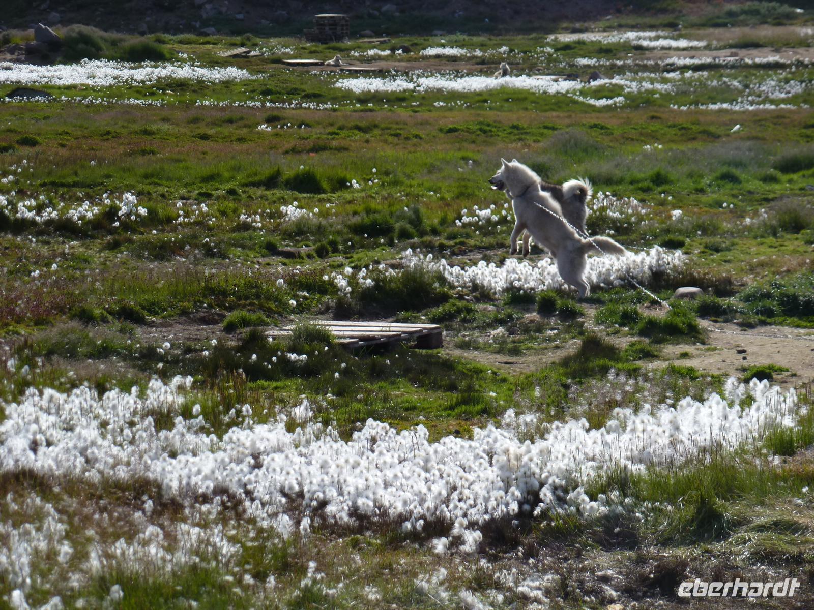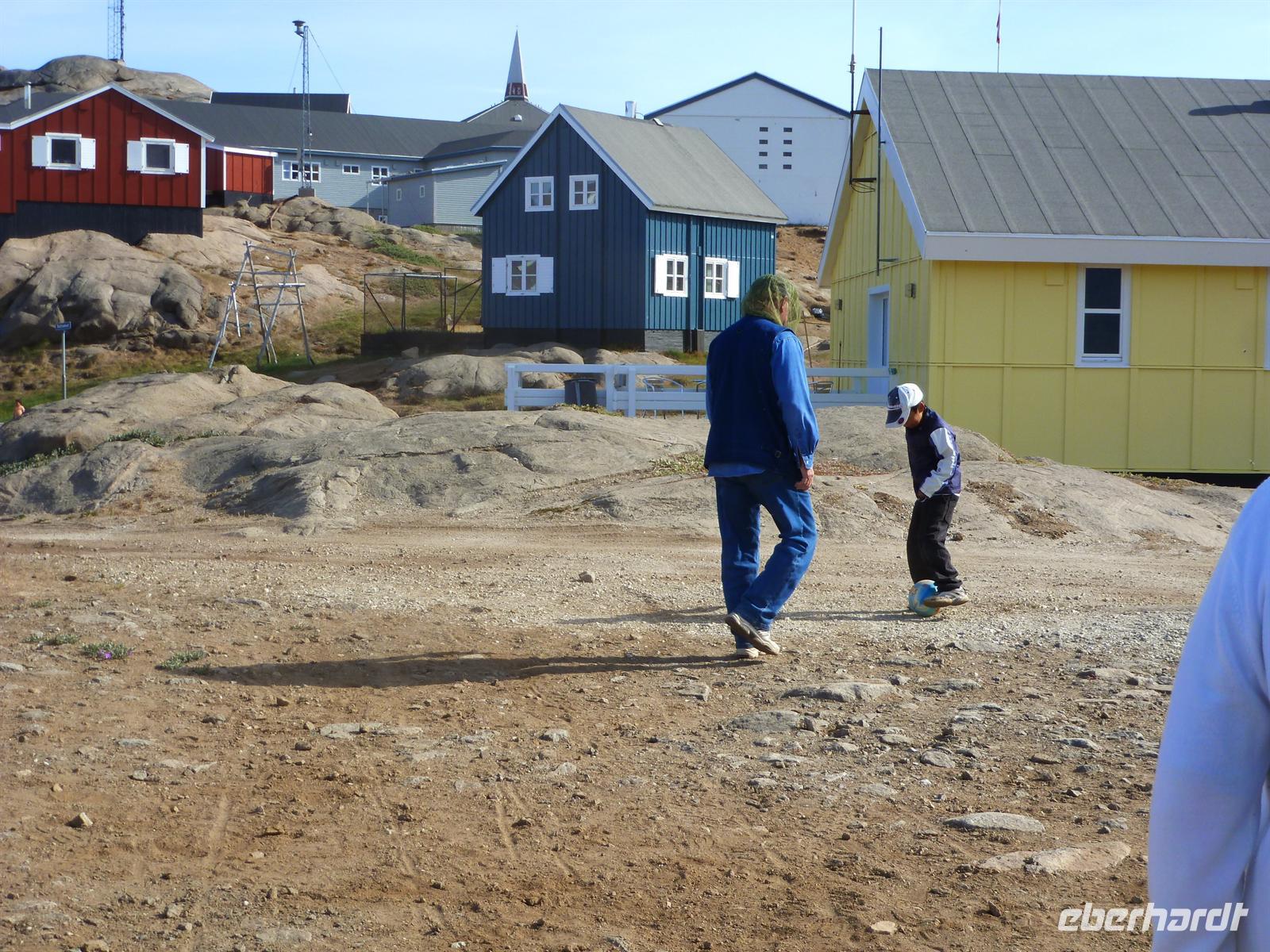 Heute starteten wir gegen neun Uhr zu unserem Spaziergang in das Tal der Blumen. Wir haben uns alle mit Mückennetzen über unsere Köpfe bewaffnet um den vielen kleinen Tierchen zu trotzen. Und ein Inuit begleitete uns, so dass wir während der Wanderung viel über das Leben der Bewohner Ostgrönlands erfuhren. Wir sahen einige Schlittenhunde, die im Sommer angeleint und im Winter als das wichtigste Fortbewegungsmittel für die Inuit dienen. Nach diesem gemütlichen Spaziergang aßen wir wieder im Hotel zu Mittag und nahmen uns danach ein bisschen Zeit zum entspannen und zum Füße hochlegen. Am Nachmittag spazierten wir runter ins Dorf und besuchten das wirklich interessante Heimatmuseum in der alten Kirche, den Supermarkt, die neue Kirche und dann spazierten wir noch ein wenig durch den Ort, um das Leben hier ein bisschen besser kennenzulernen. Schließlich ging es wieder zurück zum Hotel und am Abend haben wir das Fußballspiel zwischen den Siedlungen Kulusuk und Kungmit vom Hotelrestaurant aus beobachtet, das unten auf dem Dorffußballplatz stattgefunden hat.