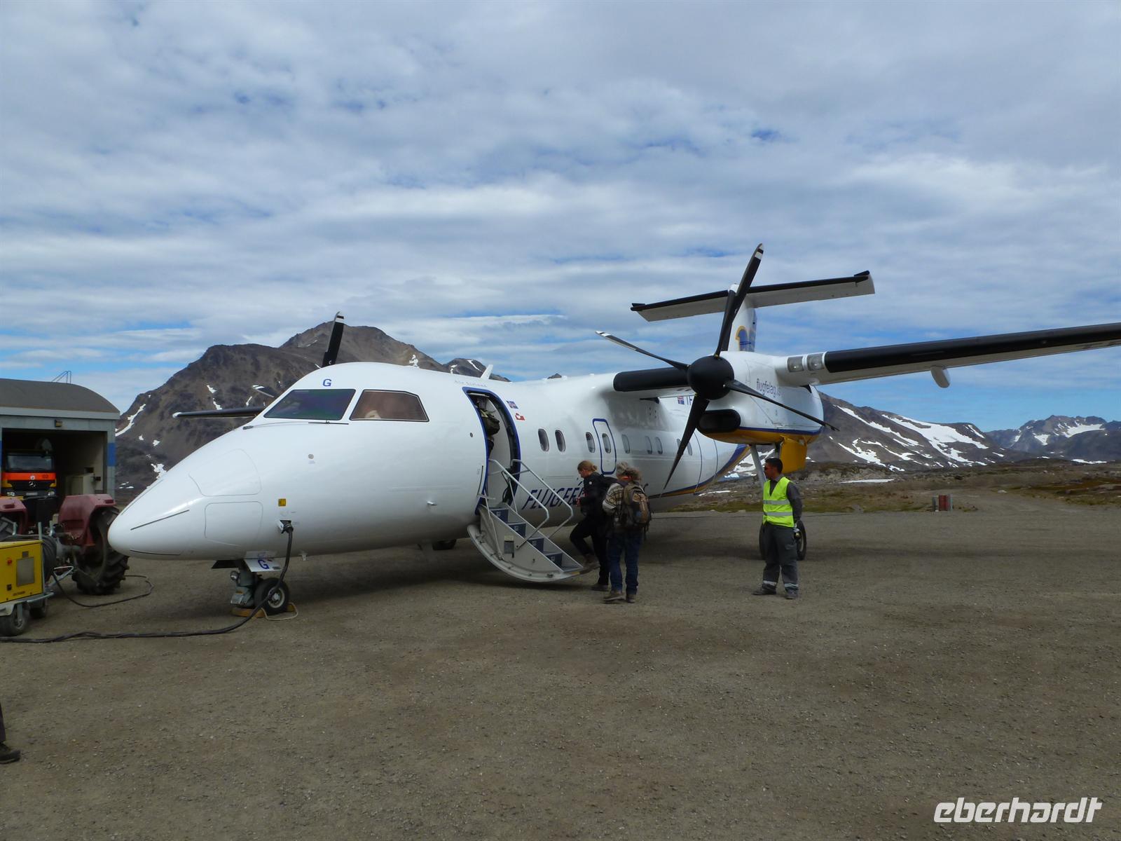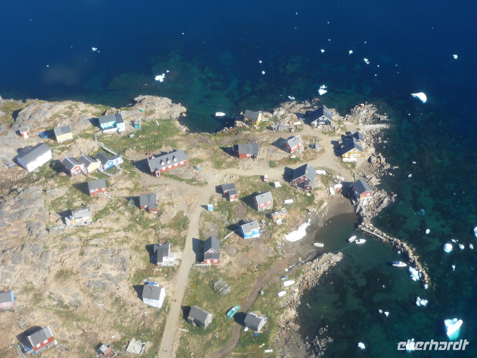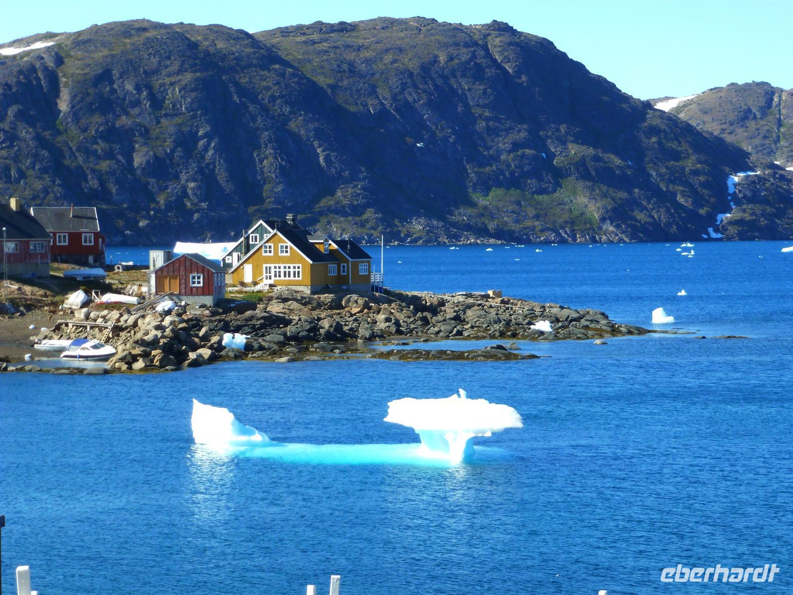 Heute war es soweit: Wir sind nach Grönland geflogen! Unser Grönland-Reiseleiter Hannes begrüßte und früh in unserem Hilton Hotel und wir fuhren gemeinsam zum Flughafen im Stadtzentrum von Reykjavik. Dort startete um 10:10 Uhr unsere 5-Sitzer Maschine nach Kulusuk im Osten Grönlands. Der Flug verlief super und kurz vor Grönland erblickten wir die schwimmenden Eisblöcke und das Packeis vor der Küste - es sah von oben traumhaft aus! Und weil wir blauen Himmel und strahlenden Sonnenschein hatten flog der Kapitän eine extra Runde über die Inseln vor dem Festland. So konnten wir die weißen Eisberg, welche zwischen diesen Inseln überall geschwommen sind, mit großen Augen bestaunen. So fing die Reise in das „Land der Menschen“, wir es bei den Inuit heißt, sehr gut an. Wir landeten in Kulusuk auf der Schotterlandepiste und wurden von einem Transfer ins naheliegende Hotel Kulusuk gebracht. Dieses liegt einen Kilometer neben der Landebahn und auf der Kulusuk umgeben von Fjorden und dem Ozean mit seinen Eisbergen - im Hintergrund Gletscher - es ist perfekt! Wir sind noch bevor wir unsere Zimmer bezogen haben über Schneefelder und Steinwüste runter zum Wasser und haben das schwimmende Eis im glasklaren Wasser bestaunt. Nach einem stärkenden Mittagessen im Hotel wurden wir mit einer Bootsfahrt zum Gletscher überrascht - für 1 ½ Stunde fuhren wir mit einem Inuit-Jungen zum Gletscher, mitten durch das schwimmende Eis! Durch die strahlende Sonne glitzerte alles und wir sahen das meterdicke Eis eines Gletschers, einen Seehund und einen sich drehenden Eisberg - ein wunderbares Erlebnis! Im Anschluss spazierten wir in die Inuit Siedlung Kulusuk mit seinen 300 Einwohnern.