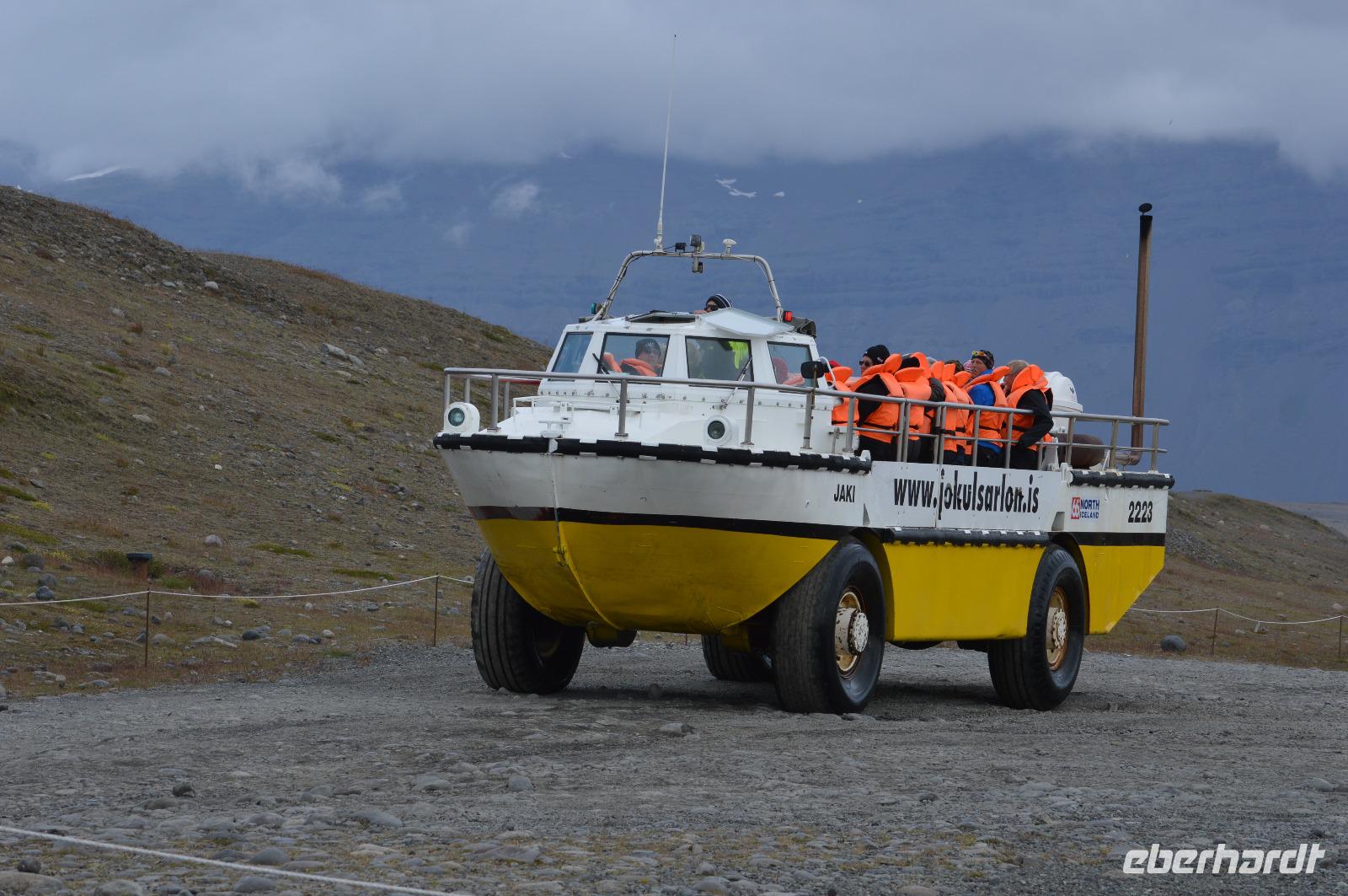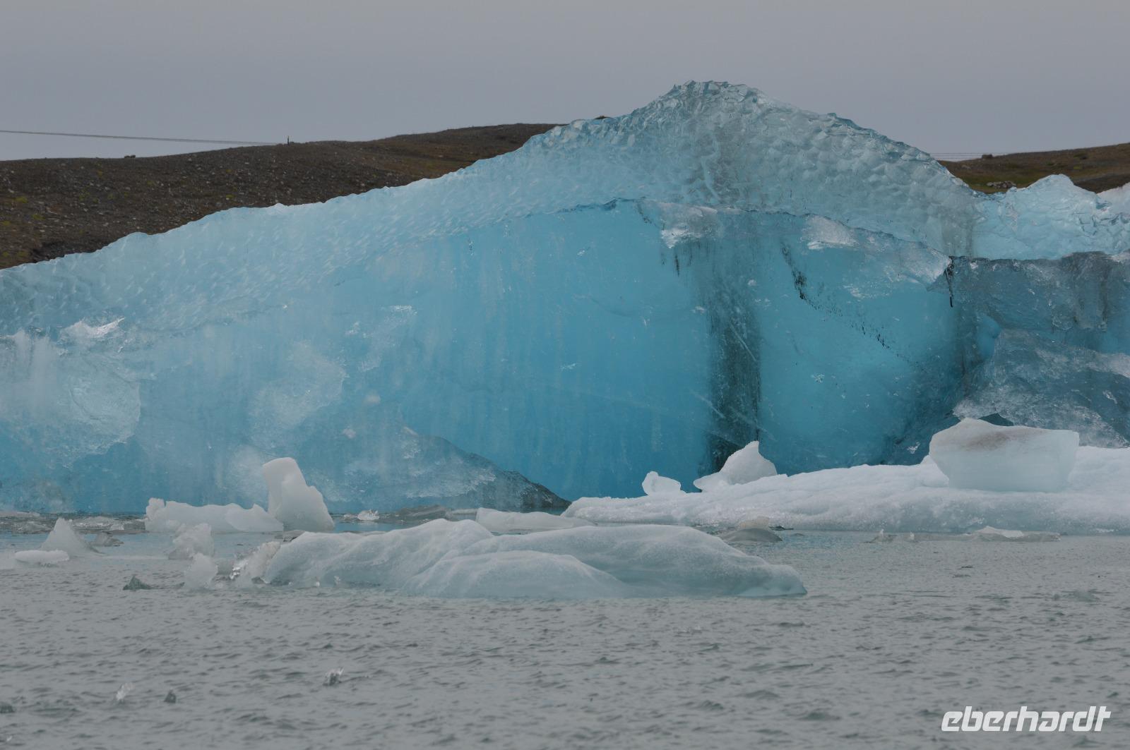 Heute steht die Glacier Lagune auf dem Programm. Auf dem Weg dorthin sehen wir endlich die ersten Sterntaucher auf einer Lagune direkt an der Straße und können gute Photos machen. Am Ausfluß der Lagune schwimmen kleinere Eisberge in der reißenden Strömung, werden ins Meer gewaschen. Dort ist auch ein sehr reges Vogelleben und die ersten Seehunde und Kegelrobben. Skuas sind da, ein großer Trupp Nonnengänse mit Jungen und eine große Brutkolonie der Küstenseeschwalbe, die wir lange beobachten können. An der Küste sind wieder Papageitaucher. Es sind sehr viele Touristen da. Wir fahren mit einem Amphicar in den See zwischen die Eisberge, sehr beeindruckend. Aber es geht besser: Nur wenige Kilometer entfernt vom Touristenrummel halten wir wieder in Svinafellsjökull und gehen dort ein kurzes Stück zu Fuß zur Glacier Lagune - und haben einen Traumblick auf die Abbruchkante, kommen direkt an die Eisberge heran. Der Punkt ist besser als der erste. Wir fahren weiter zum Nationalpark Skaftafell und gehen ins Informationszentrum. Jetzt fängt s an zu regnen Daher machen wir hier keine Wanderung sondern fahren direkt weiter Richtung Hotel, halten aber am Denkmal für den katastrophalen Gletscherfluß 1996 an sowie an den alten Grassodenhäusern und am Dwerghamrar mit seinen schönen Basaltsäulen. Wir sind heute ausnahmsweise einmal etwas früher im Hotel, was zum Entspannen genutzt wird.