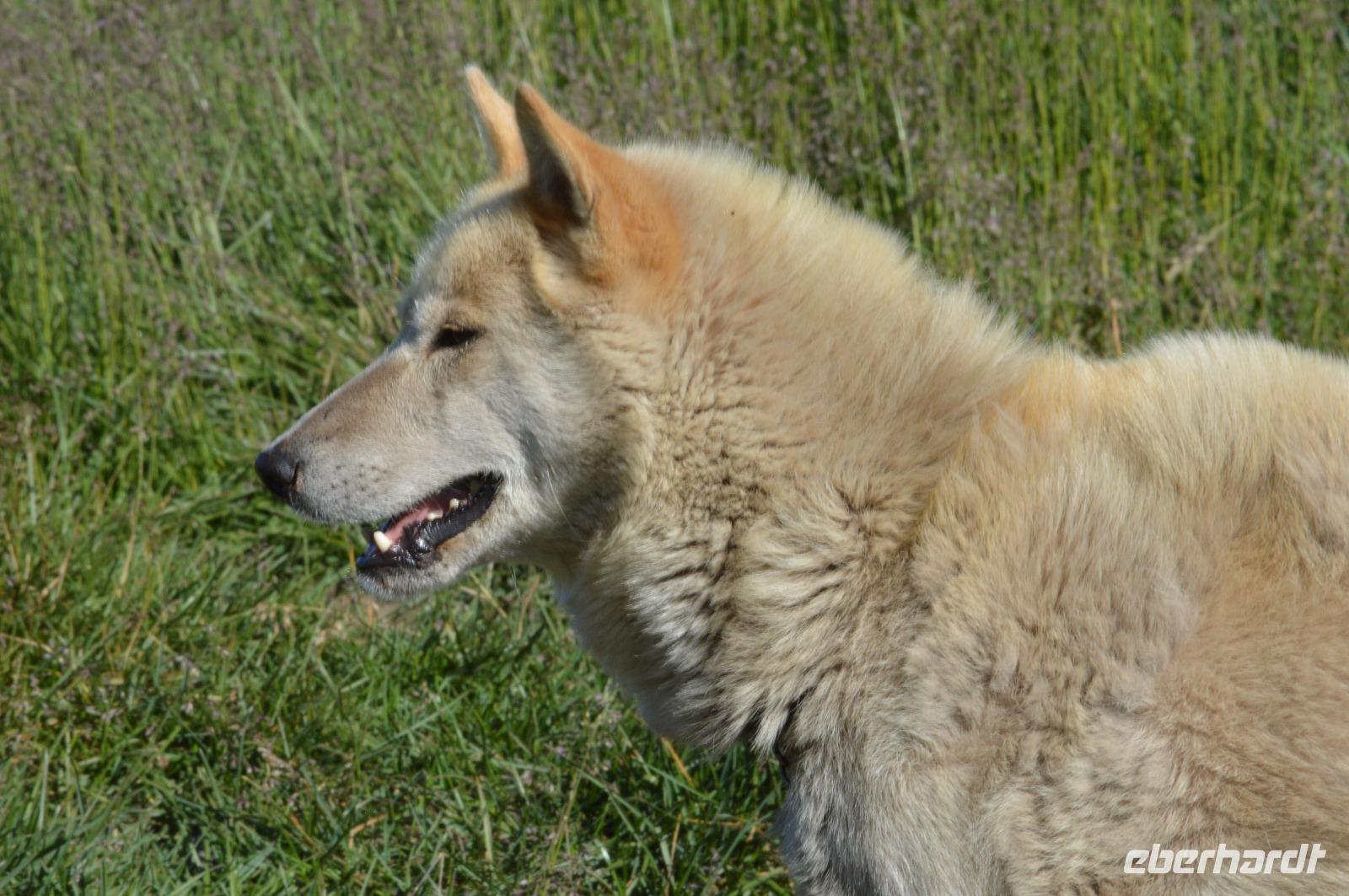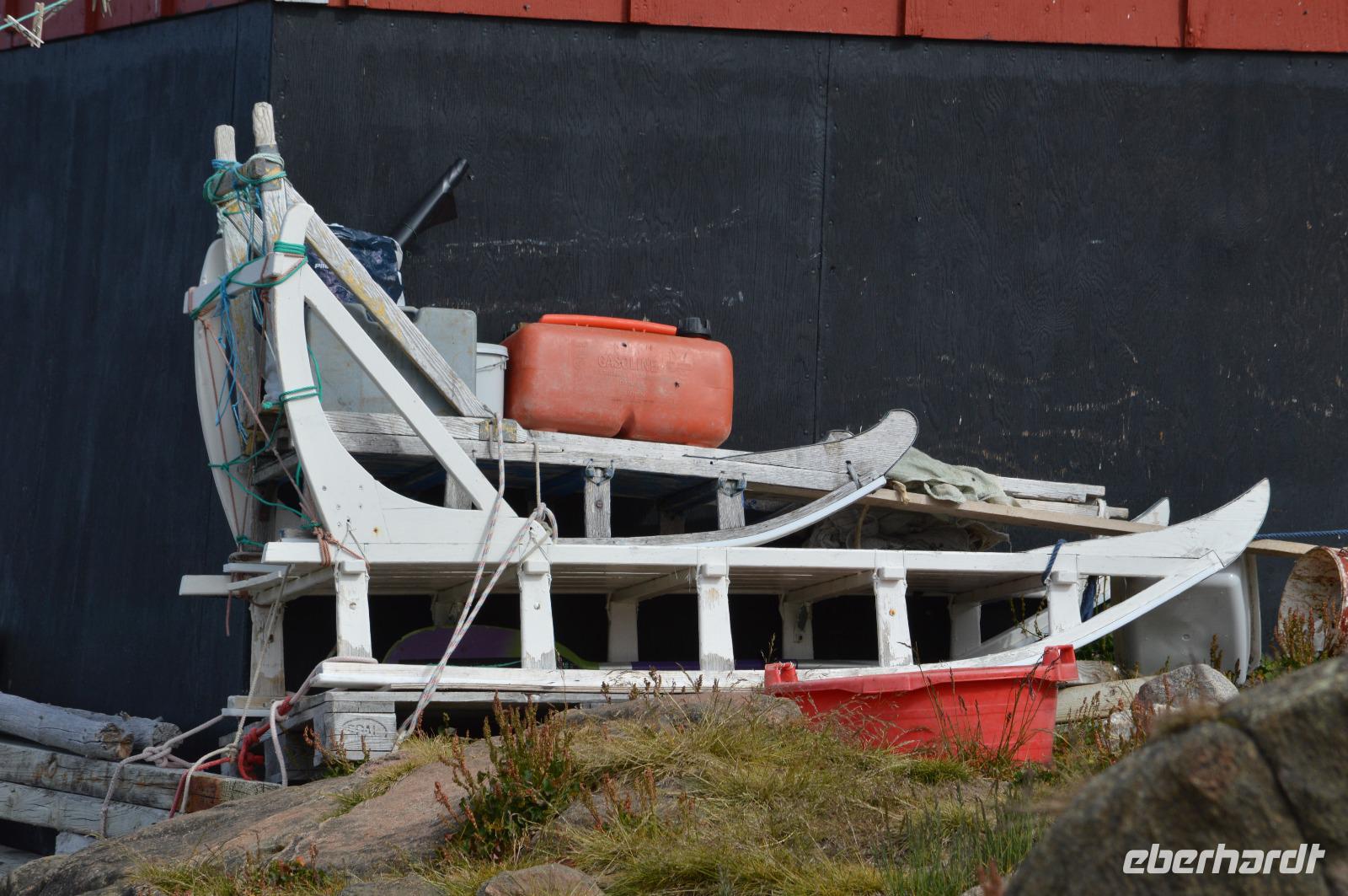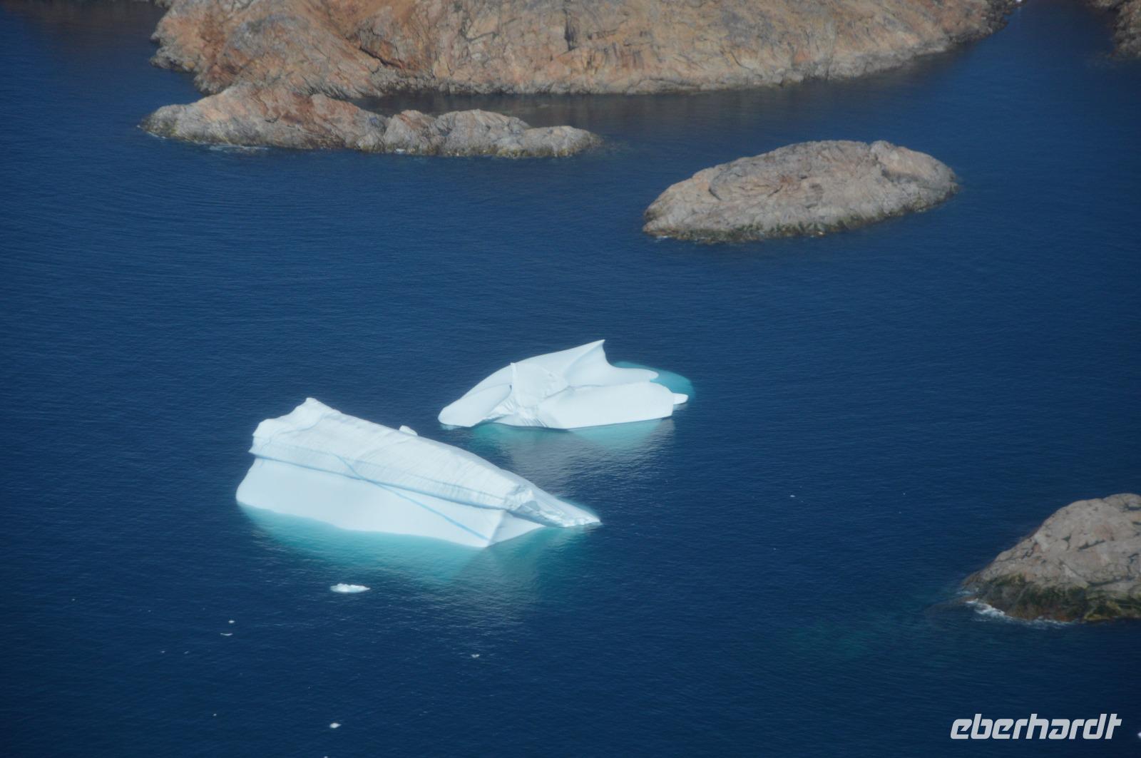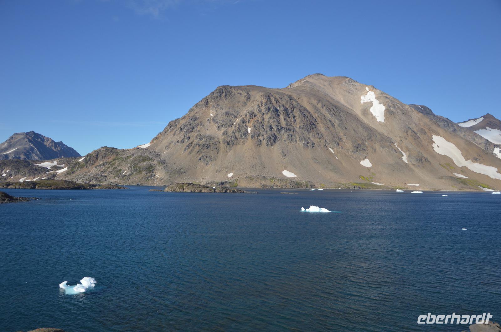 Wir verlassen das Hotel und fahren gegen 10.00 zum Heliport, fliegen dann in zwei Gruppen nach Kulusuk. Da das Wetter wieder sehr schön ist, sonnig, keine Wolken, erlaubt der Flug erneut tolle Ausblicke in die grönländische Landschaft und sogar in die Ferne aufs Inlandeis. Nach der Landung geht es sofort ins Hotel und zum Lunch. Danach erfolgt der Transfer per Bus ins Dorf, wo uns Anta Kuize erwartet, ein ca. 65-jähriger Inuit, der uns vor traumhafter Kulisse vor dem Gletscher Trommeltänze zeigt. Das war nicht im Programm, war aber an der Stelle und dem Ort einfach ideal. Die Kosten dafür hielten sich auch absolut im Rahmen. Nach der auch mimisch unglaublich guten Vorstellung durch Anta gingen wir zunächst in die Kirche und dann durch das Dorf mit seinen vielen Schlittenhunden. Anta kam uns in die Kirche nach und gab da noch ein kleines Harmoniumkonzert zum Besten. Kulusuk ist deutlich anders als Tasiilaq, einfacher. An der Hafenmole hingen geschossene Seehunde und es gab Reste eines erlegten Grindwals. Das wird alles gegessen bzw. die Reste an die Schlittenhunde verfüttert. Zurückgelaufen zum Hotel beschlossen 8 Pax mit Hannes und mir noch zum Fjord zu gehen, zwei Stunden hin und zurück quer durch die trockene Tundra. Das war der 2. Höhepunkt des Tages, denn der Fjord war voller größerer Eisberge, die wie von Künstlern gestaltet schienen.