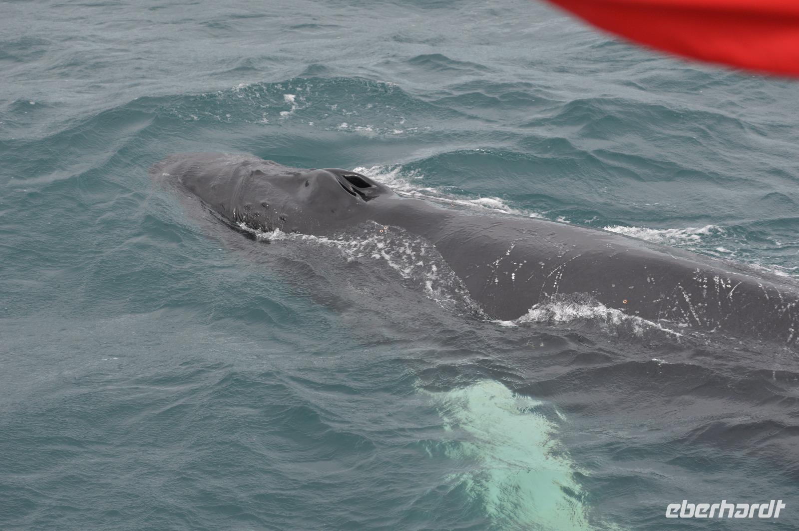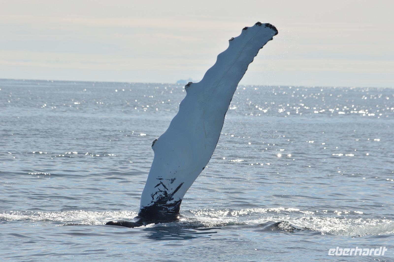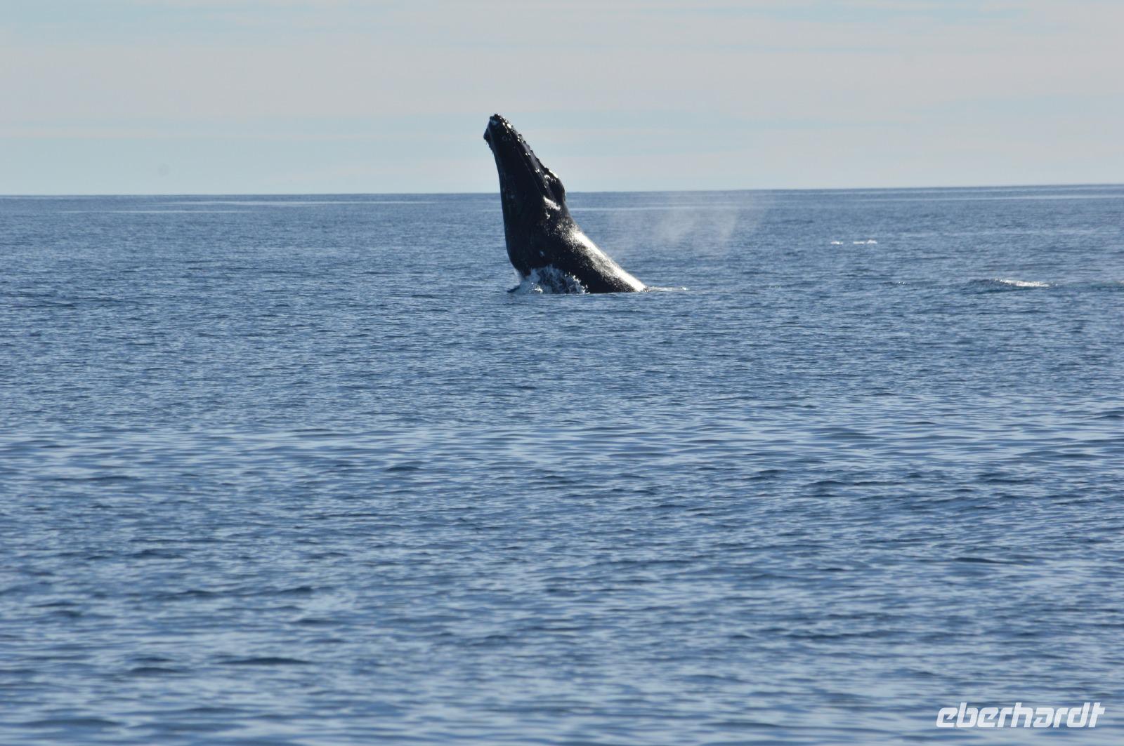 Nach dem Frühstück bringt uns der Hotelshuttle zu einem kleinen Boot, mit dem wir aus dem Fjord rausfahren zu den gigantischen Eisbergen vor dem Fjord - dachten wir! Die Eisberge waren beeindruckend und auch das Farbenspiel in Blau- und Weißtönen. Nachdem uns dann schon die ersten arktischen Vögel wie Polarmöwe, Elfenbeinmöwe und Tordalk begrüßten, kam plötzlich der Ruf „Wal" - und dann wurde es spannend: Ein Finnwal mit Jungtier war zu sehen, zwar auf größere Distanz, aber eindeutig. Die beiden Wale verschwanden nach einigen Minuten - und dann waren da plötzlich Minkwale, die auch rasch verschwanden und den Platz für die Hauptakteure frei machten Ein Gruppe Buckelwale, die vor und am Schiff (!) ihre Paarungsvorspiele zeigten. Es war unglaublich, wie ein Wal immer wieder aus dem Wasser sprang, mit der Fluke peitschte, sich seitlich präsentierte, die Flossen zeigte - und dann kam seine Angebetete und die beiden schwammen nebeneinander dicht neben und vor dem Schiff. Das war DIE Sternstunde überhaupt und wir sind natürlich lange draußen geblieben und haben uns dieses Schauspiel nicht entgehen lassen. Die gigantischen Eisberge degradierten zu Statisten für den guten Hintergrund auf den Bildern mit den tobenden Buckelwalen. So etwas zu sehen und dann noch bei „Kaiserwetter", das hat man wirklich nur einmal im Leben! Auch der Studienreiseleiter was hin und weg.