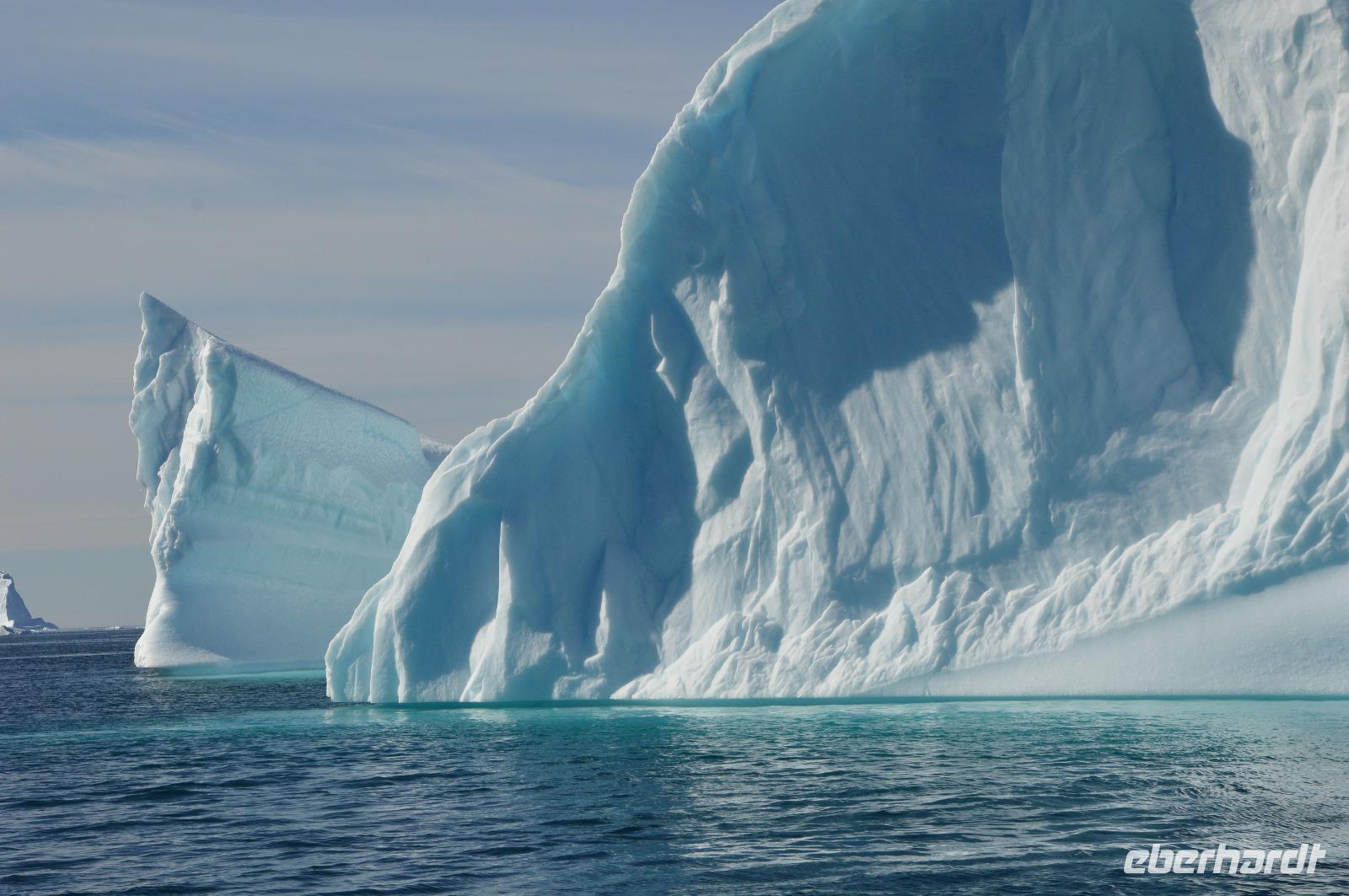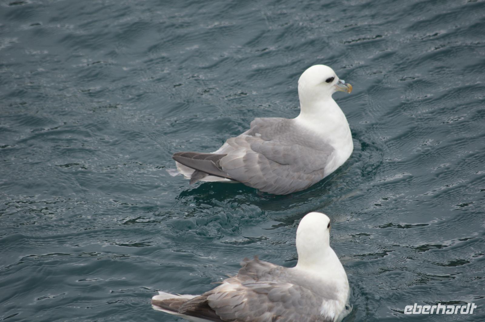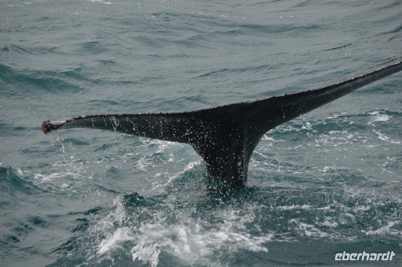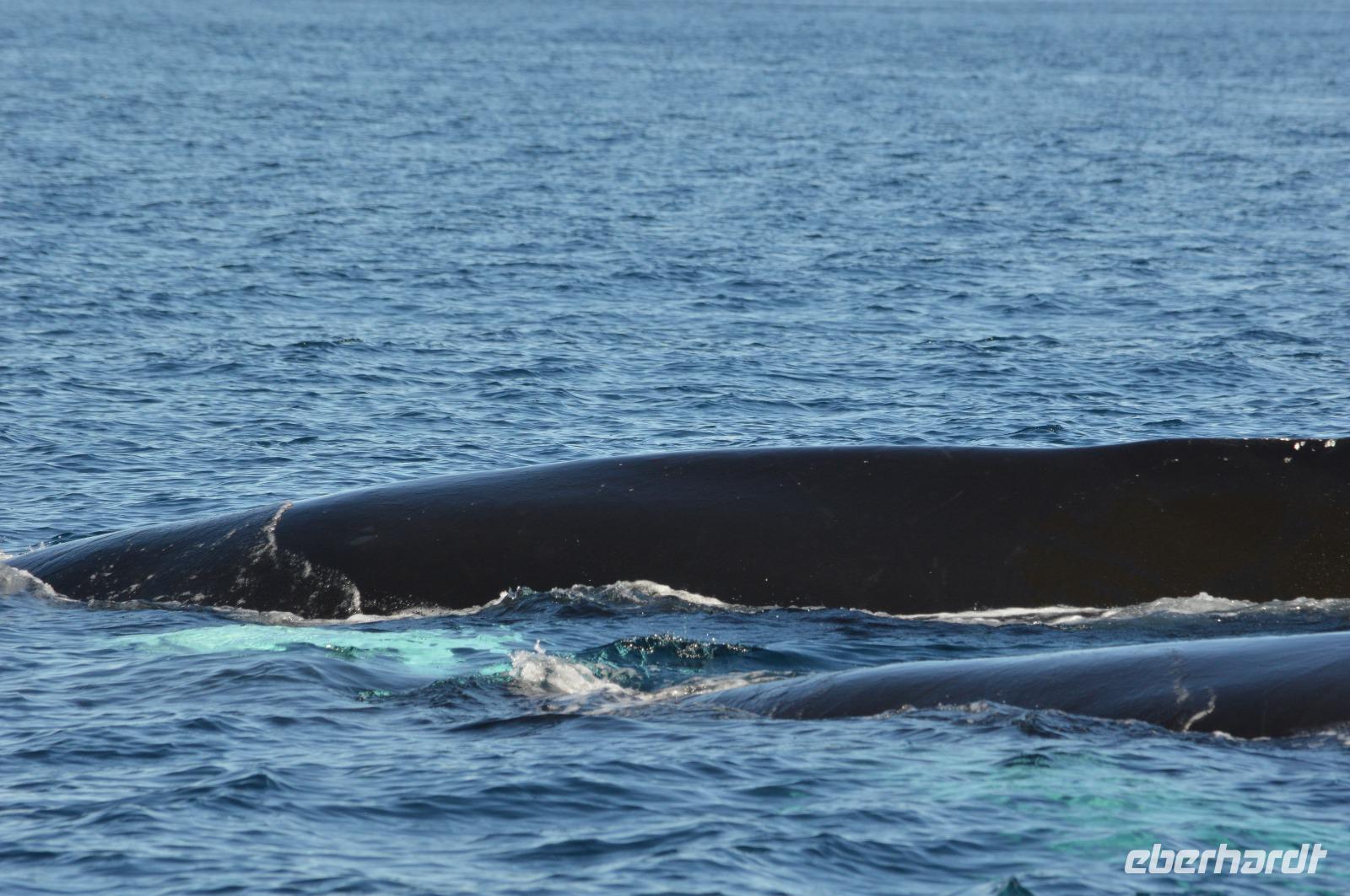 Nach dem Frühstück bringt uns der Hotelshuttle zu einem kleinen Boot, mit dem wir aus dem Fjord rausfahren zu den gigantischen Eisbergen vor dem Fjord - dachten wir! Die Eisberge waren beeindruckend und auch das Farbenspiel in Blau- und Weißtönen. Nachdem uns dann schon die ersten arktischen Vögel wie Polarmöwe, Elfenbeinmöwe und Tordalk begrüßten, kam plötzlich der Ruf „Wal" - und dann wurde es spannend: Ein Finnwal mit Jungtier war zu sehen, zwar auf größere Distanz, aber eindeutig. Die beiden Wale verschwanden nach einigen Minuten - und dann waren da plötzlich Minkwale, die auch rasch verschwanden und den Platz für die Hauptakteure frei machten Ein Gruppe Buckelwale, die vor und am Schiff (!) ihre Paarungsvorspiele zeigten. Es war unglaublich, wie ein Wal immer wieder aus dem Wasser sprang, mit der Fluke peitschte, sich seitlich präsentierte, die Flossen zeigte - und dann kam seine Angebetete und die beiden schwammen nebeneinander dicht neben und vor dem Schiff. Das war DIE Sternstunde überhaupt und wir sind natürlich lange draußen geblieben und haben uns dieses Schauspiel nicht entgehen lassen. Die gigantischen Eisberge degradierten zu Statisten für den guten Hintergrund auf den Bildern mit den tobenden Buckelwalen. So etwas zu sehen und dann noch bei „Kaiserwetter", das hat man wirklich nur einmal im Leben! Auch der Studienreiseleiter was hin und weg.