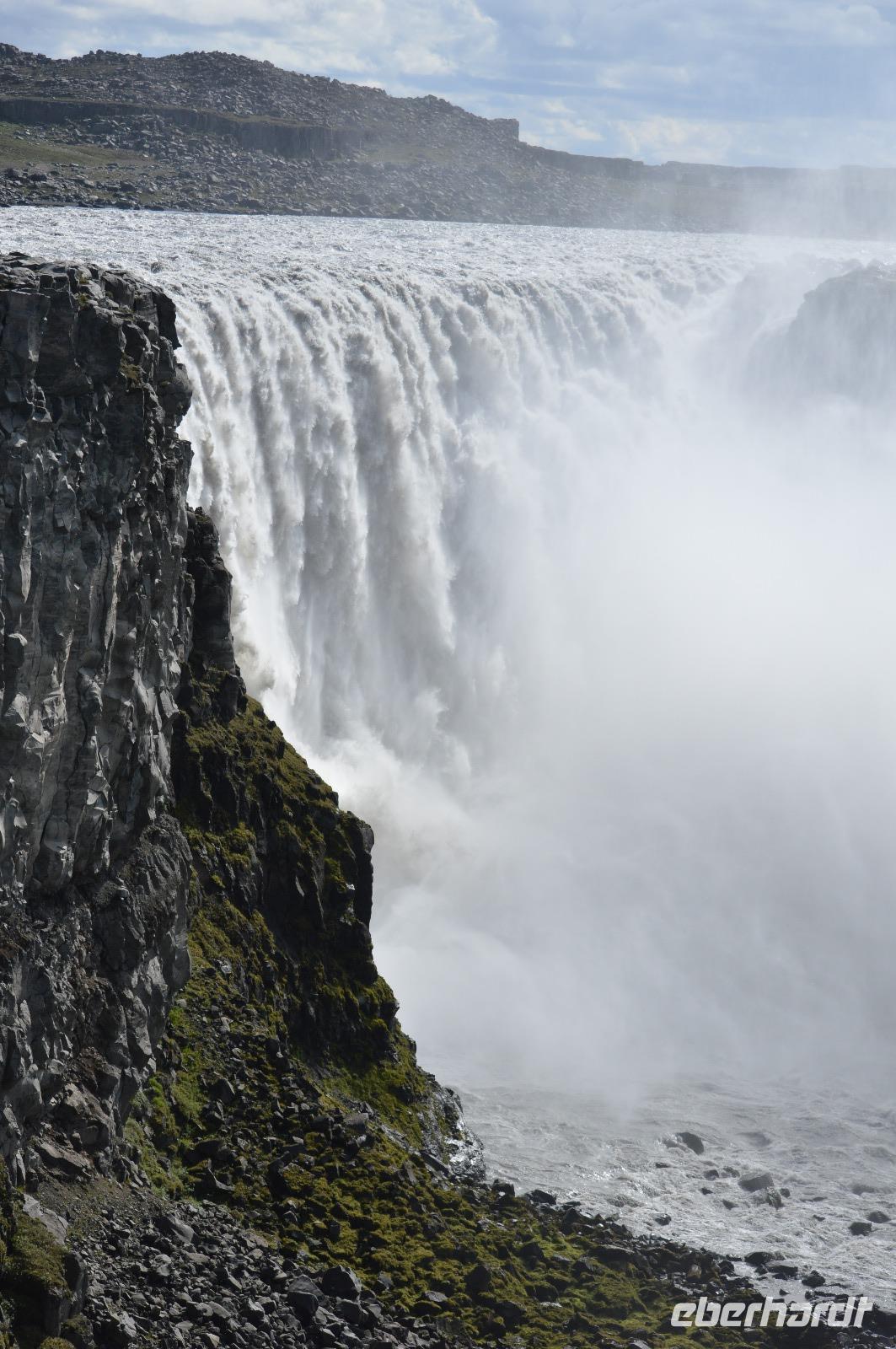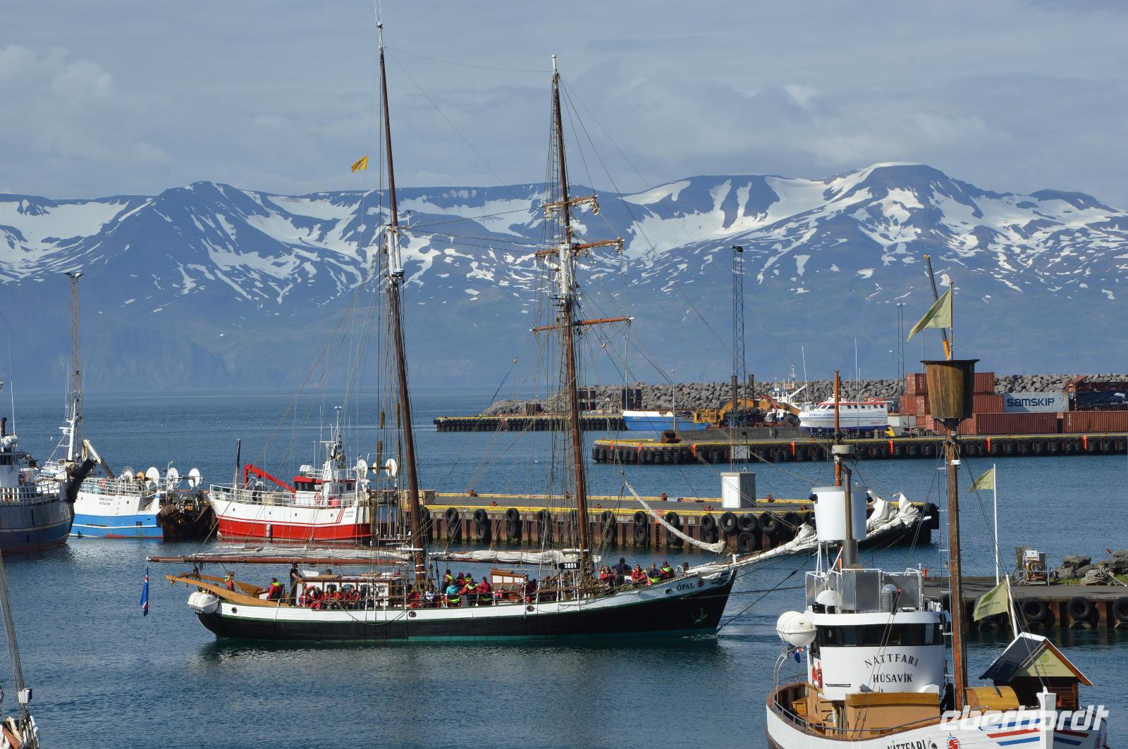 Bei wieder sonnigem Wetter und klarer Sicht fahren wir in das Fischerdorf Husavik, welches sehr malerisch liegt. Als erstes gehen wir alle in das Walmuseum Dies ist klein, aber sehr gut gemacht. Nach einem intensiven Rundgang im Museum besuchen wir die Kirche und gehen dann zu einem Aussichtspunkt über dem Hafen. Die Fahrt führt uns dann an die Spitze der Tjörneshalbinsel, wo wir in einer Steilwand die ersten Papageitaucher sehen. Gut 150 Tiere sitzen in der Felswand oder auf dem Wasser. Dazu Schmarotzerraubmöwen, Eissturmvögel und Dreizehenmöwen, also die „klassische" Vogelgesellschaft an arktischen Steilküsten. Weiter geht es nach Asbyrge, wo wir eine kurze aber ergiebige Wanderung zum See machen. Rotdrosseln, Spatel- und Pfeifenten sind gut zu beobachten im See an der bizarren Lavawand. Nach der Mittagspause geht es über Schotterpisten zum Dettifoss. Durch das warme Wetter hat er von den Gletschern sehr viel Wasser bekommen und donnert gewaltig über die Klippen. Wir gehen fast alle bis zur Kante vor: Ein gewaltiger Eindruck. Danach fahren wir über teils sehr schlechte Pisten weiter. Der Tafelvulkan Herdubreid ist sehr gut zu sehen. Es wird klar, warum die Götterburg Asgard dort verortet sein soll. Nach einem Kaffeestop in Mödrudaldur fahren wir direkt zum Hotel in wunderschöner Lage: Ein anstrengender, aber sehr schöner Tag geht zu Ende.