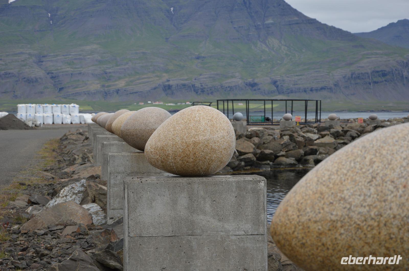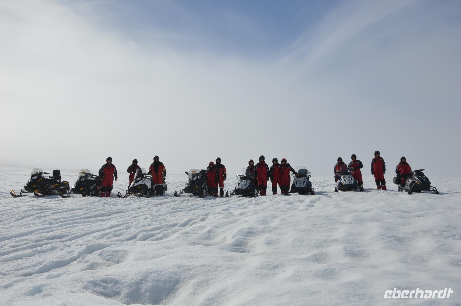 Es geht zur Ostküste und ihren Fjorden. Während es am Hotel noch sonnig ist, bedeckt sich der Himmel an den Ostfjorden rasch. Die Fahrt ist spektakulär sowohl was die Landschaft als auch die Botanik und die Vögel anbelangt. Ein Photostop führt uns mit kurzem Weg an einen wunderschönen aber namenlosen Wasserfall am Fluß Fossa. Kurzschnabel-gänse mit Jungen, wieder Möwen und Alken sind immer wieder zu sehen und die schönen hellblauen Glockenblumen blühen überall. An einem der seltenen Ignimbrit Vorkommen halten wir natürlich auch an. An einem anderen Punkt haben wir neben der tollen Landschaft Gryllteisten direkt vor der Kamera posierend. Lunch machen wir im Örtchen Djuoivogur, wo wir auch die eigenartige Installation von riesigen steinernen Vogeleiern besichtigen. Dann kommt der Höhepunkt des Tages: Wir fahren mit einem Jeep auf den Vatnajökull, erhalten oben am Gletscher unsere Ausrüstung und dann geht es mit insgesamt 7 Skidoos auf den Gletscher - einfach ein tolles Erlebnis für alle. Buchmanns haben als Überraschung den Gletschertrunk mitgebracht Mit dem Jeep geht es retour zum Bus und weiter zum Hotel entlang der Südküste mit traumhafter Kulisse. Unterwegs sehen wir noch eine wirklich sehr große Mauserversammlung von Singschwänen: Es müssen einige Hundert gewesen sein.