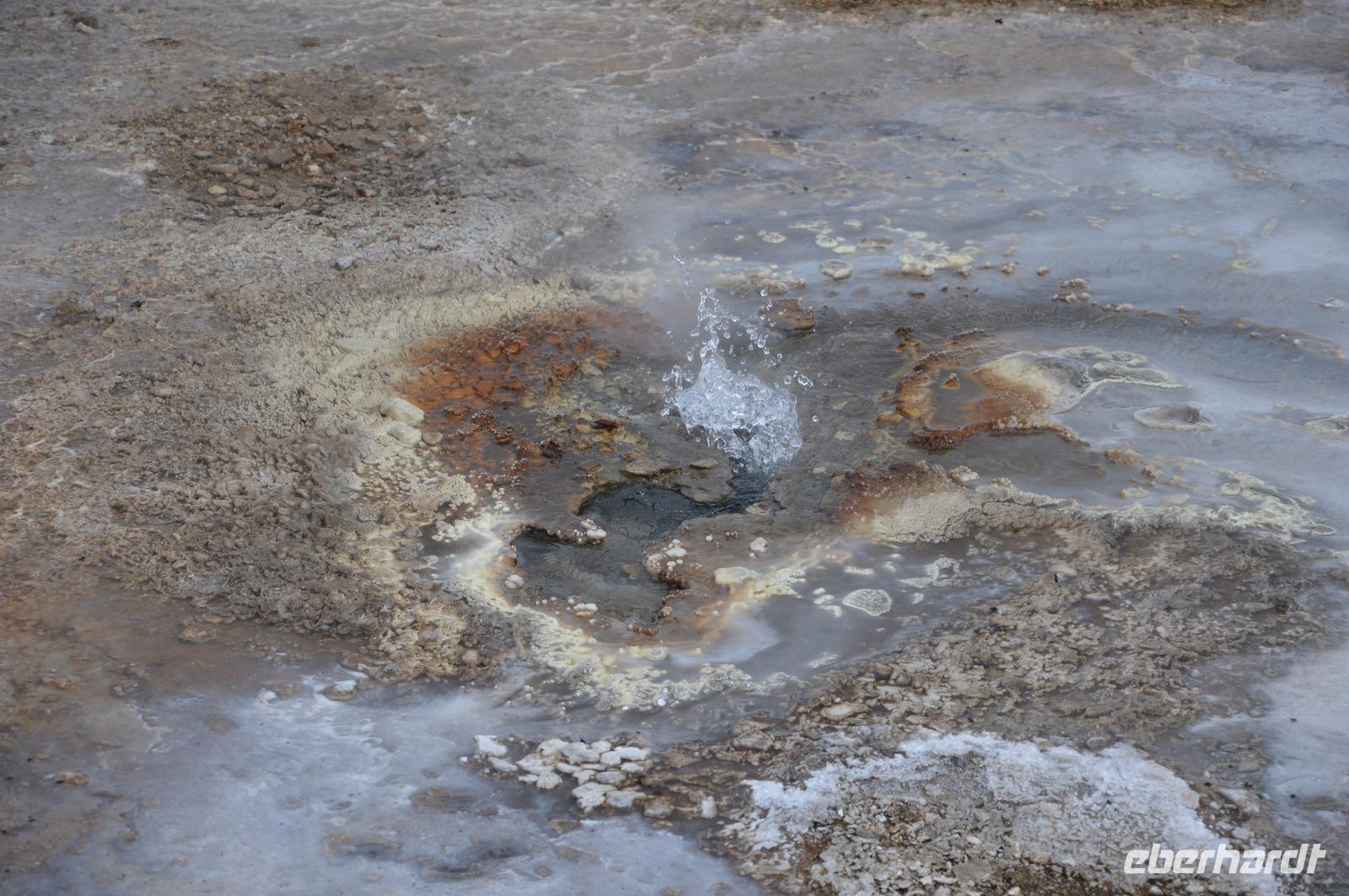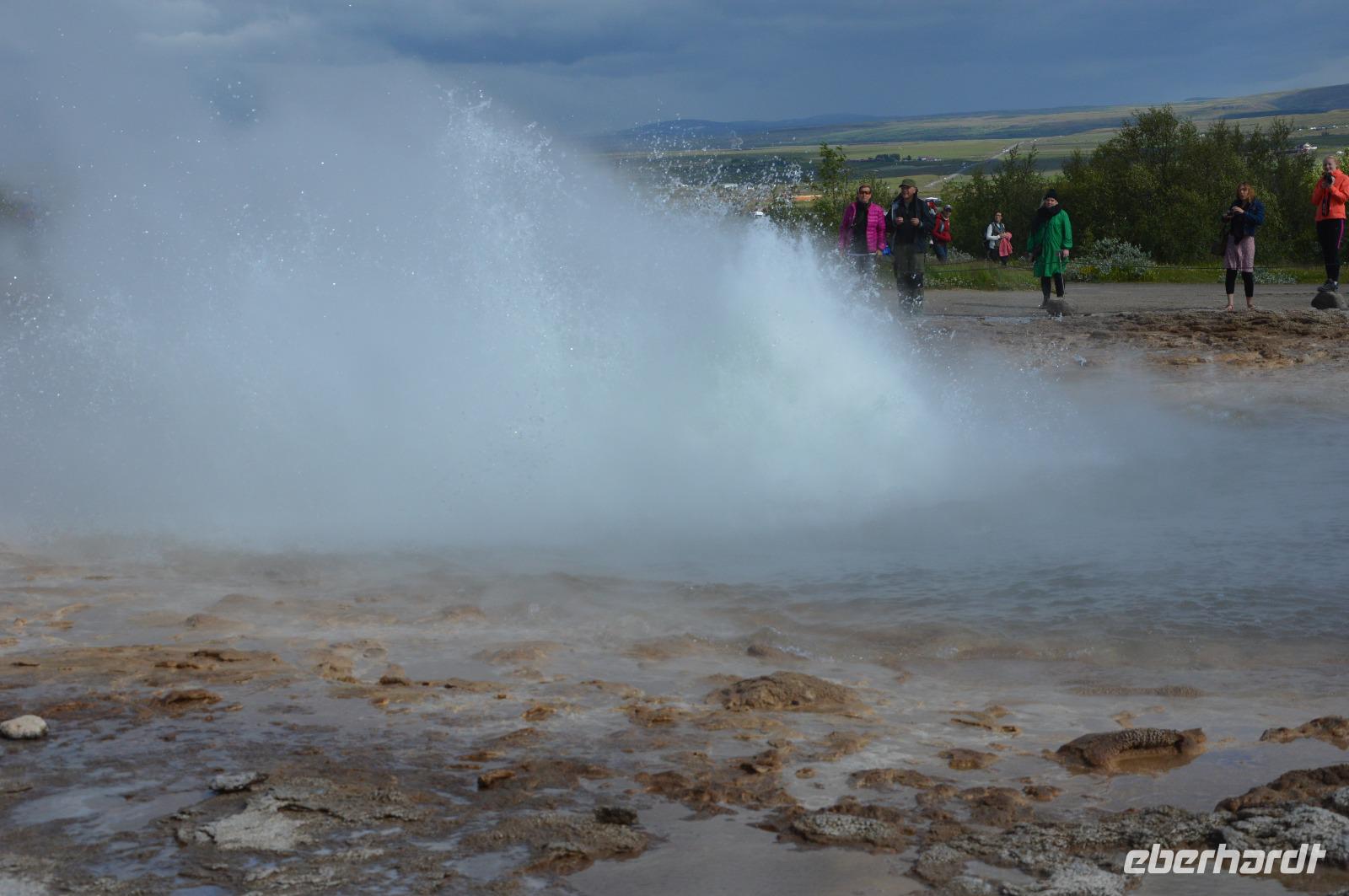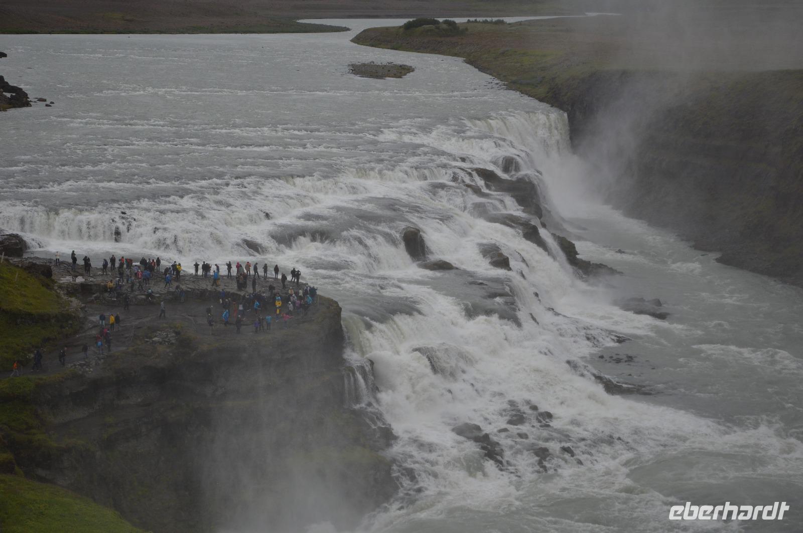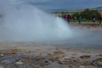 Heute geht es mit dem Bus in Richtung „Goldener Kreis". Aber zuerst fahren wir zu einem Geothermalkraftwerk. Von einem Aussichtspunkt aus hat man einen beeindruckenden Blick auf die Anlage, die Leitungen und Bohrlöcher. Die Geothermie versorgt in Island viele Siedlungen. Danach geht es weiter nach Thingvellir, dem alten Thing-Ort. Er liegt mitten im Spreizungsgebiet. Die Spaltenstruktur kann man sehr gut sehen. Ein kurzer Abstecher zur Silfraspalte zeigt überdeutlich, wie das Terrain auch touristisch genutzt wird. Dort sehen wir auch die ersten Odinshühnchen. Die Fahrt führt uns dann weiter zum Gullfoss, dessen Sprühwolke man schon von weitem sieht. Der Wasserfall ist beeindruckend. Negativ beeindruckend ist aber auch die Masse der Touristen, welche sich hier befindet. Wir machen hier eine kurze Mittagspause und fahren dann zum Geysirfeld, wo der Geysir Strokkur in kurzen Abständen seine Fontänen hoch schießt. Schön zu sehen sind dort die Ablagerungen der Archäbakterien. Danach schieben wir noch zwei weitere Stops ein, einmal am Faxa Fall und dann an der alten Bischofskirche von Skaltholt, die wir besichtigen. Dann ging es ins Hotel.