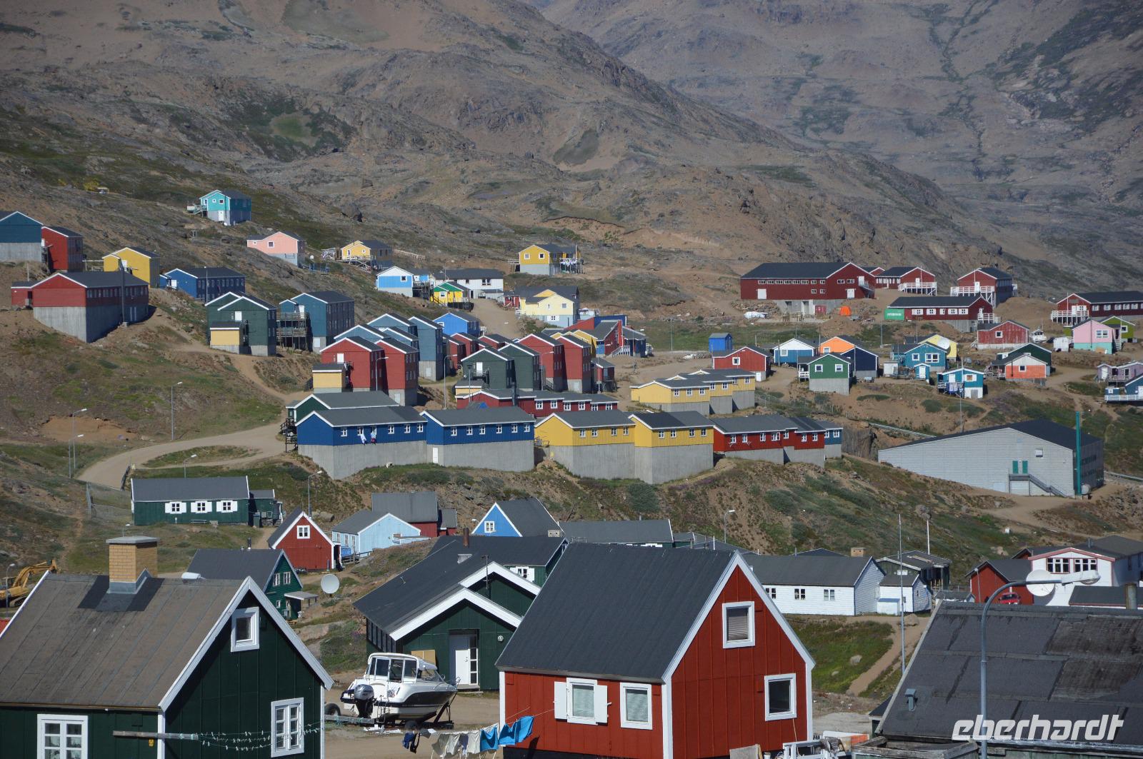 Grönland wartet. Wir reisen jetzt mit leichtem Gepäck. Das große Gepäck bleibt im Hotel in Reykjavik: In Grönland fliegen wir mit Hubschrauber weiter und da paßt nicht viel Gepäck rein! Bei Regen fliegen wir in Island ab. Auf halber Strecke reißt es auf und Grönland präsentiert sich schon beim Anflug in schönstem Sonnenschein. Eisberge sind zu sehen. Nach der Landung auf der Schotterpiste in Kulusuk steigen wir um in den Hubschrauber, der uns nach Tasiilaq bringt. Da das Wetter einfach nur grandios ist, gehen wir nach dem ausgezeichneten Mittagessen zu Fuß ins Tal der Blumen, welches seinem Namen gerecht wird: Es blüht wirklich sehr schön. Allerdings ist ohne Mückennetze hier nichts zu machen: Die Plagegeister sind in großen Mengen da. Wir laufen bis zum 3. See, haben sehr schöne Ausblicke in die Landschaft. Die Hälfte der Gruppe geht mit Hannes noch weiter, ich gehe mit dem Rest langsam retour ins Dorf. Unterwegs sind wir, natürlich, bei den Schlittenhunden und deren Welpen, stehen geblieben. Wir besuchen noch die neue Kirche im Dorf. Im Dorf findet die lokale Meisterschaft im Fußball statt. Vom Balkon unseres Hotels haben wir quasi Logenplätze und schauen zu.