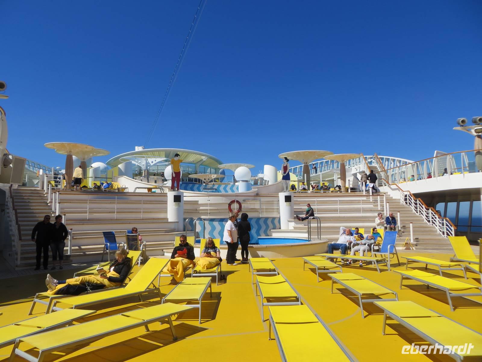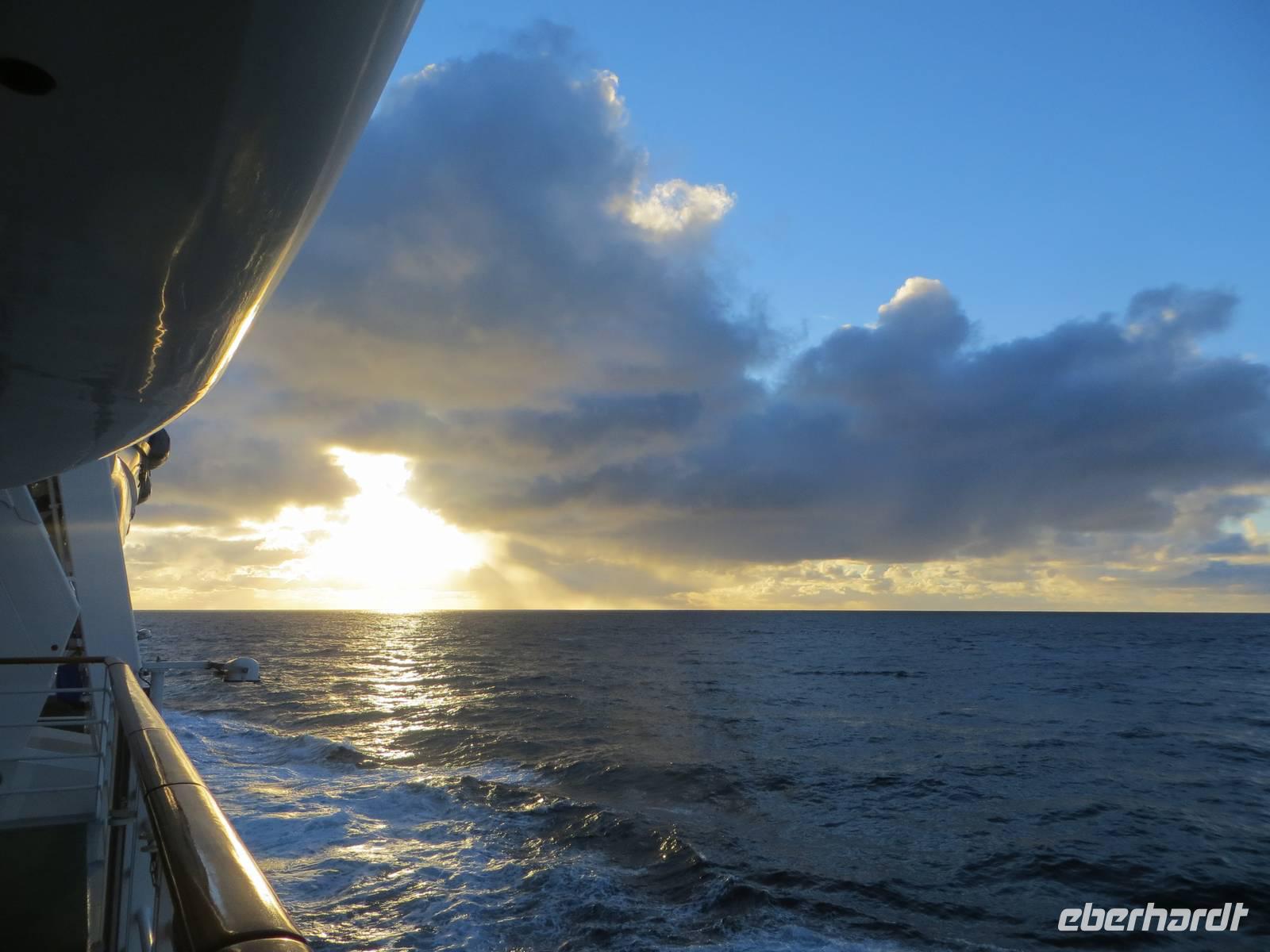 Nach dem Mittagessen nutzten wir den Nachmittag und den Abend für unterschiedliche Bordveranstaltungen. Bei diesem umfangreichen, vielseitigen Angebot konnte keine Langeweile aufkommen: Vorträge, Lesungen, Quiz, Kuchenzeit, Tanzkurs, Sport oder Sonnen ... jeder fand etwas nach seinen persönlichen Vorstellungen. Unser Kapitän Tidow stellte im Theatrium am Abend auf charmante und interessante Art und Weise seine Offiziere vor. Erneut konnten wir uns an einem Sonnenuntergang erfreuen. Wir träumten unserem ersten Landgang entgegen.
