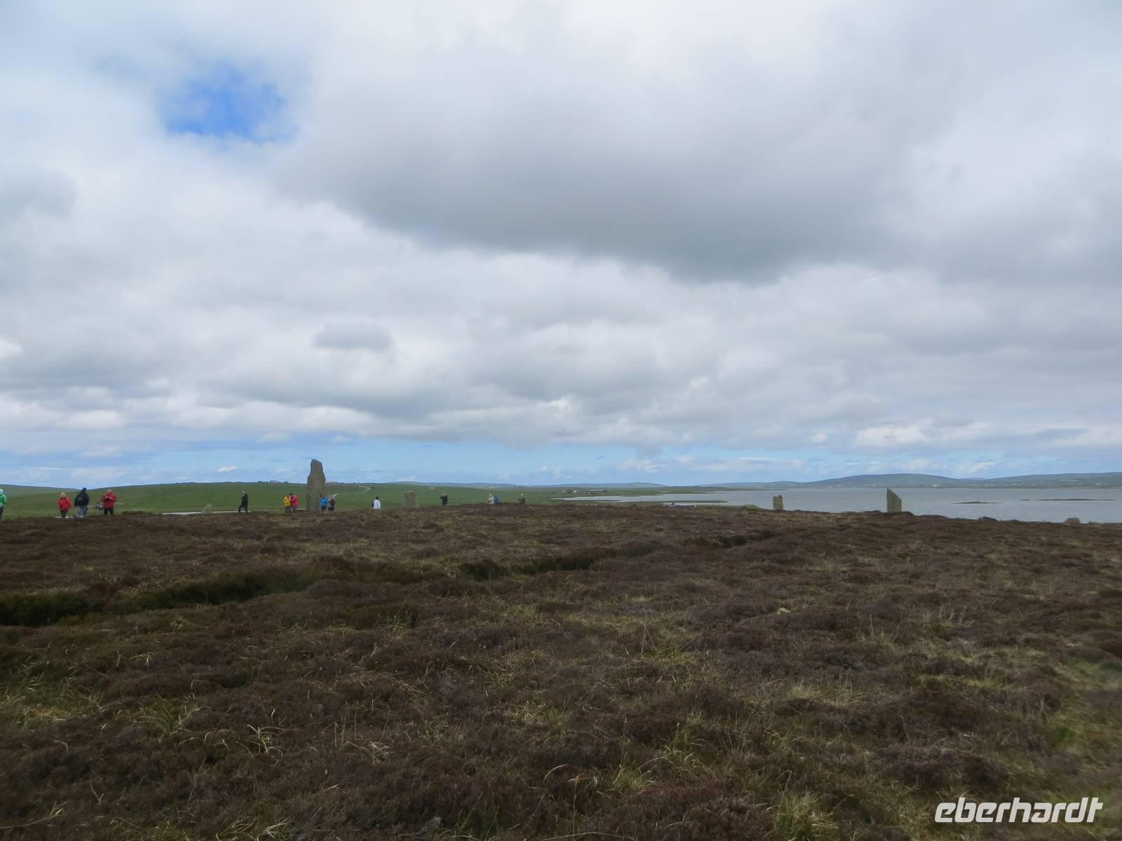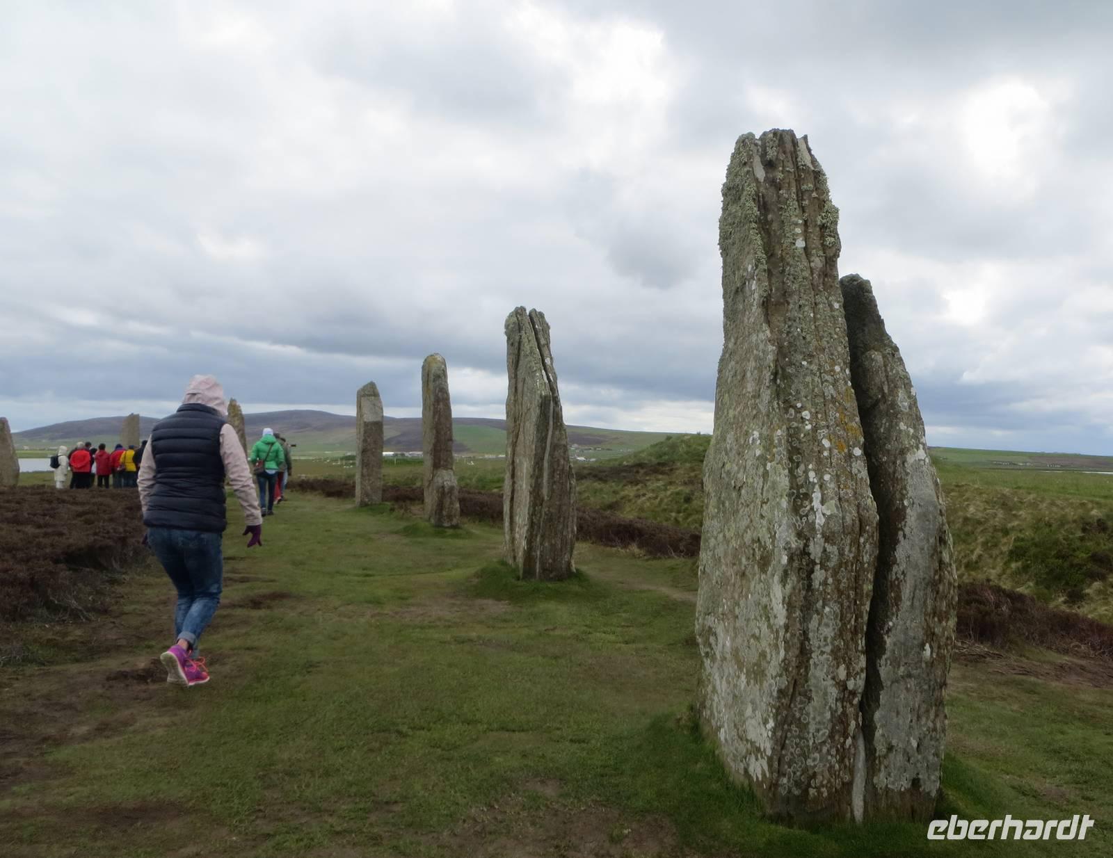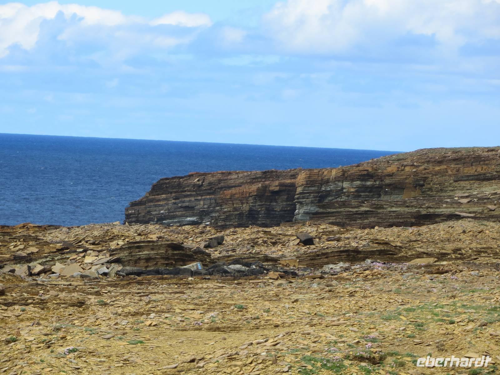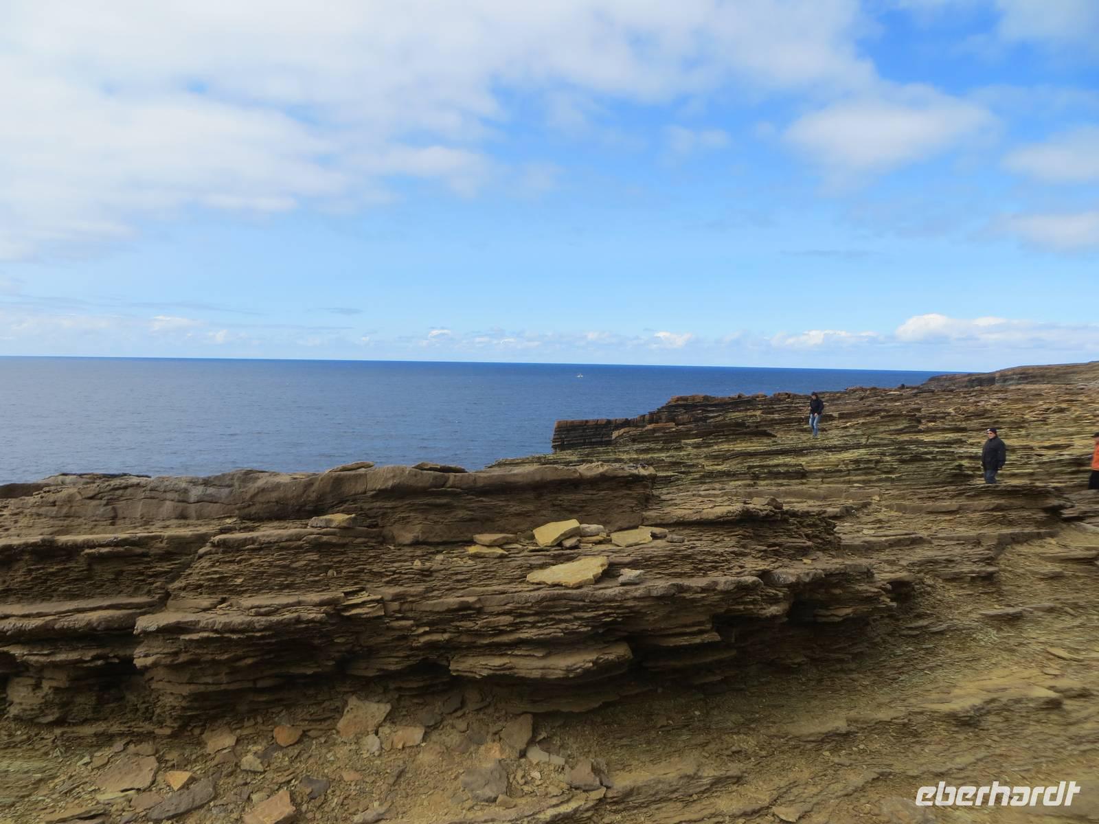 Unsere örtliche Reiseleiterin führte uns zum beeindruckenden Steinkreis von Brodgar. Exakt ausgerichtet, nur ca. 40 bis 50 cm im Boden verankert, bilden die 27 erhaltenen, gewaltigen Steine einen Kreis von 104 Metern. Damit ist dieser größer als sein bekannterer Bruder in Stonehenge. Unterwegs hatten wir vom Bus aus die Stones von Stenness gesehen und über die exakte Ausrichtung der Öffnungen des Hügelgrabes von Maes How Chambered Cairn zur Sonne gehört. Diese fast 5.000 Jahre alten Zeugnisse des Lebens in der Steinzeit nötigten uns größten Respekt ab. Welches Wissen hatten die Menschen bereits in der damaligen Zeit? Wie lebten sie im Einklang mit den Gestirnen? Natürlich erfuhren wir auch viel Wissenswertes zum heutigen Leben auf der Insel: zur Landwirtschaft, zum Hausbau, zum Fischfang, zum Schulbesuch ... zum Verkehr, die Straßen sind oft nur einspurig. Die Orkneys sind Vorreiter Europas zu erneuerbarer Energie: die ersten Windkraftanlagen wurden hier gebaut und jetzt werden Anlagen auf dem Meeresboden verankert, um die Kraft der Strömungen des Atlantiks in Elektroenergie umzuwandeln. Von der Kraft des Meeres konnten wir uns an den gewaltigen Klippen von Yesnaby überzeugen. Von Wind und Wasser geformt, eröffnete sich uns ein wunderschönes Panorama der zerklüfteten Küste. Wir bewunderten Muschelfossilien und kleine, ganz zarte Nelken auf kargem Boden.