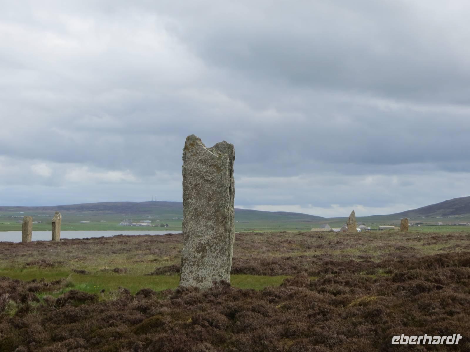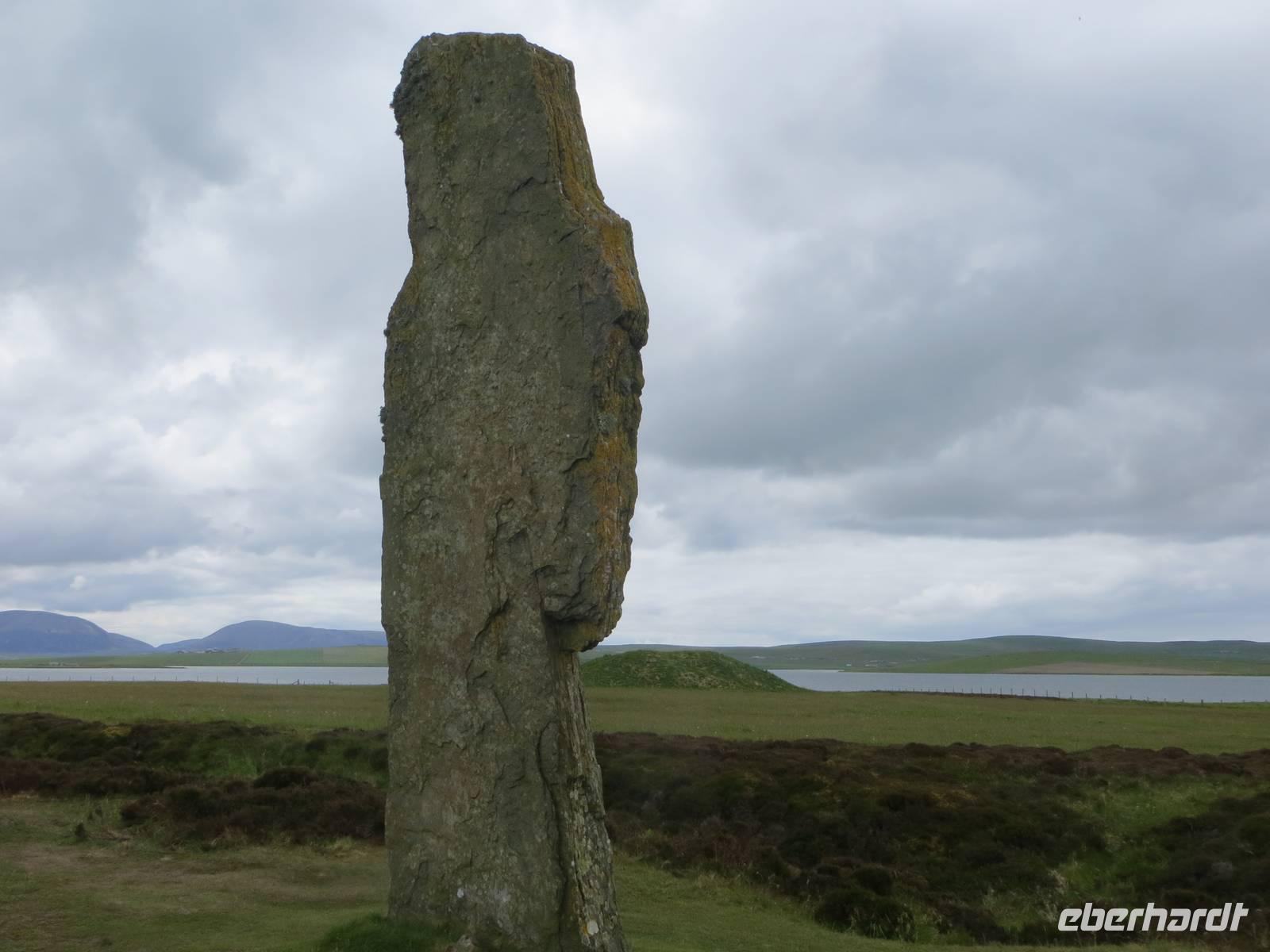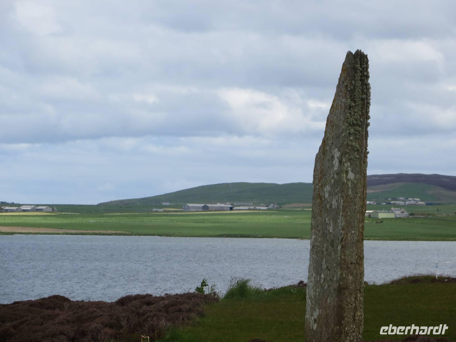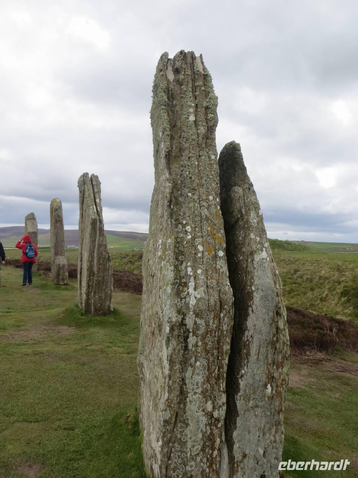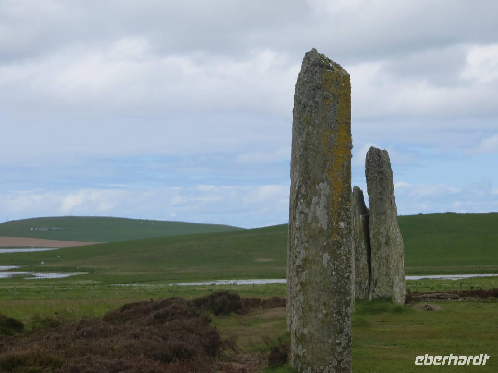 Unsere örtliche Reiseleiterin führte uns zum beeindruckenden Steinkreis von Brodgar. Exakt ausgerichtet, nur ca. 40 bis 50 cm im Boden verankert, bilden die 27 erhaltenen, gewaltigen Steine einen Kreis von 104 Metern. Damit ist dieser größer als sein bekannterer Bruder in Stonehenge. Unterwegs hatten wir vom Bus aus die Stones von Stenness gesehen und über die exakte Ausrichtung der Öffnungen des Hügelgrabes von Maes How Chambered Cairn zur Sonne gehört. Diese fast 5.000 Jahre alten Zeugnisse des Lebens in der Steinzeit nötigten uns größten Respekt ab. Welches Wissen hatten die Menschen bereits in der damaligen Zeit? Wie lebten sie im Einklang mit den Gestirnen? Natürlich erfuhren wir auch viel Wissenswertes zum heutigen Leben auf der Insel: zur Landwirtschaft, zum Hausbau, zum Fischfang, zum Schulbesuch ... zum Verkehr, die Straßen sind oft nur einspurig. Die Orkneys sind Vorreiter Europas zu erneuerbarer Energie: die ersten Windkraftanlagen wurden hier gebaut und jetzt werden Anlagen auf dem Meeresboden verankert, um die Kraft der Strömungen des Atlantiks in Elektroenergie umzuwandeln. Von der Kraft des Meeres konnten wir uns an den gewaltigen Klippen von Yesnaby überzeugen. Von Wind und Wasser geformt, eröffnete sich uns ein wunderschönes Panorama der zerklüfteten Küste. Wir bewunderten Muschelfossilien und kleine, ganz zarte Nelken auf kargem Boden.