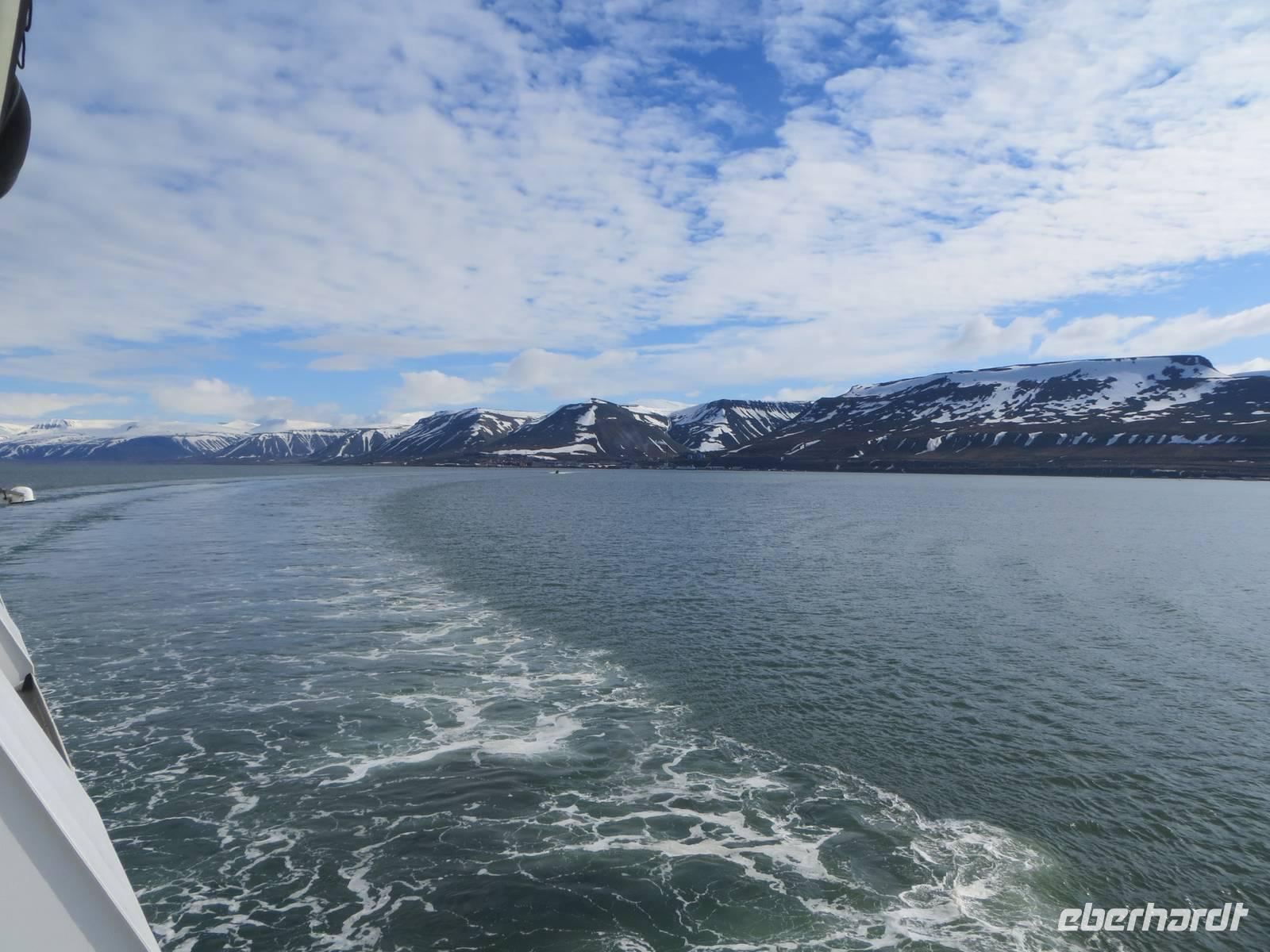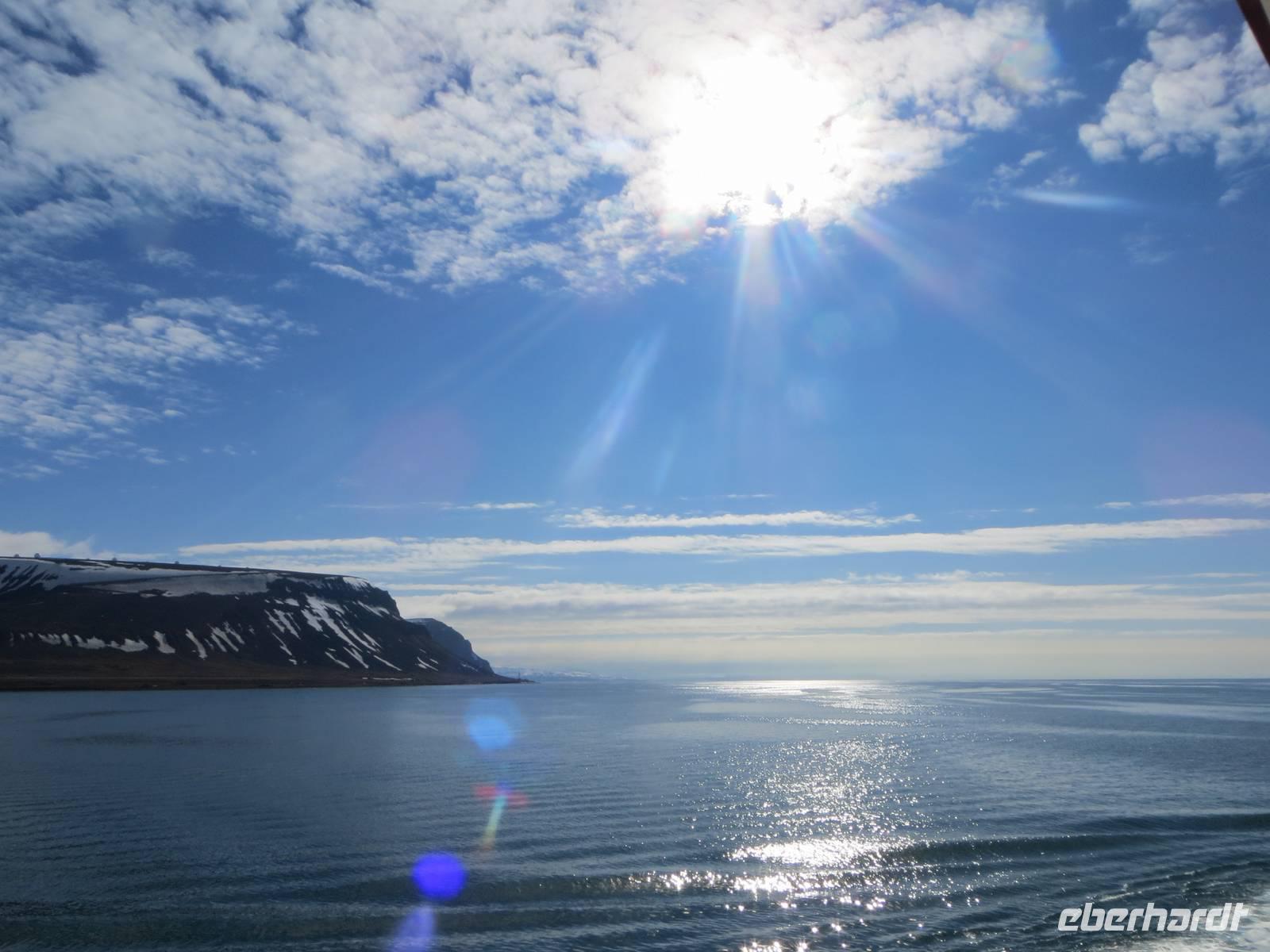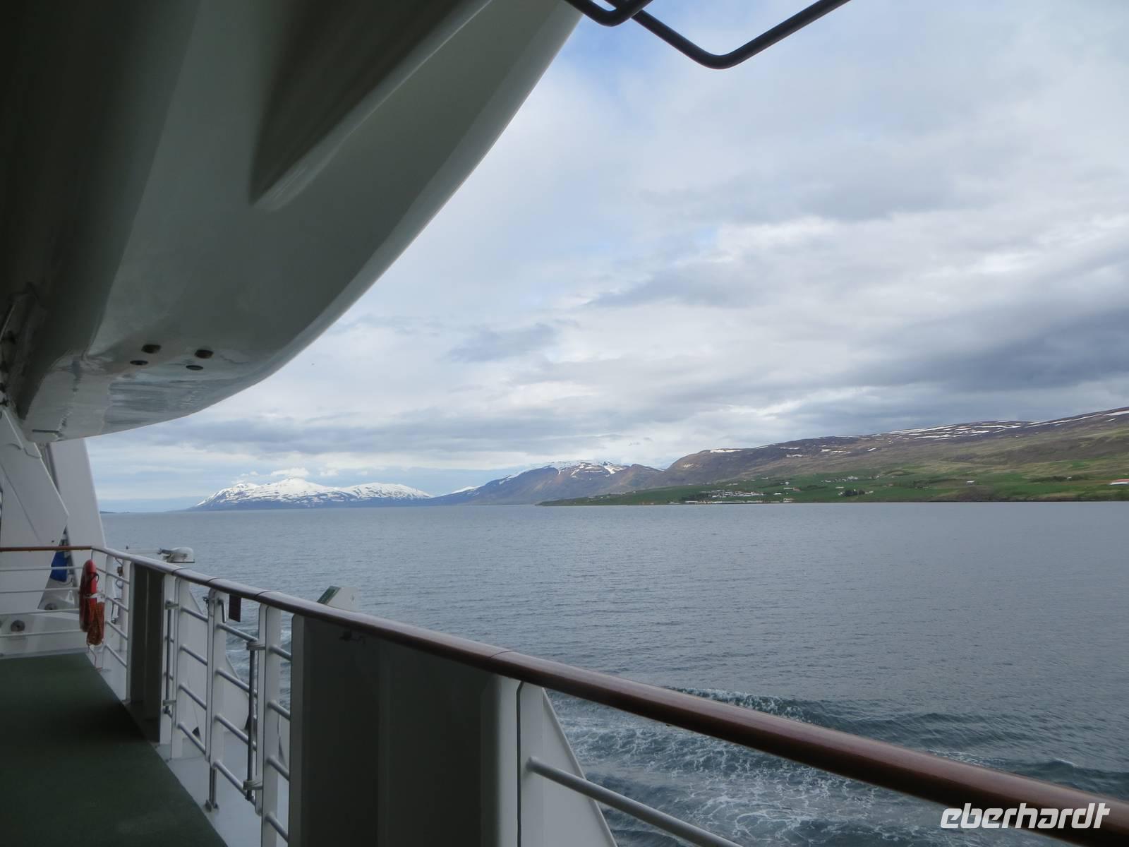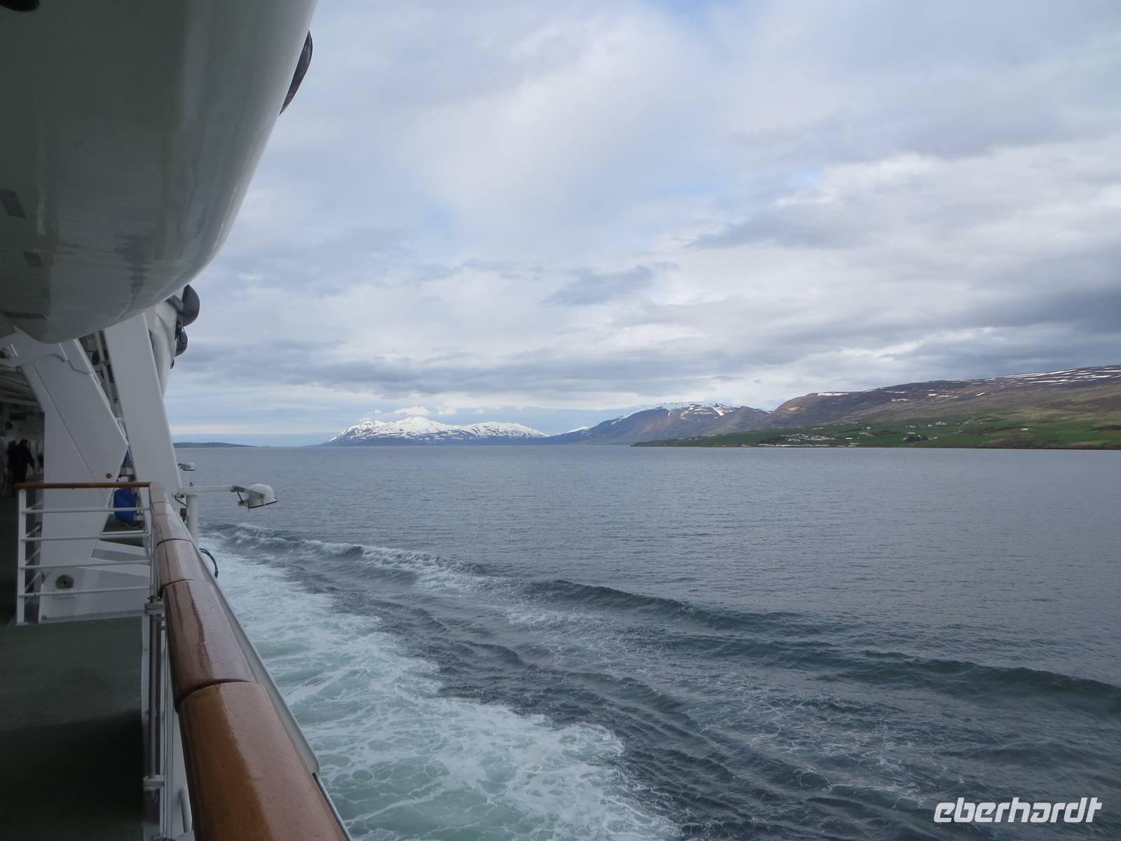 Im Hafen nutzten wir kleine Einkaufsmöglichkeiten. Eine Eisbärenfamilie (ausgestopft) erinnerte uns, dass uns unsere Kreuzfahrt immer näher an den Nordpol führt. Doch nun erfreuten wir uns erst einmal an der Ausfahrt aus dem Eyjafördur, dem längsten Fjord Islands, vor einer wirklich grandiosen Kulisse der Berge, die ganz platt majestätisch links und rechts emporragten. Ihre Form hatten sie durch die Eiszeit erhalten, als ihre Gipfel regelrecht abgeschliffen, ja fast abgeschnitten wurden. Am Abend schwelgten wir noch lange in den Erinnerungen an diesen „Tag der Naturschauspiele".