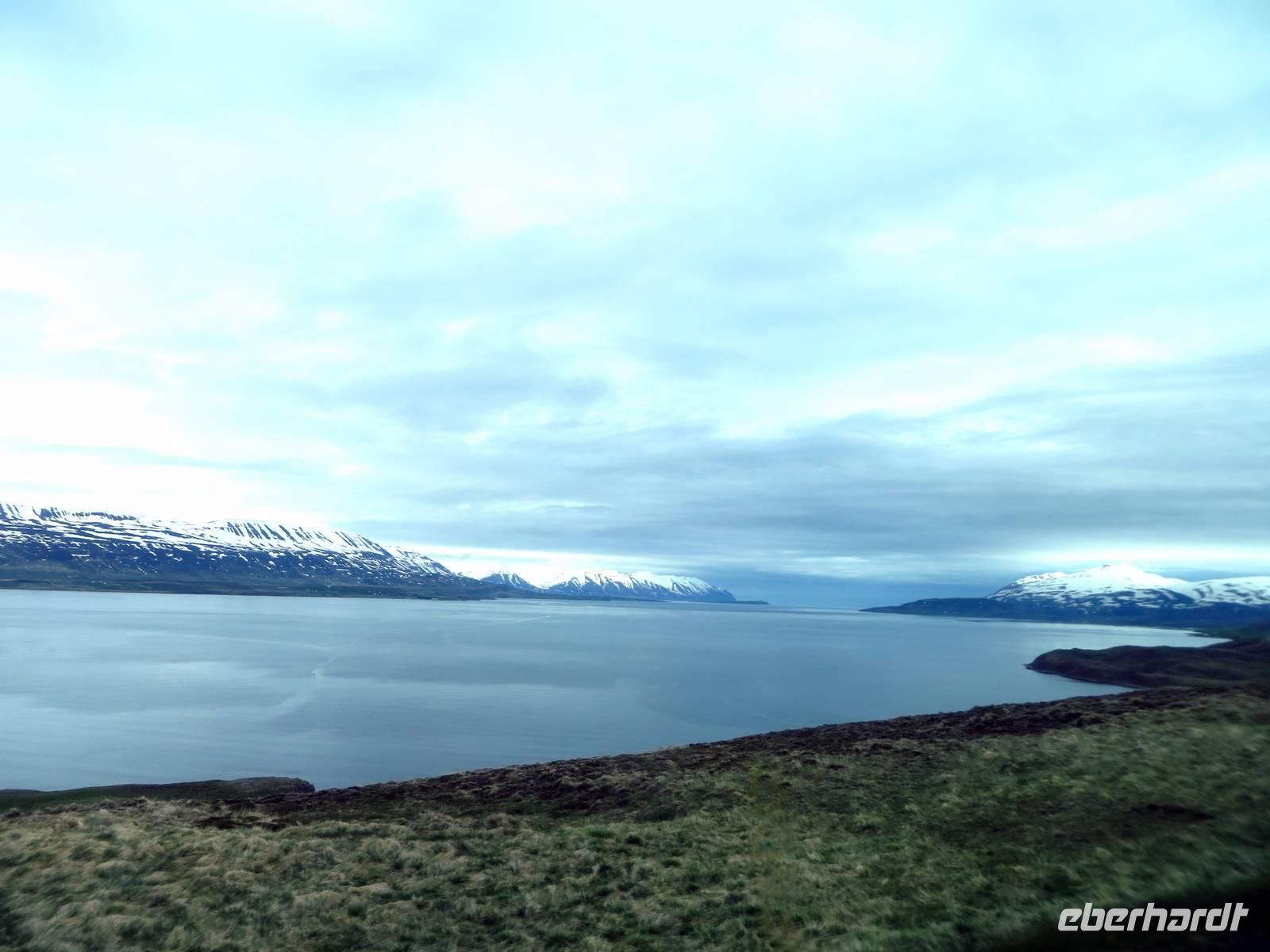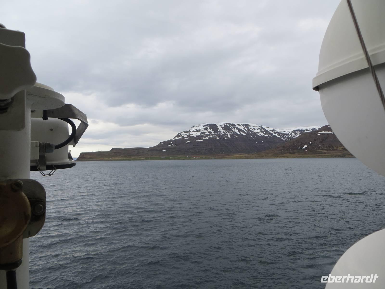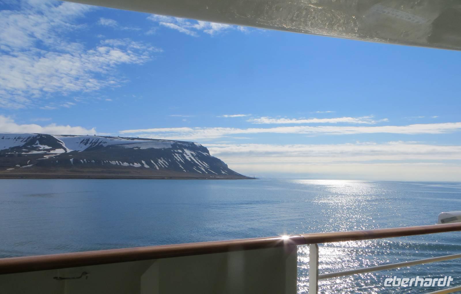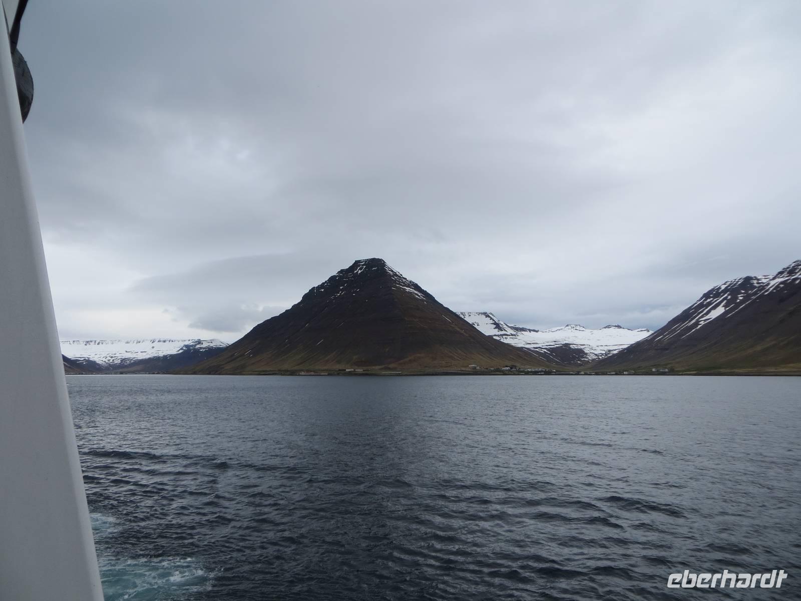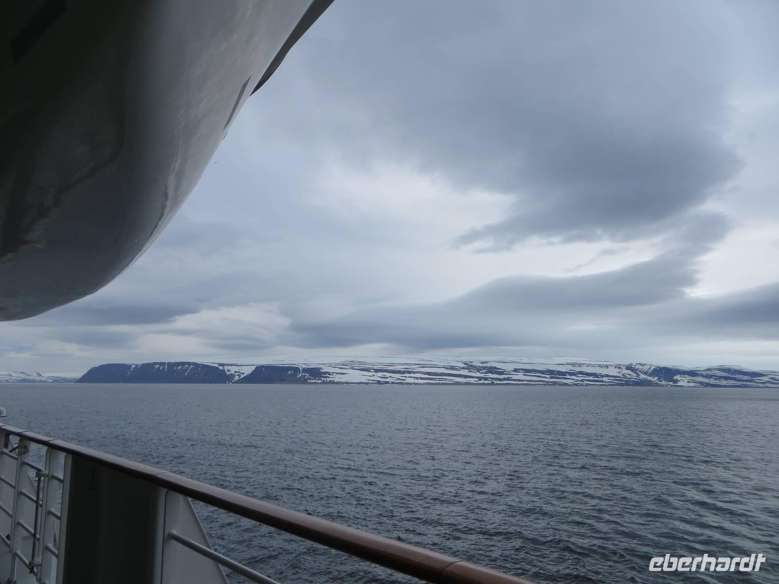 Im Hafen nutzten wir kleine Einkaufsmöglichkeiten. Eine Eisbärenfamilie (ausgestopft) erinnerte uns, dass uns unsere Kreuzfahrt immer näher an den Nordpol führt. Doch nun erfreuten wir uns erst einmal an der Ausfahrt aus dem Eyjafördur, dem längsten Fjord Islands, vor einer wirklich grandiosen Kulisse der Berge, die ganz platt majestätisch links und rechts emporragten. Ihre Form hatten sie durch die Eiszeit erhalten, als ihre Gipfel regelrecht abgeschliffen, ja fast abgeschnitten wurden. Am Abend schwelgten wir noch lange in den Erinnerungen an diesen „Tag der Naturschauspiele".