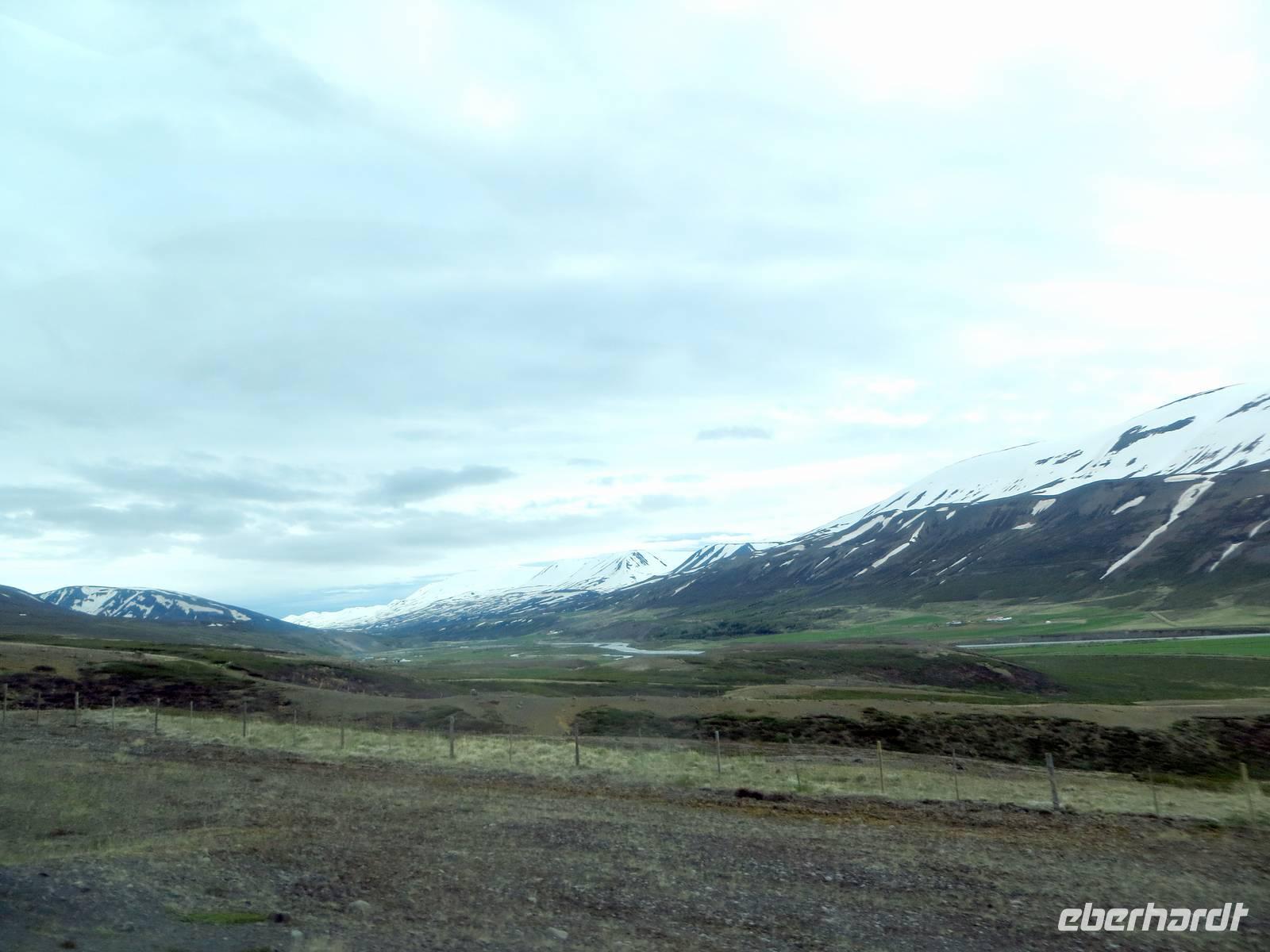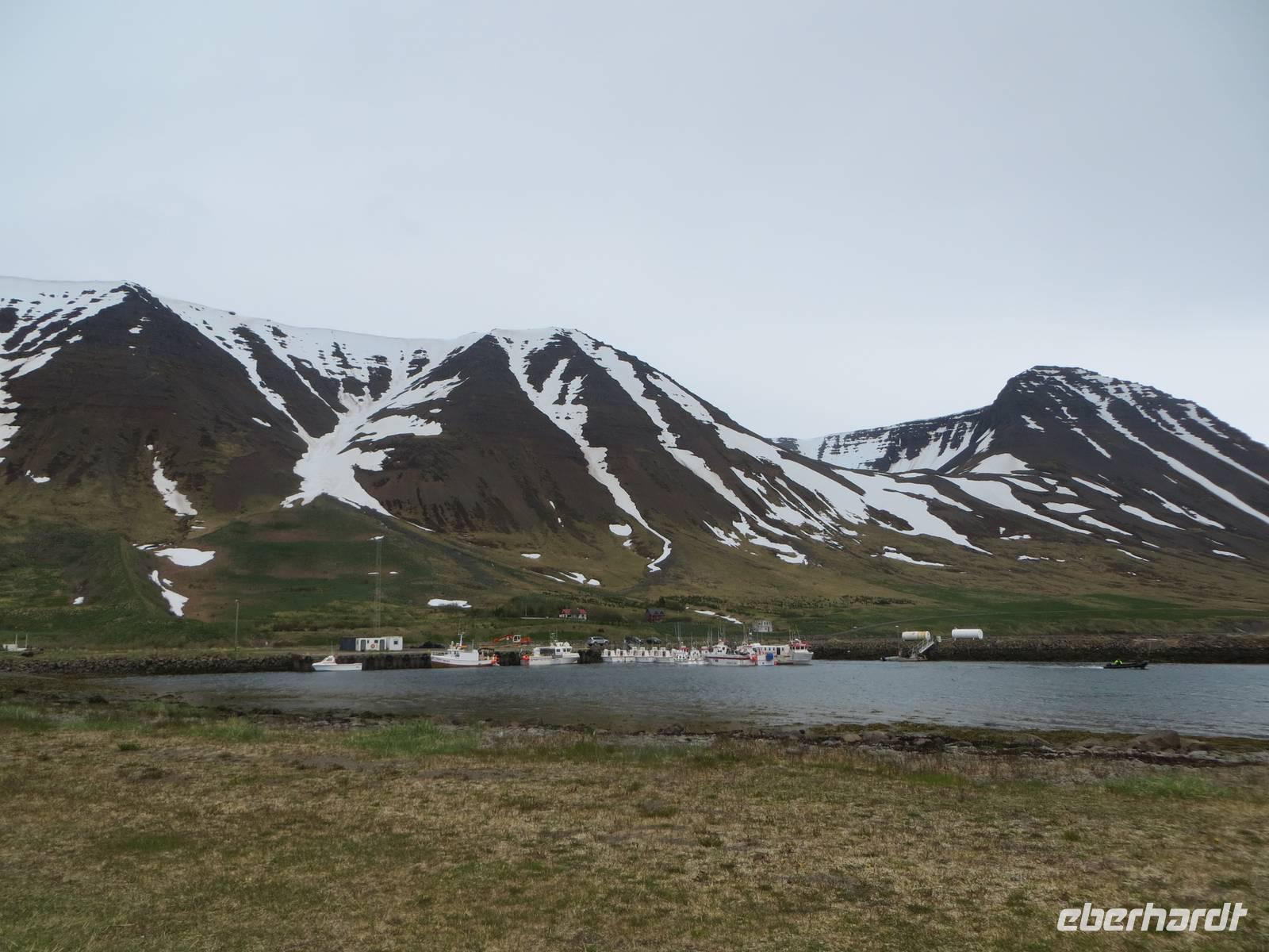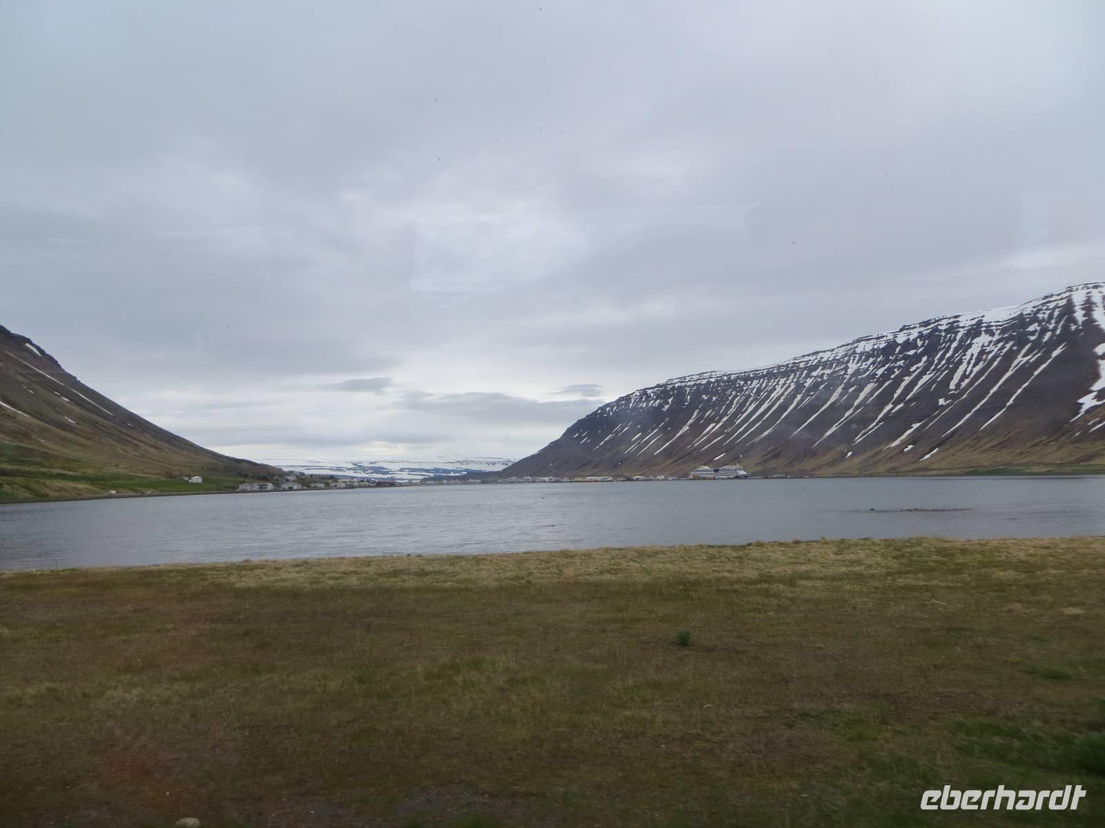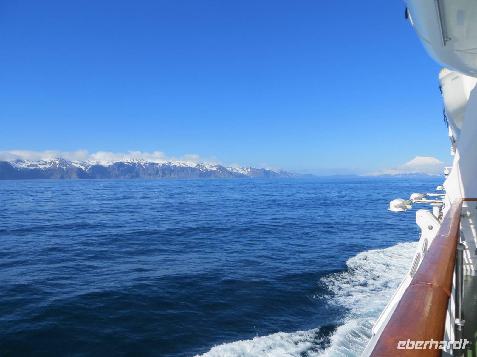 Im Hafen nutzten wir kleine Einkaufsmöglichkeiten. Eine Eisbärenfamilie (ausgestopft) erinnerte uns, dass uns unsere Kreuzfahrt immer näher an den Nordpol führt. Doch nun erfreuten wir uns erst einmal an der Ausfahrt aus dem Eyjafördur, dem längsten Fjord Islands, vor einer wirklich grandiosen Kulisse der Berge, die ganz platt majestätisch links und rechts emporragten. Ihre Form hatten sie durch die Eiszeit erhalten, als ihre Gipfel regelrecht abgeschliffen, ja fast abgeschnitten wurden. Am Abend schwelgten wir noch lange in den Erinnerungen an diesen „Tag der Naturschauspiele".