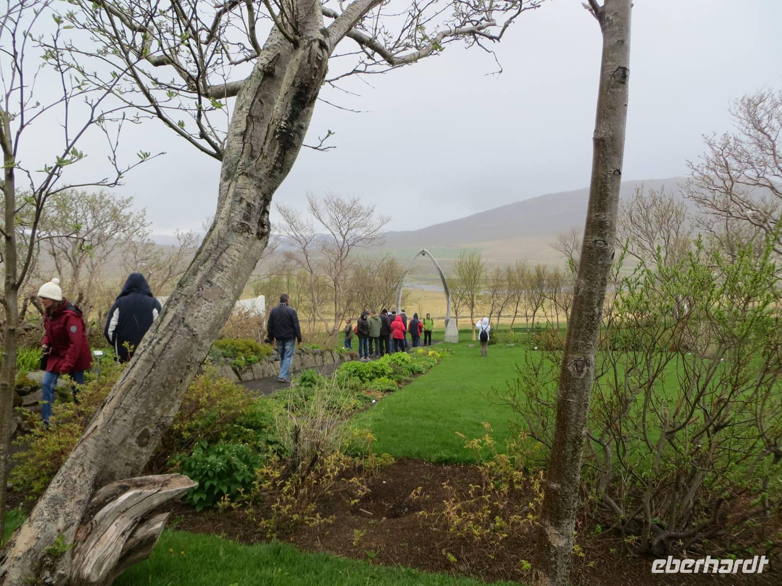 Wetter, Wind und Meer meinten es gut mit uns. Kapitän Tidow hatte uns bereits am gestrigen Abend informiert, dass die Bedingungen so sein werden, dass die AIDAluna nicht auf dem Skultusfjördur auf Reede liegen wird, sondern wir direkt an der Pier festmachen können. Schon die Einfahrt in den Fjord war spektakulär: links und rechts die Berghänge des Eyrarfjalls und des Isafördurs. Bei angenehmen 10 °C starteten wir zu unseren Ausflügen. Die Mehrzahl unserer Gruppe entschied sich zu einer kleinen Exkursion zum Botanischen Garten von Núpur, einem echtem Kleinod und einer bunten Oase an den Ausläufern der kahlen Berghänge. Dieser Garten wurde 1908 von dem Pfarrer Gudlaugsson angelegt und gilt als der älteste seiner Art in ganz Island. Er ist Beweis dafür, dass bei guter Pflege auch unter dem rauen nordischen Klima Gemüse und Blumen wachsen können.