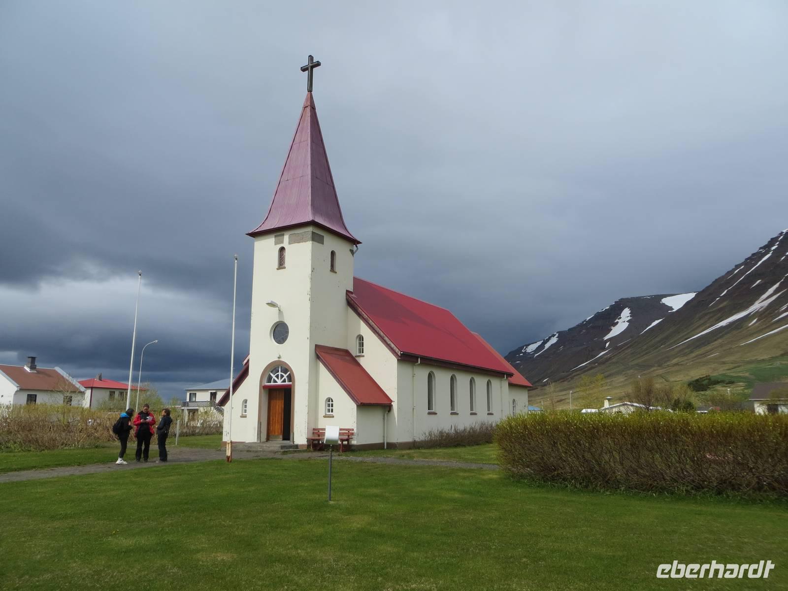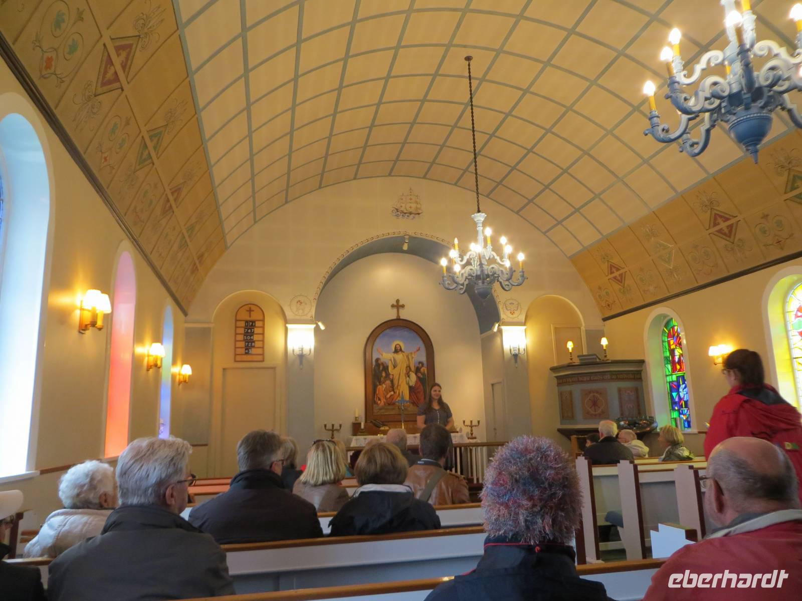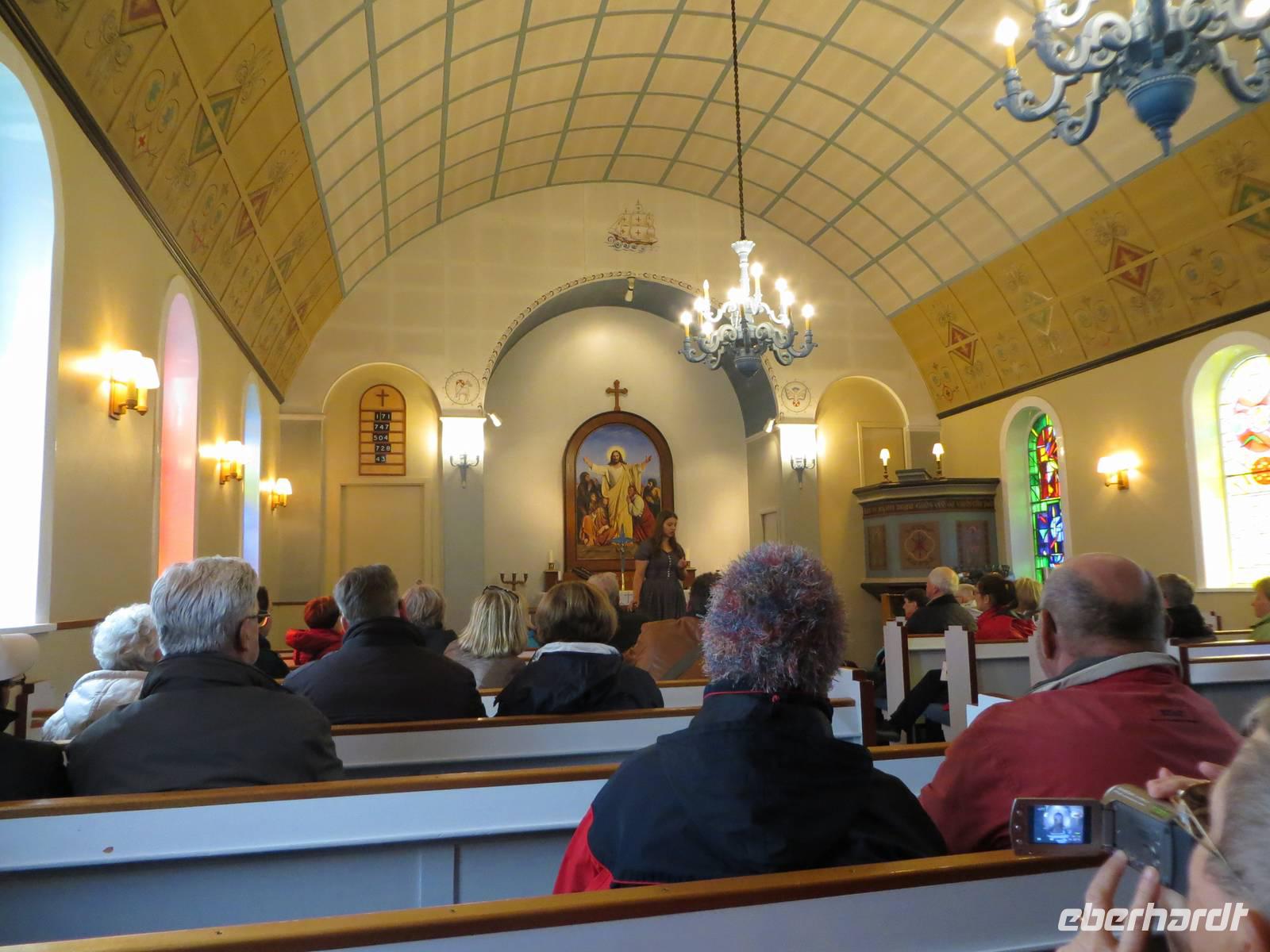 In der kleinen Kirche des Ortes lauschten wir bei einem kleinen Privatkonzert dem glockenklaren Gesang einer jungen Isländerin. Sie interpretierte Seemanns- und Liebeslieder auf sehr eindrucksvolle Art und Weise - ein Gänsehautgefühl. Es zeigte sich im wahrsten Sinne des Wortes, dass Musik verbindet. Obwohl wir den Text nicht verstanden, reichten einige wenige Worte der Übersetzung, um den Inhalt zu erfassen. Die Kirche bietet sehr viel Symbolik, der Leuchter mit 21 Kerzen erinnert an die Opfer des Lawinenunglücks von 1995.