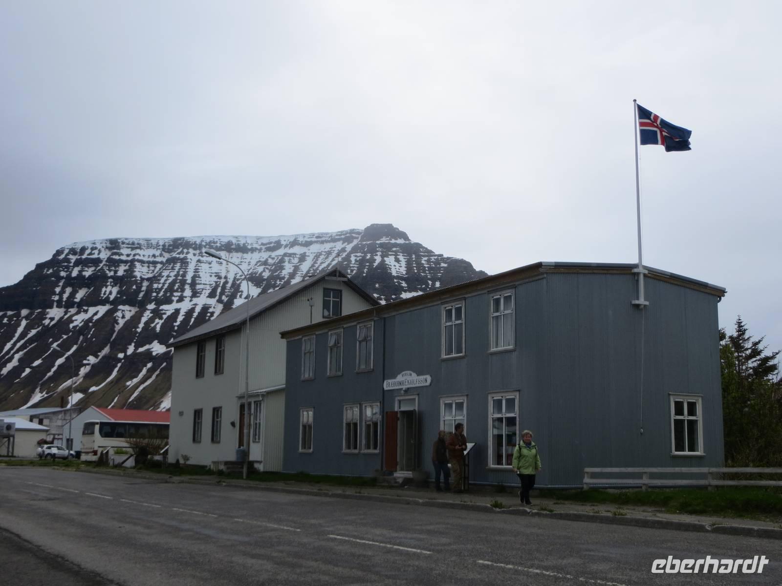 Unsere örtliche Reiseleiterin Henna berichtete auf dem Weg nach Flateyri über die Geschichte des Walfanges und die Lawinengefahr hier an der Küste. Auf imposanter Strecke durch ein verzweigtes Tunnelsystem mit Straßenkreuzungen erreichten wir den kleinen, ehemaligen Walfängerort, heute ein Touristenzentrum. In einem kleinen Café am Handwerkerzentrum stärkten wir uns mit einem liebevoll angerichteten Imbiss. Anschließend besuchten wir den alten Buchladen des Ortes. In der Wohnung der ehemaligen Besitzer, früher auch ein Kramladen, begrüßte uns der Urenkel. Alles war so hergerichtet, als seien die Besitzer gerade kurz aus den Räumen gegangen. Elektrischen Strom erhielt das erste Haus in diesem kleinen Fischerort erst in den 20er Jahren des letzten Jahrhunderts.