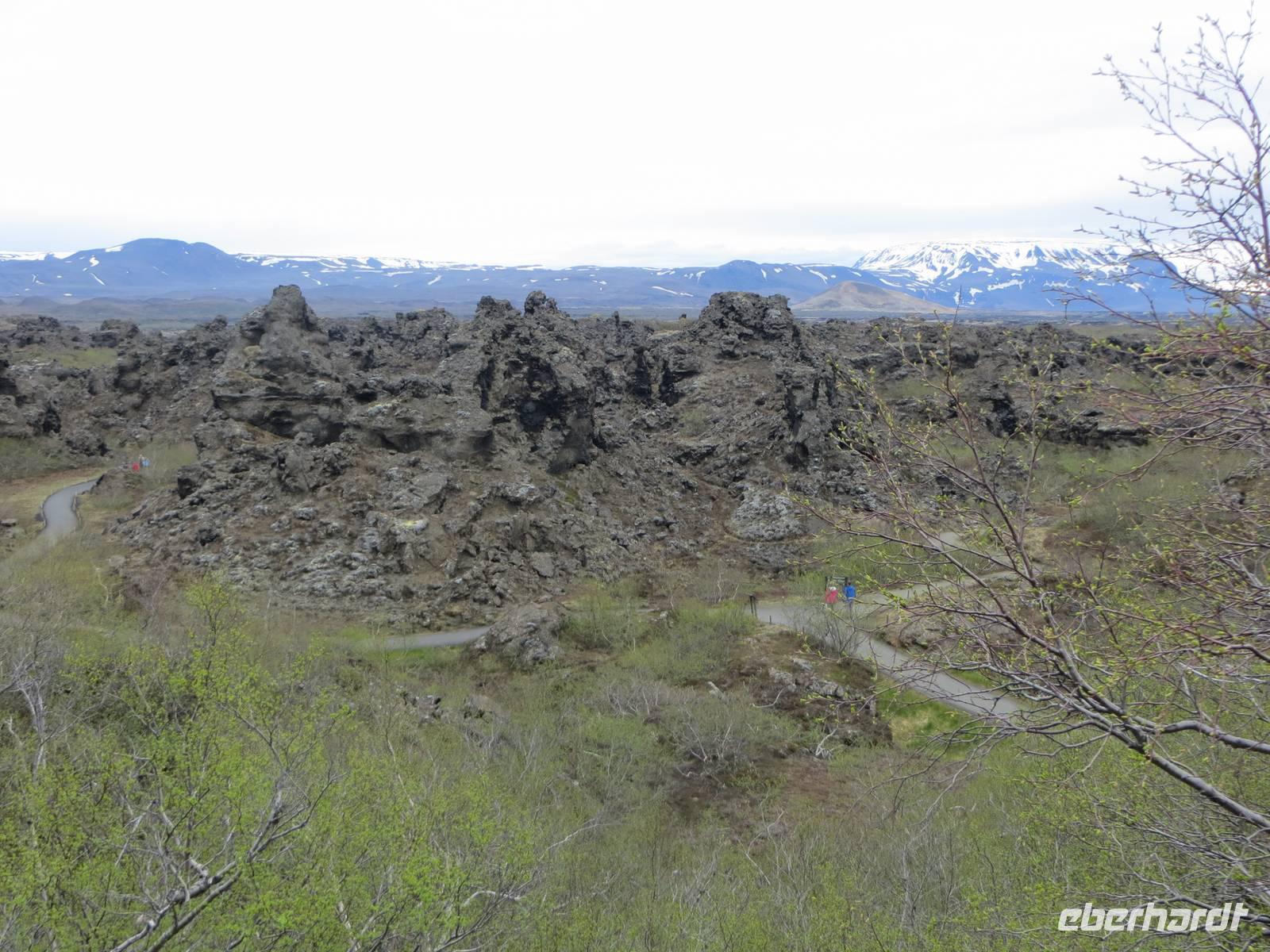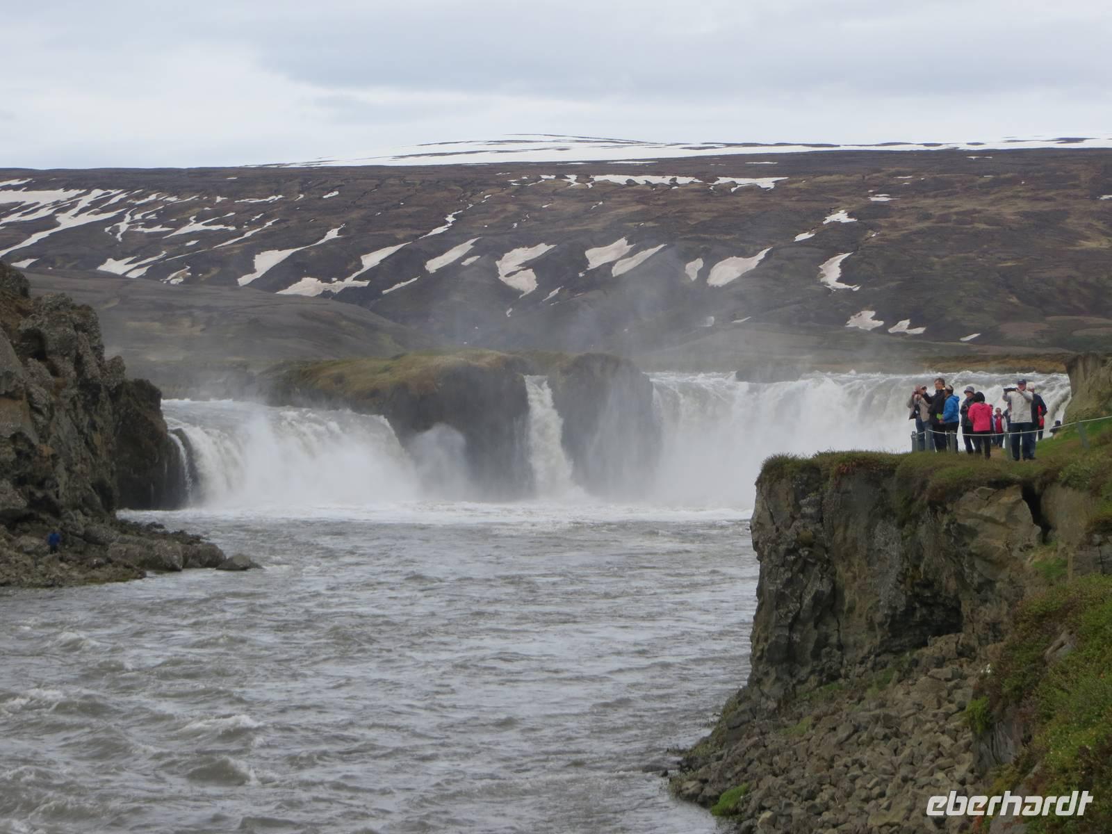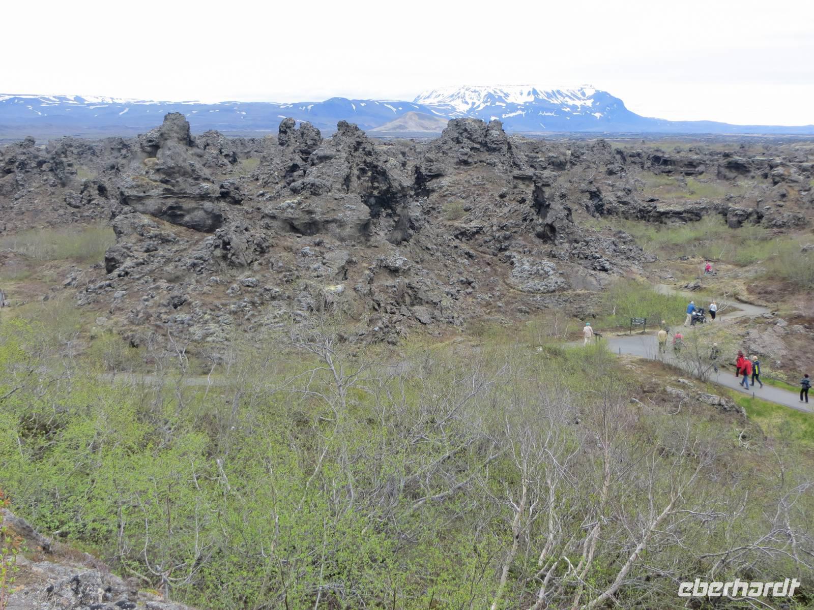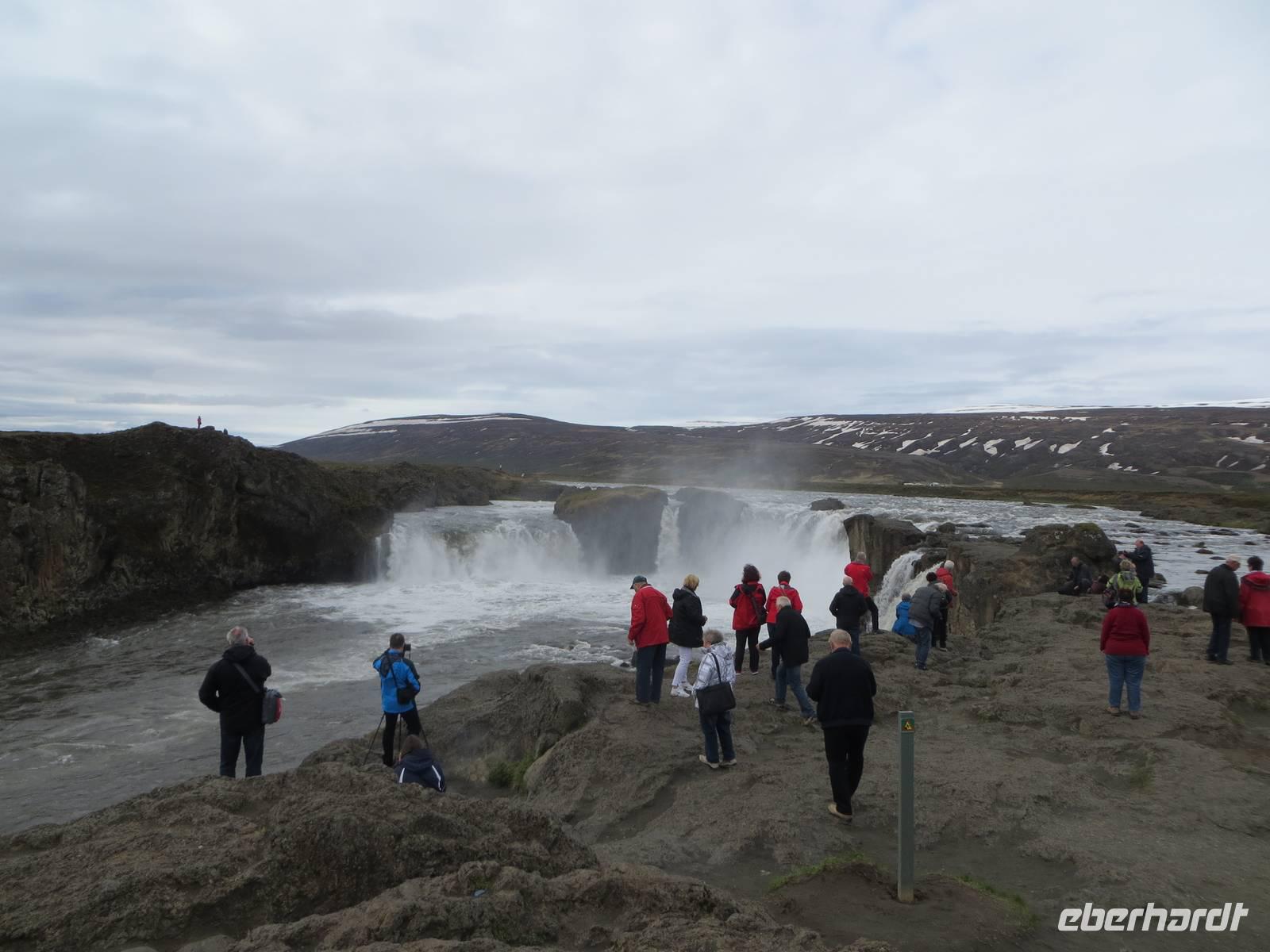 Obwohl wir nun dem Nordpol immer näher kommen, ist es heute mit mehr als 10 °C frühlingshaft warm. Wir trafen uns voller Erwartung an der Rezeption zu unserem Eberhardt-Inklusiv-Ausflug. Pünktlich starteten wir 09.00 Uhr mit unserem örtlichen Reiseleiter Walter zu den Naturschätzen in die Umgebung der „Perle des Nordens". Hier präsentierte sich die Landschaft wesentlich grüner als wir es bisher in Island gesehen hatten: Weiden für Schafe, viele grasende Herden mit Islandpferden und auch aufgeforstete Wälder begleiteten unseren Weg. Links und rechts der Straße sprudelten kleine Bäche auf den Wiesen. Walter berichtete über die Christianisierung der Isländer und wie sie ihre heidnischen Götter entsprechend einer alten Island-Saga in einen Wasserfall stießen. Am Horizont zeigten sich weiße Nebel, die Gischt des „Wasserfalls der Götter", des Godafoss. Wir spazierten zu diesem eindrucksvollen Naturschauspiel: Nur 12 Meter hoch stürzten die Wassermassen wildschäumend in großer Breite über zwei Stufen in die Tiefe. Unser Ausflug führte uns anschließend zum viertgrößten See Islands zum Myvatn. Walter erläuterte uns, wie die Pseudokrater von Skútustadir durch Gasexplosionen unter bereits erkalteter Lava entstanden sind. Im Lava-Irrgarten von Dimmuborgir spazierten wir zwischen einzigartigen, bizarren Felsformationen, die unserer Fantasie freien Lauf ließen. Im Restaurant des Lava-Irrgartens mit schönem Blick auf den Myvatn stärkten wir uns beim Mittagessen mit Isländischer Fleischsuppe - äußerst lecker, vegetarischer Kokosnuss-Suppe und Minestrone. Dazu wurden uns frische Brötchen und leckeres schwarzes Brot, über der Vulkanquelle gebacken, serviert.