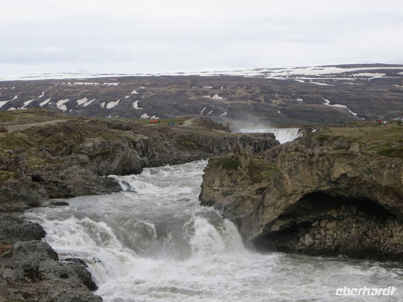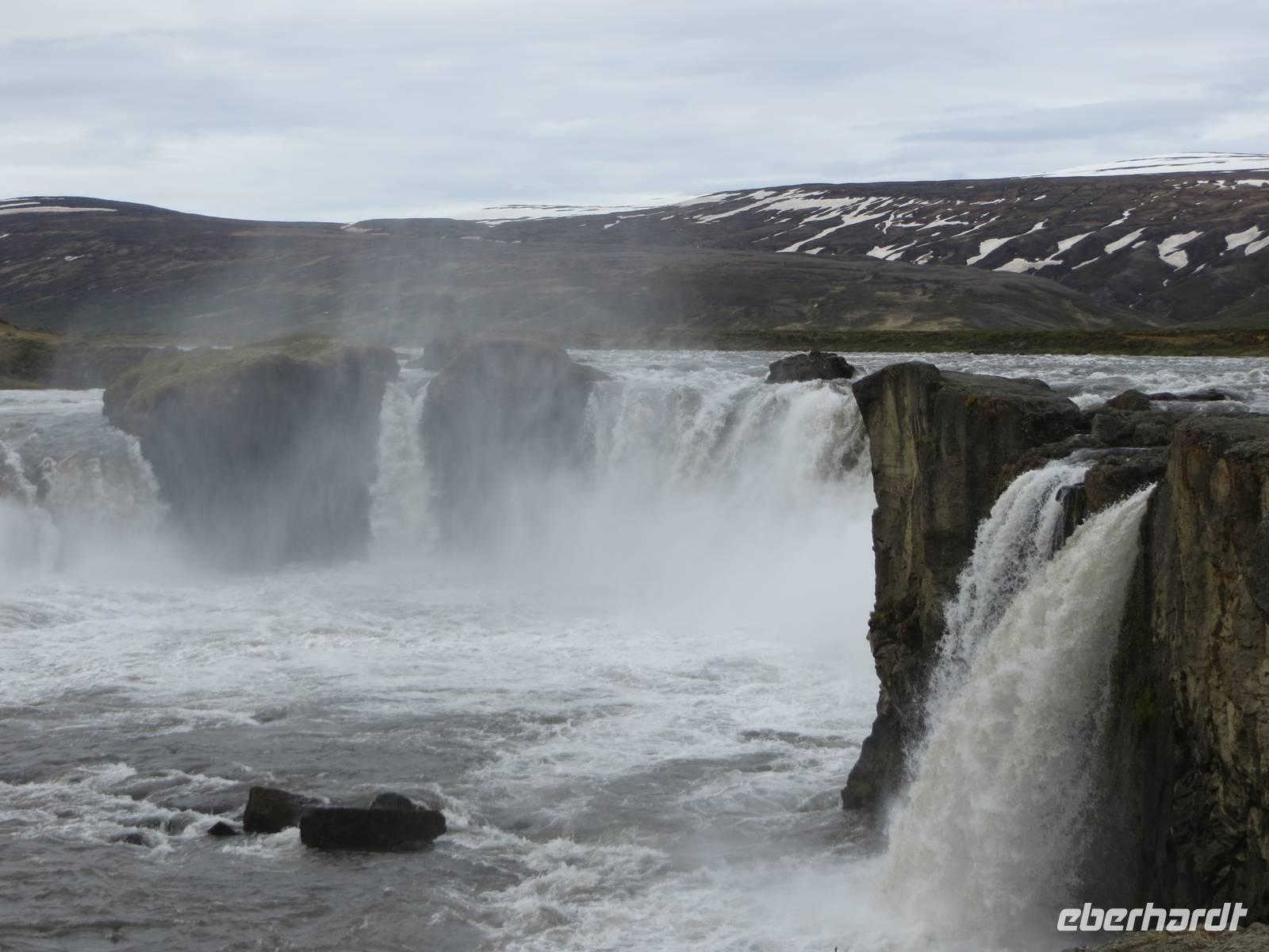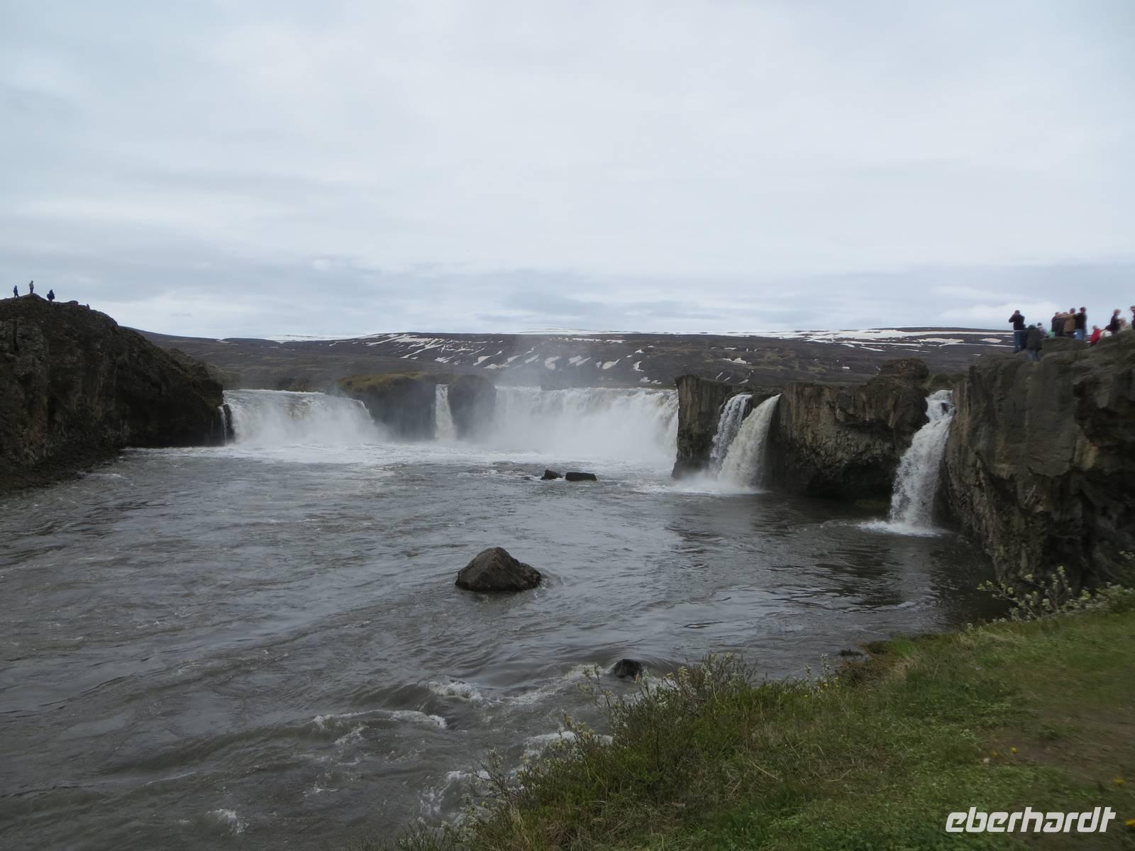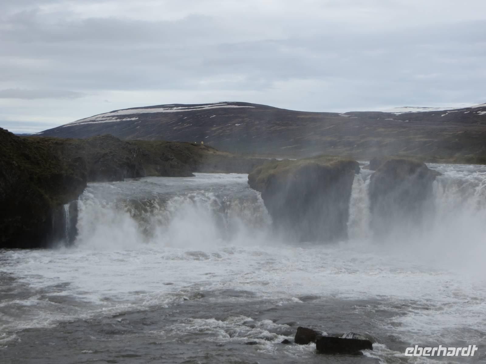 Obwohl wir nun dem Nordpol immer näher kommen, ist es heute mit mehr als 10 °C frühlingshaft warm. Wir trafen uns voller Erwartung an der Rezeption zu unserem Eberhardt-Inklusiv-Ausflug. Pünktlich starteten wir 09.00 Uhr mit unserem örtlichen Reiseleiter Walter zu den Naturschätzen in die Umgebung der „Perle des Nordens". Hier präsentierte sich die Landschaft wesentlich grüner als wir es bisher in Island gesehen hatten: Weiden für Schafe, viele grasende Herden mit Islandpferden und auch aufgeforstete Wälder begleiteten unseren Weg. Links und rechts der Straße sprudelten kleine Bäche auf den Wiesen. Walter berichtete über die Christianisierung der Isländer und wie sie ihre heidnischen Götter entsprechend einer alten Island-Saga in einen Wasserfall stießen. Am Horizont zeigten sich weiße Nebel, die Gischt des „Wasserfalls der Götter", des Godafoss. Wir spazierten zu diesem eindrucksvollen Naturschauspiel: Nur 12 Meter hoch stürzten die Wassermassen wildschäumend in großer Breite über zwei Stufen in die Tiefe. Unser Ausflug führte uns anschließend zum viertgrößten See Islands zum Myvatn. Walter erläuterte uns, wie die Pseudokrater von Skútustadir durch Gasexplosionen unter bereits erkalteter Lava entstanden sind. Im Lava-Irrgarten von Dimmuborgir spazierten wir zwischen einzigartigen, bizarren Felsformationen, die unserer Fantasie freien Lauf ließen. Im Restaurant des Lava-Irrgartens mit schönem Blick auf den Myvatn stärkten wir uns beim Mittagessen mit Isländischer Fleischsuppe - äußerst lecker, vegetarischer Kokosnuss-Suppe und Minestrone. Dazu wurden uns frische Brötchen und leckeres schwarzes Brot, über der Vulkanquelle gebacken, serviert.
