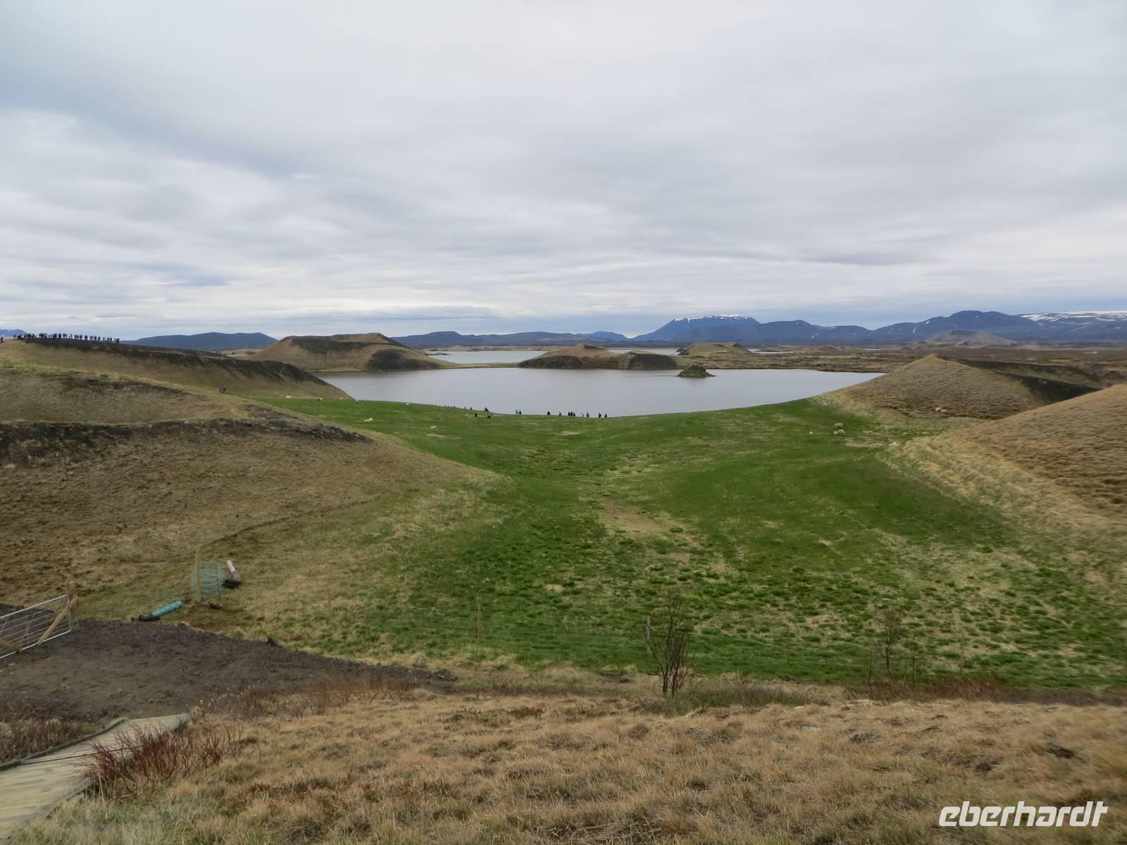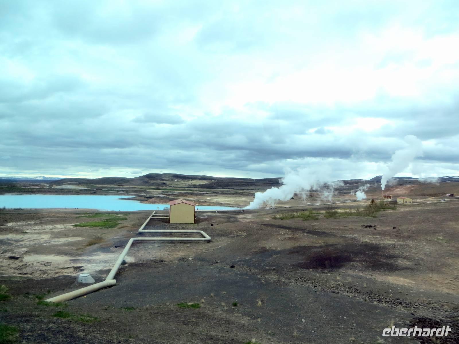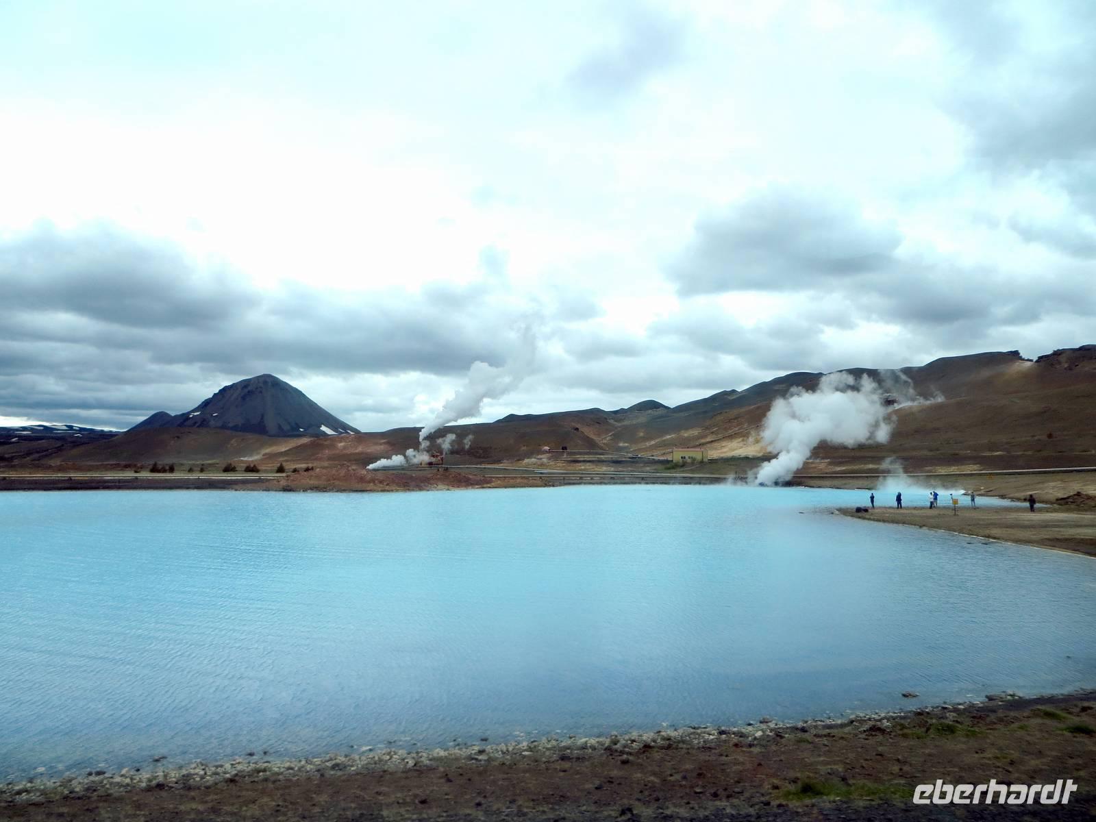 Auf dem Weg zum Schiff erblickten wir das Thermalbad am Myvatn. Am Ufer des Sees tanzten in großen dunklen Wolken viele, schwarze Mückenschwärme. Es soll pro Jahr 2.500 Tonnen Mücken am See geben: Das wären pro Jahr, wenn eine Mücke ca. 2,5 Milligramm wiegt,