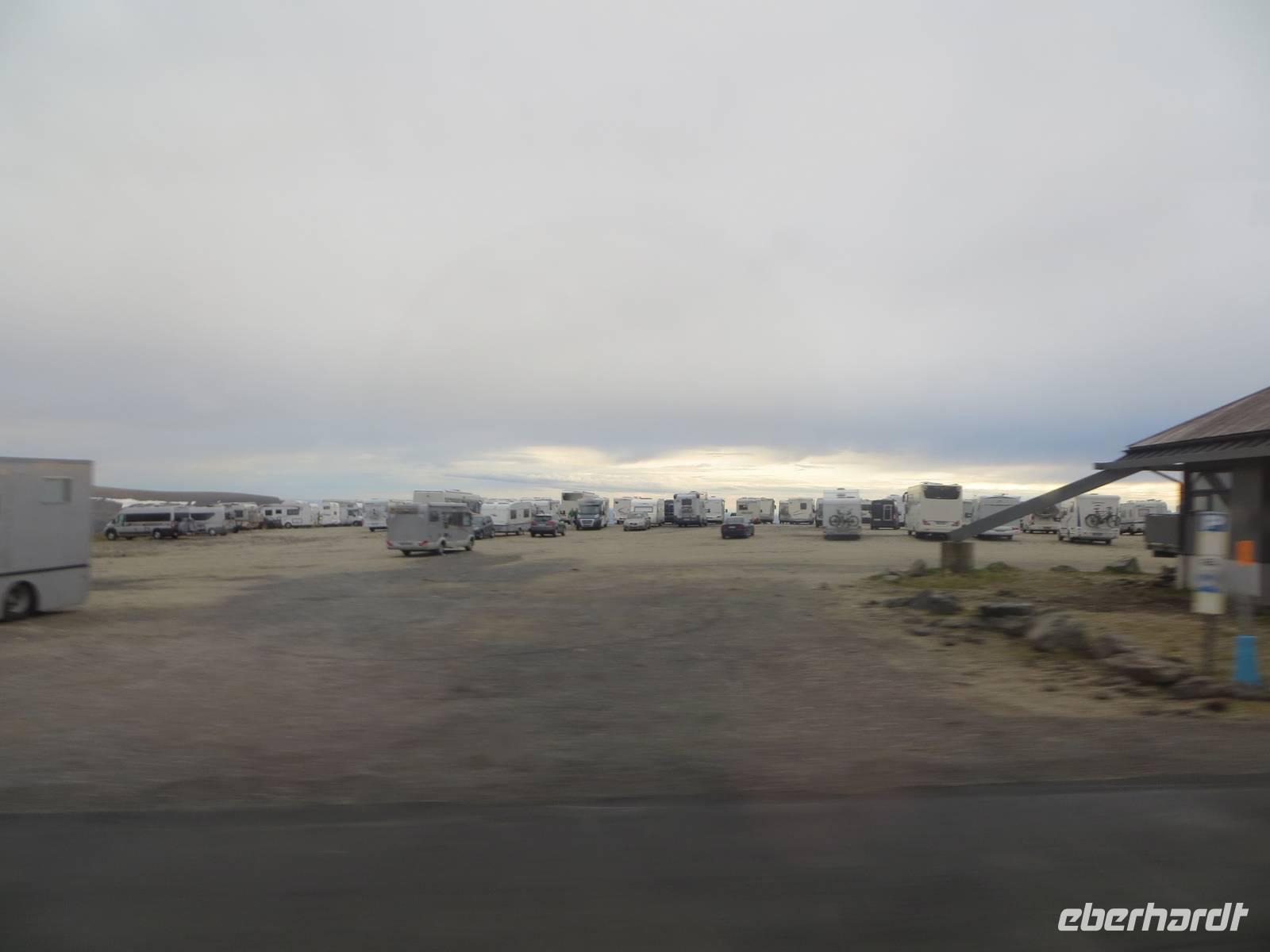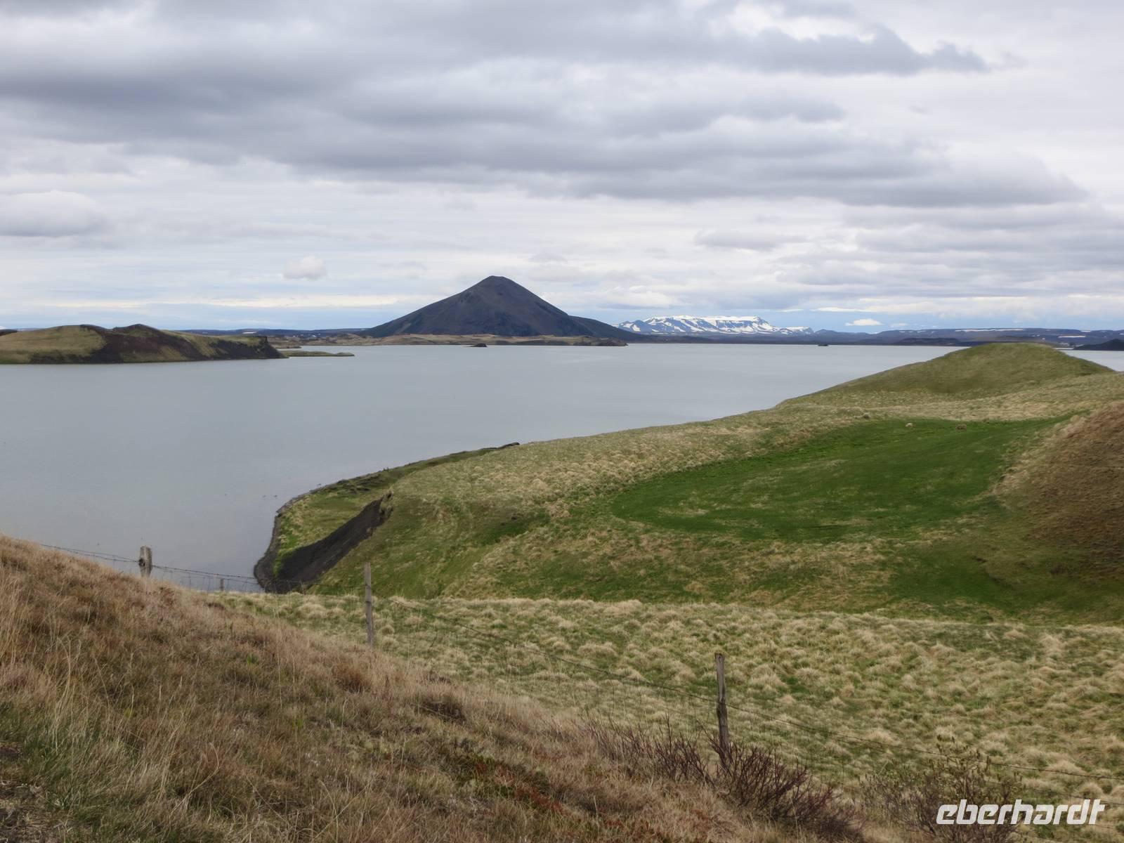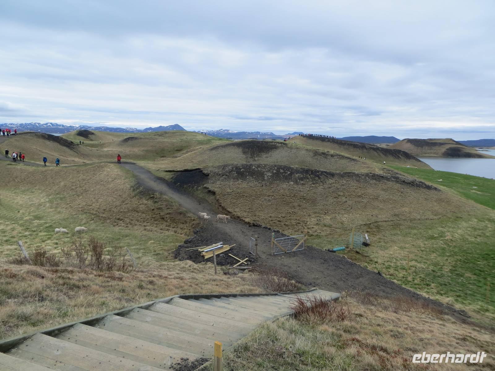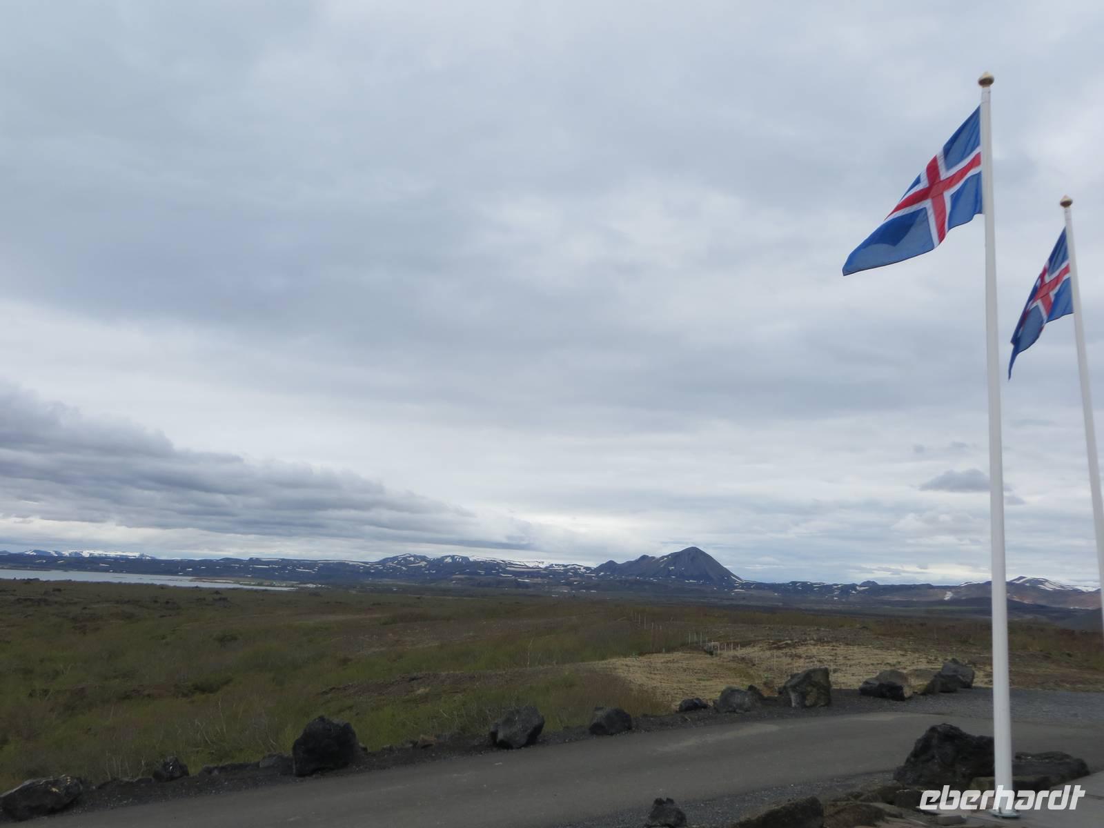 Auf dem Weg zum Schiff erblickten wir das Thermalbad am Myvatn. Am Ufer des Sees tanzten in großen dunklen Wolken viele, schwarze Mückenschwärme. Es soll pro Jahr 2.500 Tonnen Mücken am See geben: Das wären pro Jahr, wenn eine Mücke ca. 2,5 Milligramm wiegt,