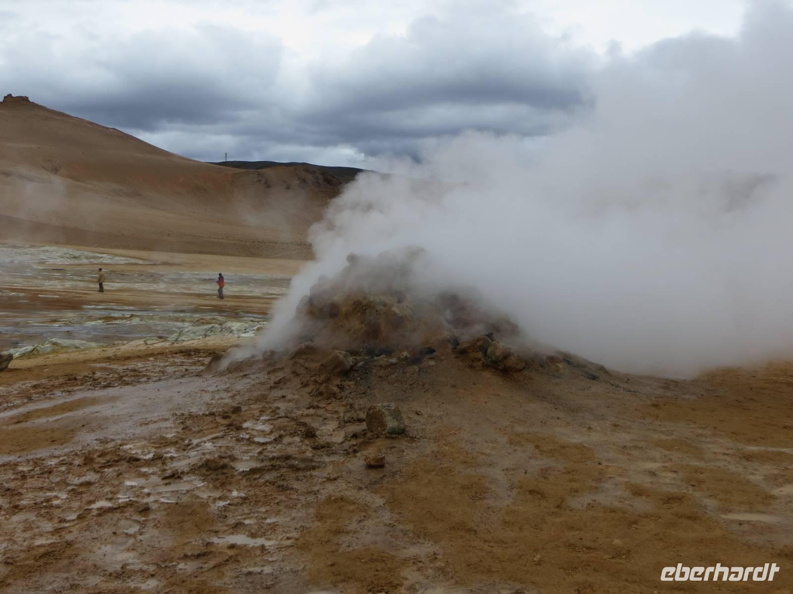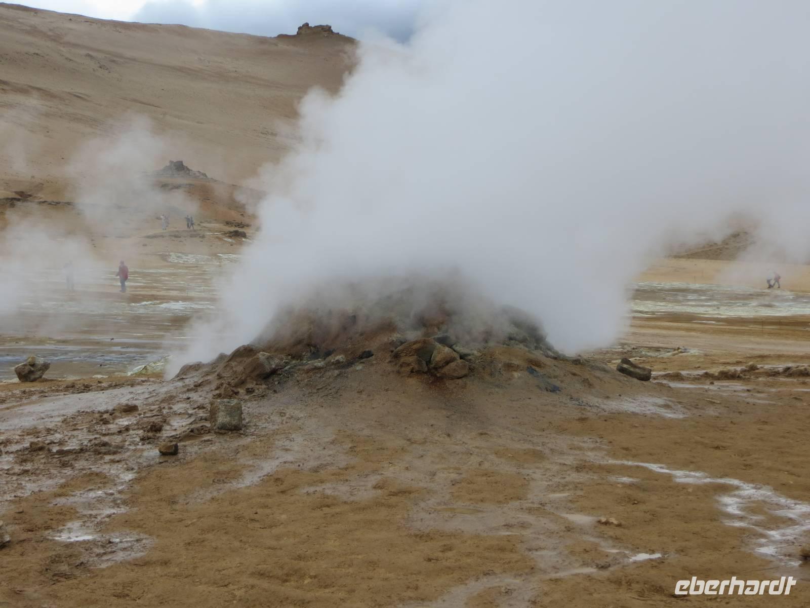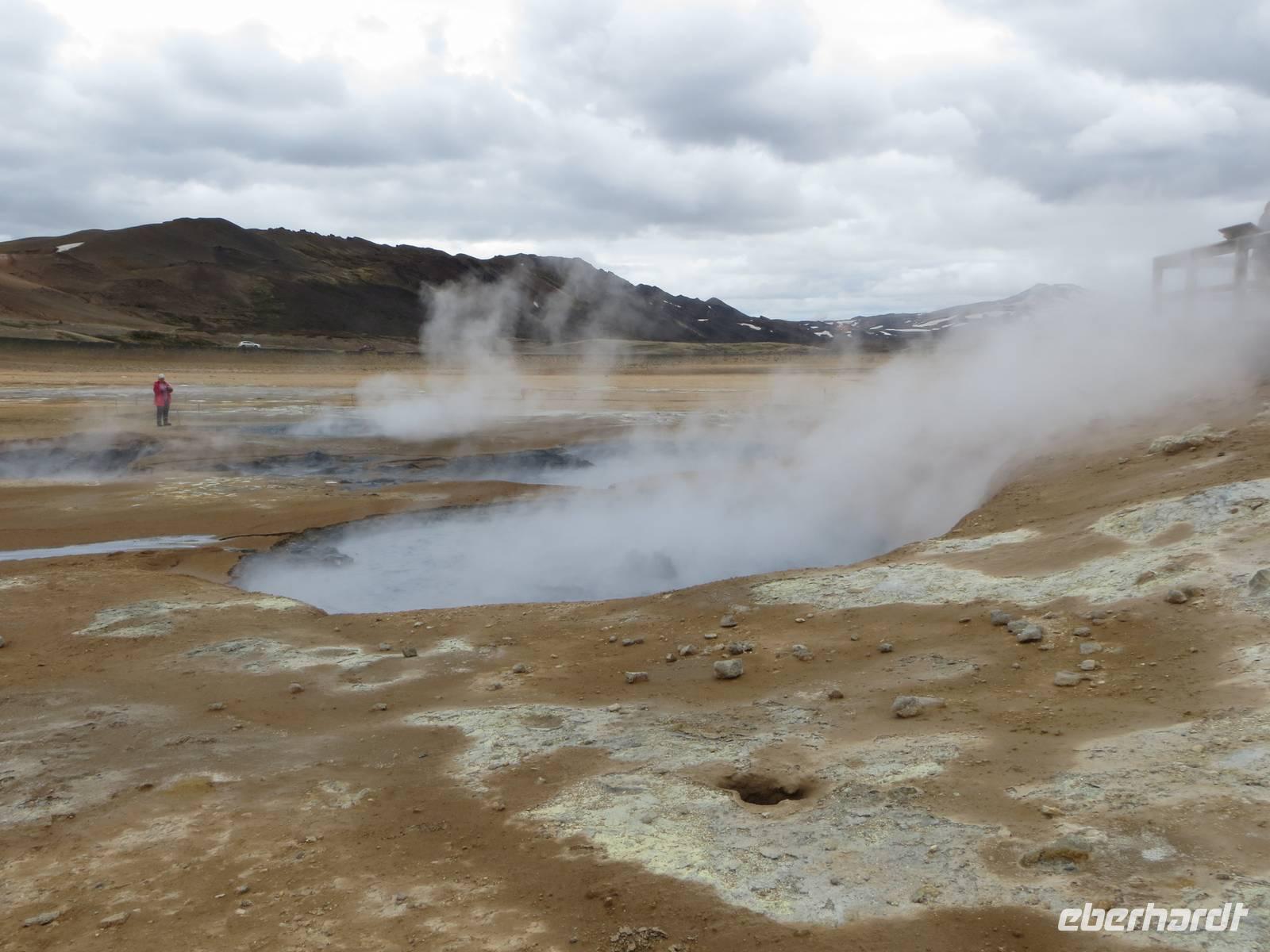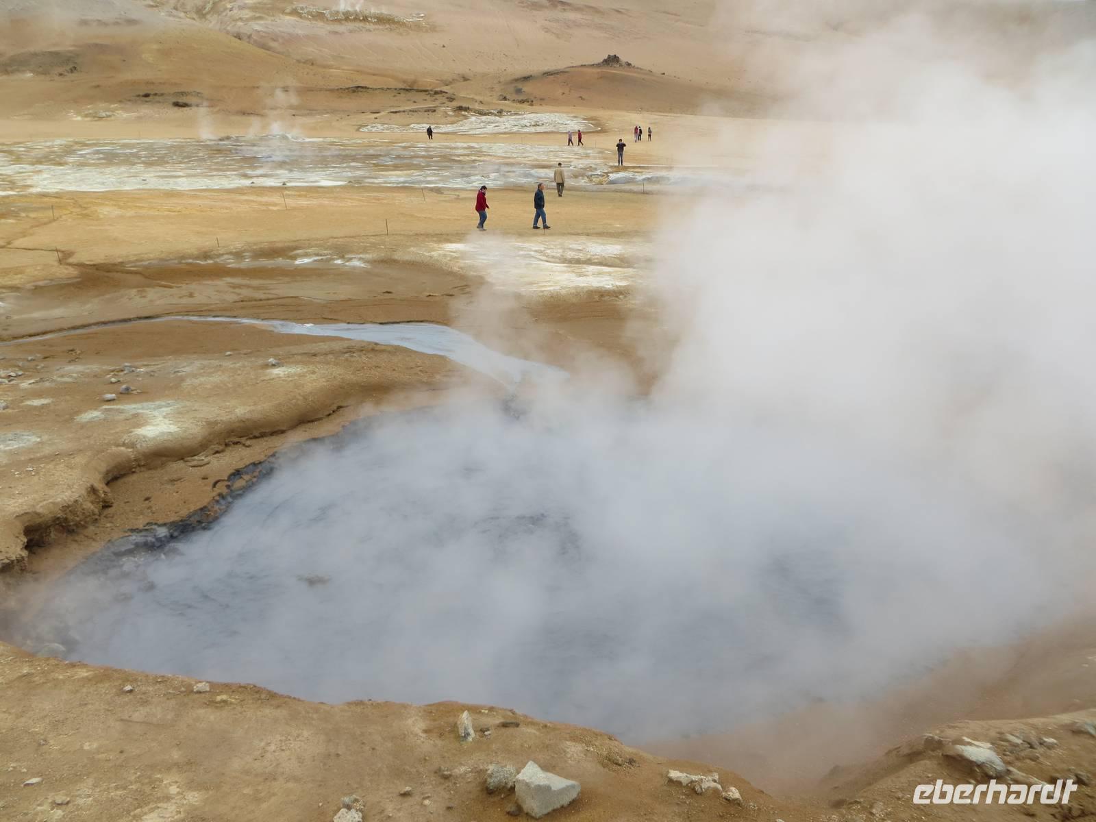 Vorbei am Kleinen Graben der Grenze zwischen der amerikanischen und eurasischen Erdplatte erreichten wir die Schlammpfuhlen von Námaskard. Walter hatte uns umfassend die Erdaktivitäten erläutert. Es blieb genügend Zeit, zum Besichtigen und Staunen ... Es brodelte, dampfte und fauchte ... Wir erhielten hier einen äußerst eindrucksvollen Einblick in die Erdgeschichte und das Geschehen im Erdinneren.