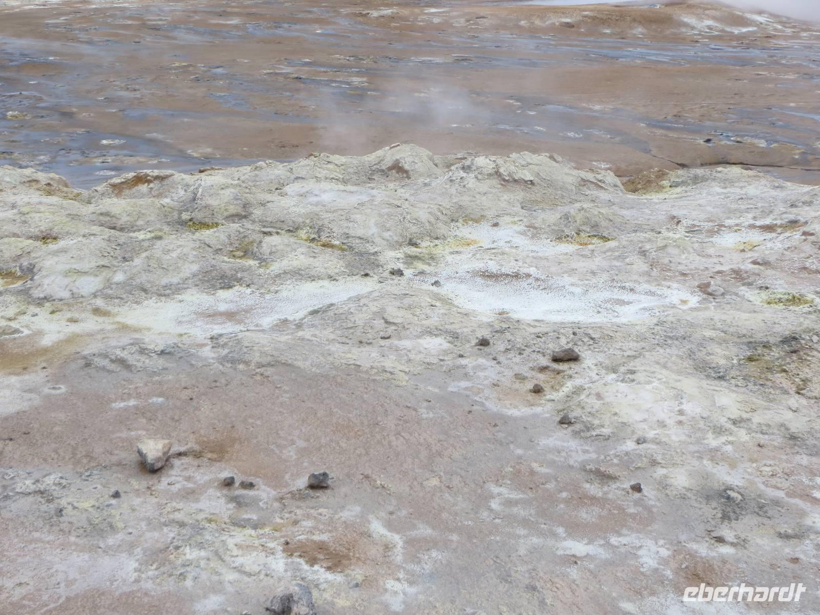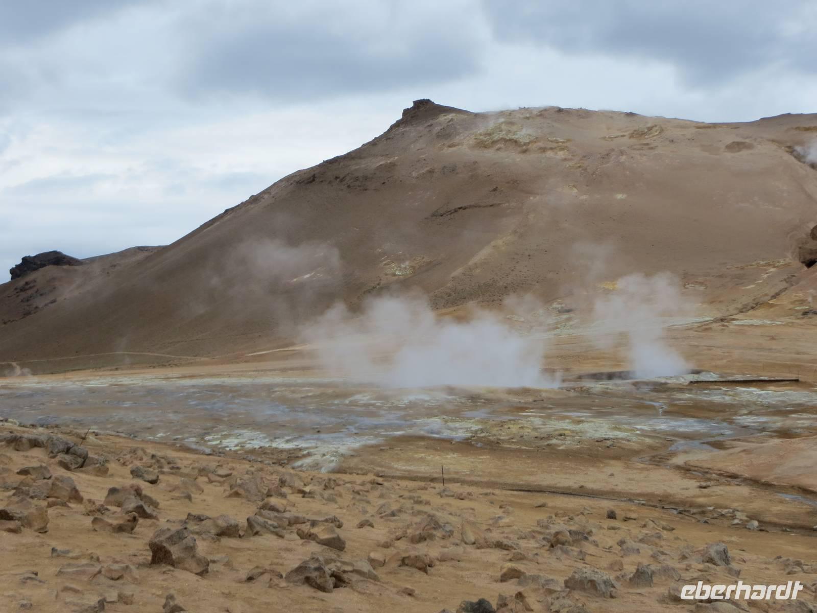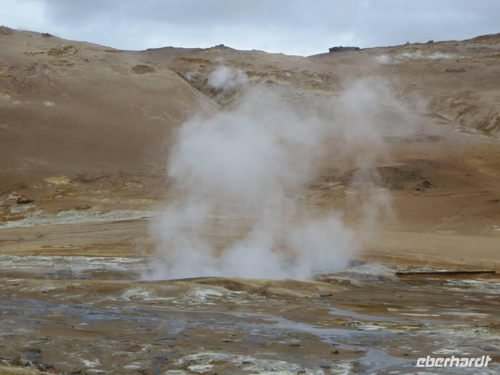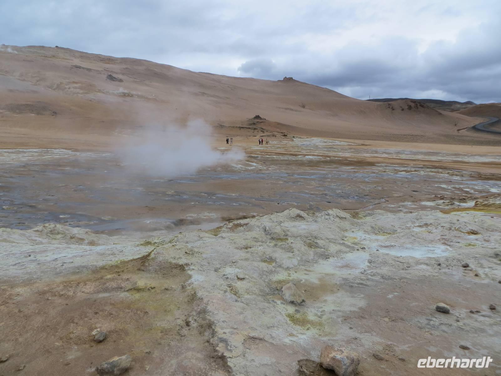 Vorbei am Kleinen Graben der Grenze zwischen der amerikanischen und eurasischen Erdplatte erreichten wir die Schlammpfuhlen von Námaskard. Walter hatte uns umfassend die Erdaktivitäten erläutert. Es blieb genügend Zeit, zum Besichtigen und Staunen ... Es brodelte, dampfte und fauchte ... Wir erhielten hier einen äußerst eindrucksvollen Einblick in die Erdgeschichte und das Geschehen im Erdinneren.