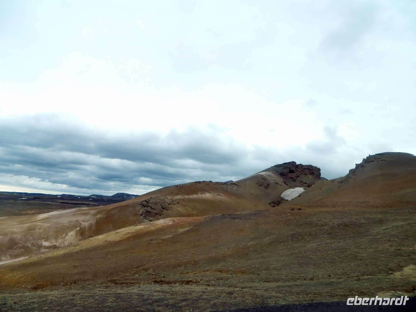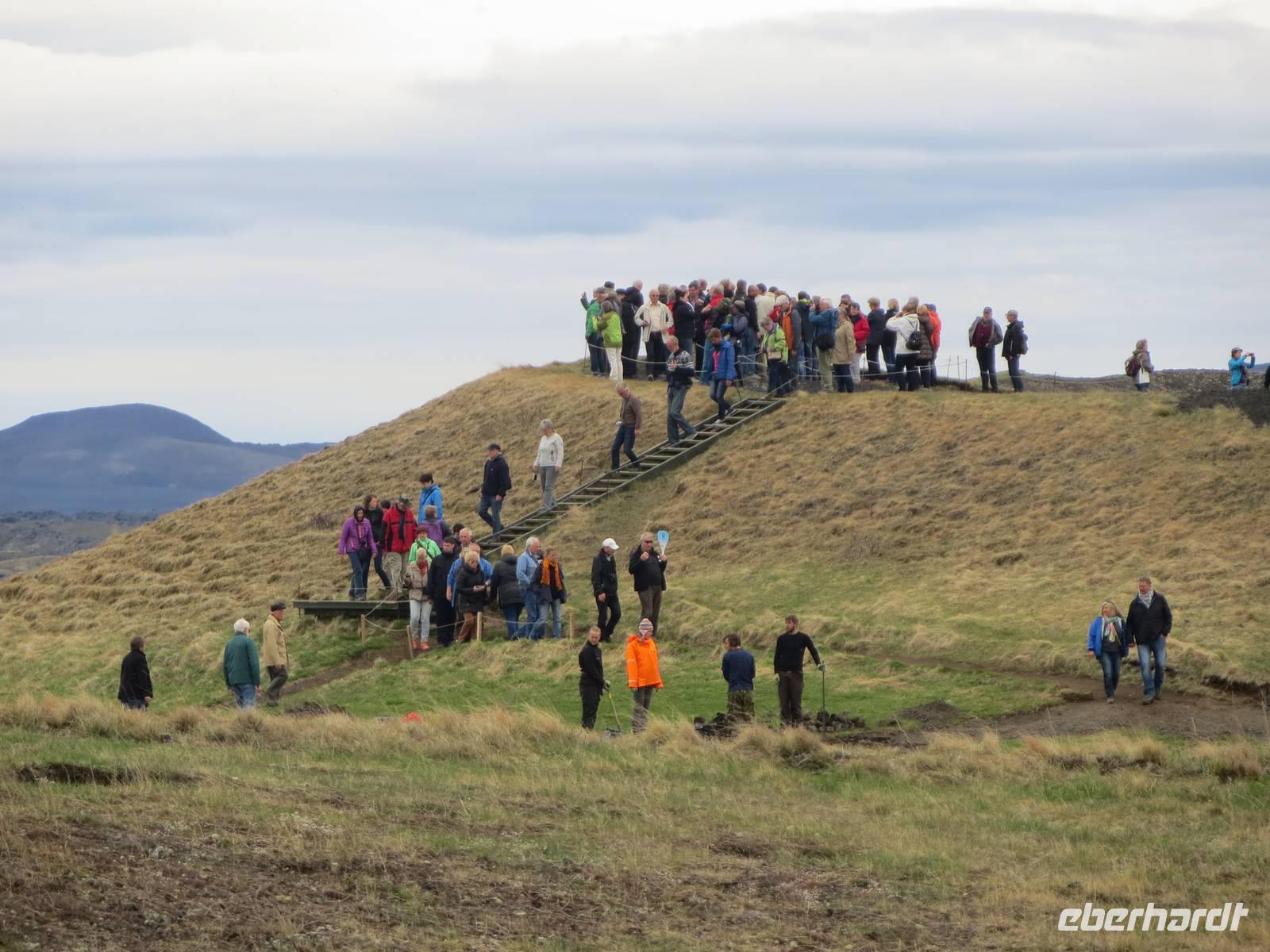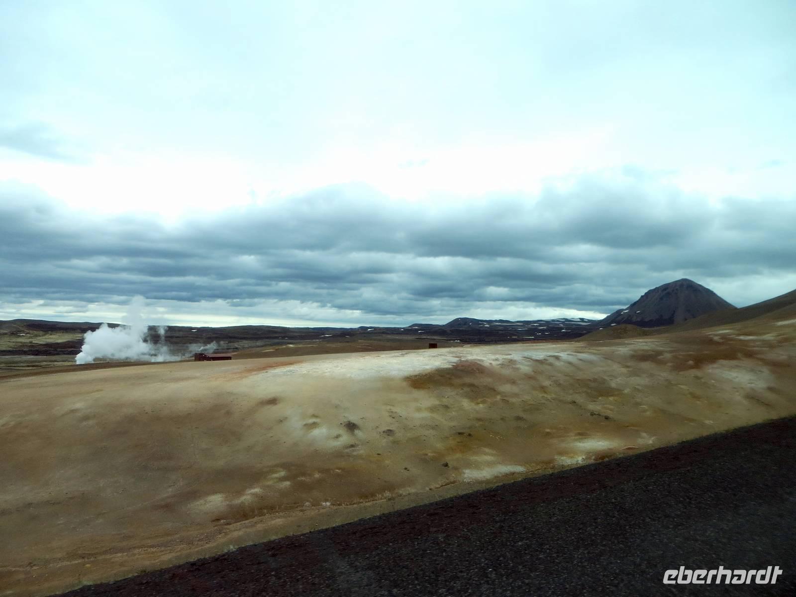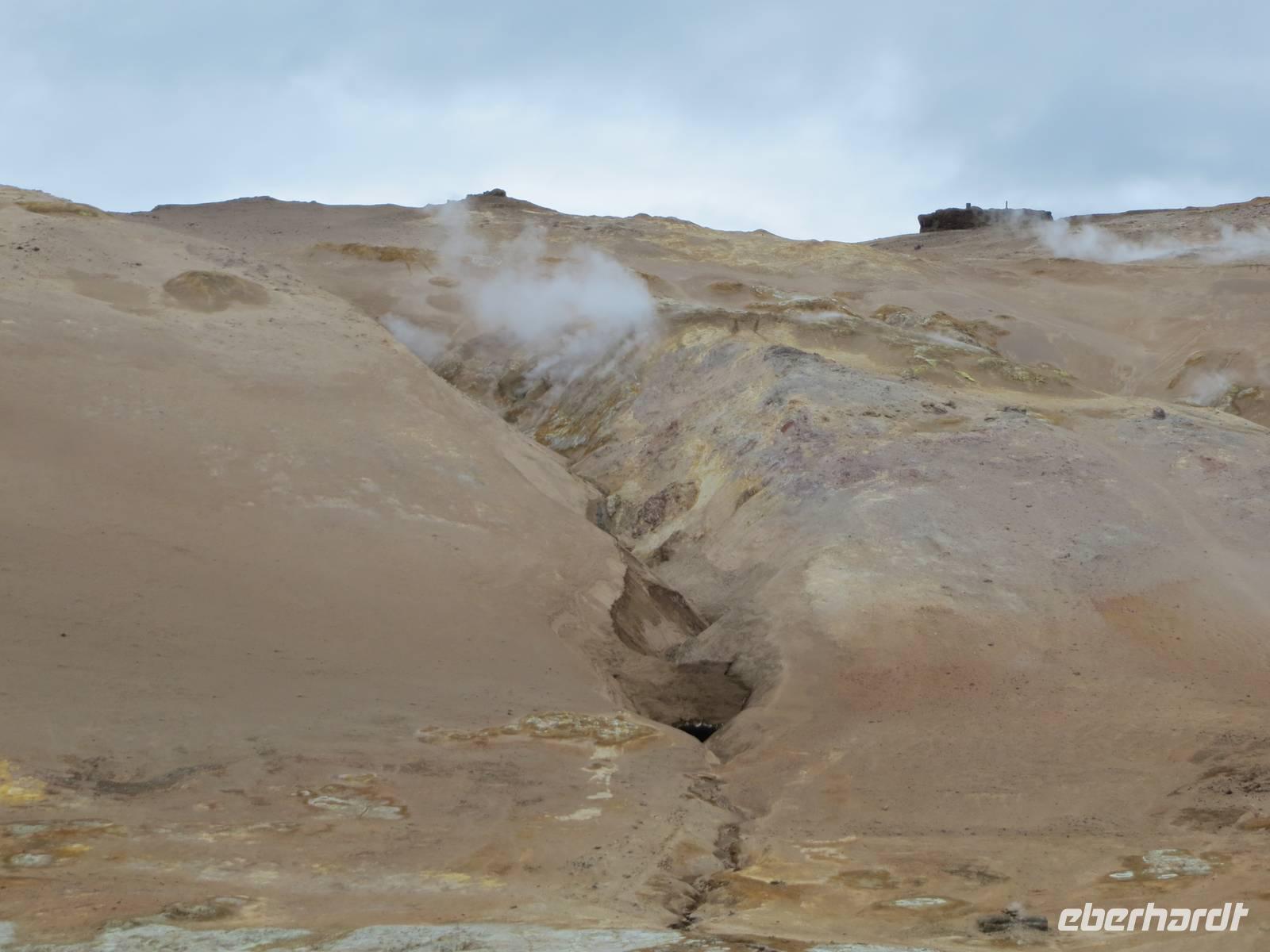 Vorbei am Kleinen Graben der Grenze zwischen der amerikanischen und eurasischen Erdplatte erreichten wir die Schlammpfuhlen von Námaskard. Walter hatte uns umfassend die Erdaktivitäten erläutert. Es blieb genügend Zeit, zum Besichtigen und Staunen ... Es brodelte, dampfte und fauchte ... Wir erhielten hier einen äußerst eindrucksvollen Einblick in die Erdgeschichte und das Geschehen im Erdinneren.