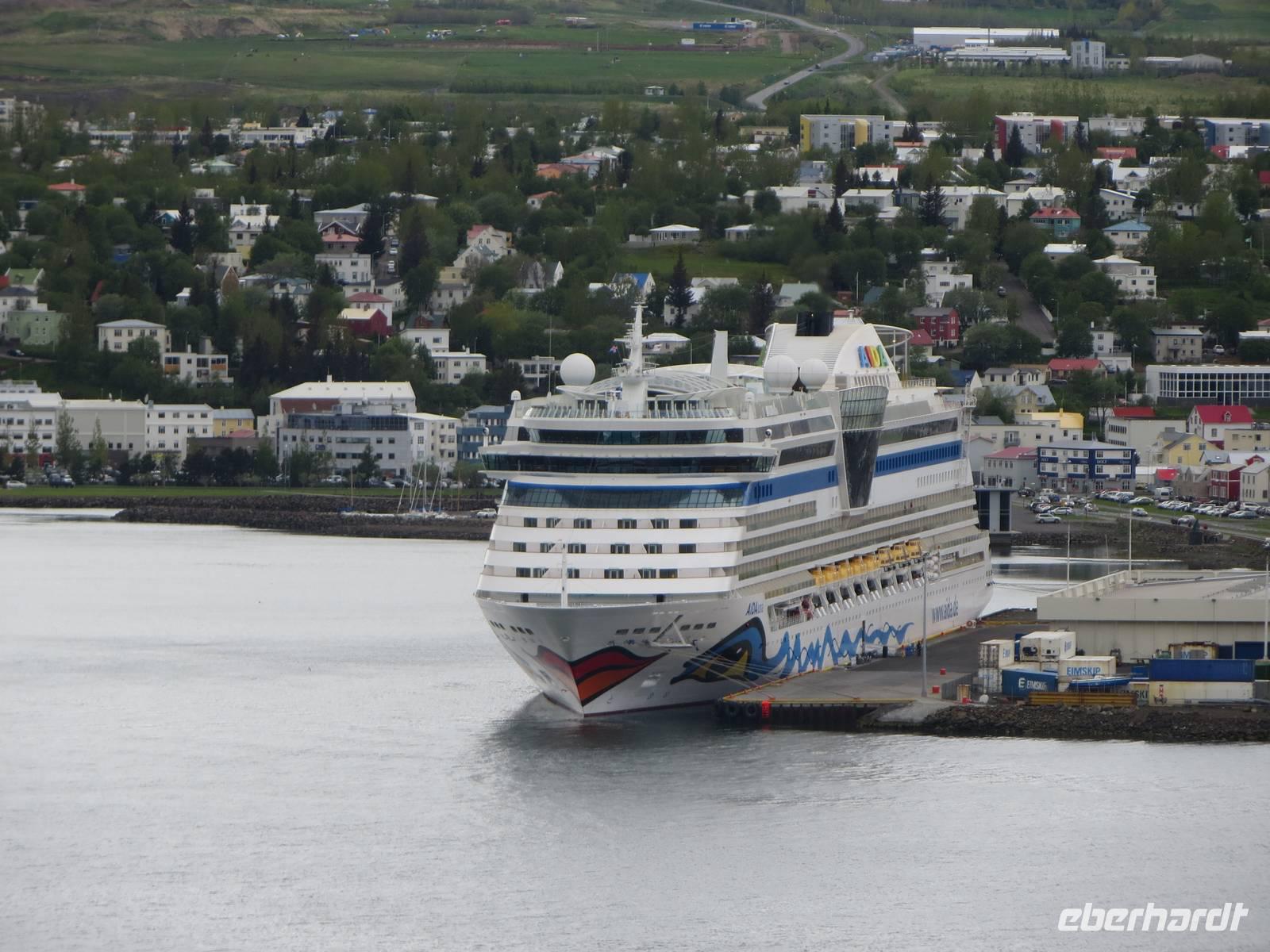 Auf dem Rückweg zum Schiff sahen wir die Silhouette Reykjaviks, einer modernen Stadt mit ihren zwei Hauptsehenswürdigkeiten, der Hallgrimskirche und dem Aussichtspunkt „Perlan" auf dem Öskjulid-Berg. Unter der prächtigen Glaskuppel befinden sich die Heißwassertanks der Stadt. In diesen sollen sich 24 Millionen Liter 85 °C heißen Wassers befinden. Die Energie der Erde, egal ob als heißes Wasser oder Erdwärme, wird auf Island vielfältig genutzt. Wir erfreuten uns am Panoramablick auf die Stadt mit der AIDAluna im Hafen. Gern hätten wir noch mehr kennengelernt, doch „Alle Mann an Bord" ist Gesetz. Pünktlich legten wir in Richtung Westfjorde ab und genossen die Ausfahrt aus Reykjavik. Am Abend lauschten wir der Show „Yes Sir, I can Boogie" im Theatrium.