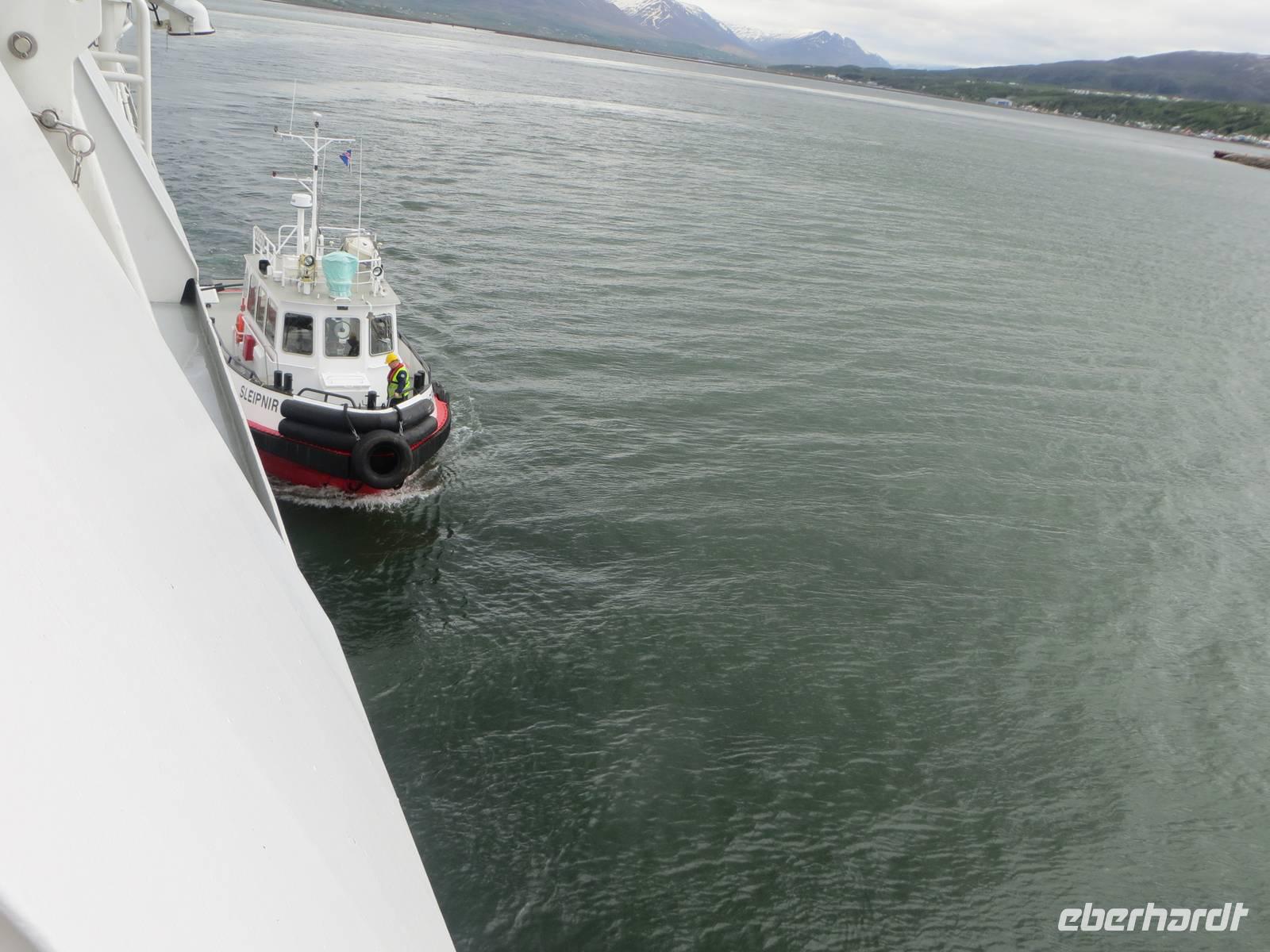 Wieder konnten wir eine ruhige Nacht an Bord verbringen, fast unbemerkt hatten wir den Nördlichen Polarkreis überquert. Nun sollte die Sonne nicht mehr unter- und aufgehen. Der Morgen brachte uns eine neue Facette der Naturgewalten: dichten Nebel und Kälte 5 °C, eigentlich sollte es bewölkt sein und 10 °C. Nun hieß es die Garderobe wechseln, Mützen, Schall, Handschuhe und dicke Jacken anziehen. Sehr langsam, fast zögerlich blinzelte die Sonne hinter dichten Wolken hindurch. Der Wind blieb schneidig und kalt. Ich stimmte unsere Gäste erneut mit einem Vortrag auf ein Reise mit AIDA ein: Unsere 10-tägige Tour mit AIDAbella im Mai 2016 im Östlichen Mittelmeer.