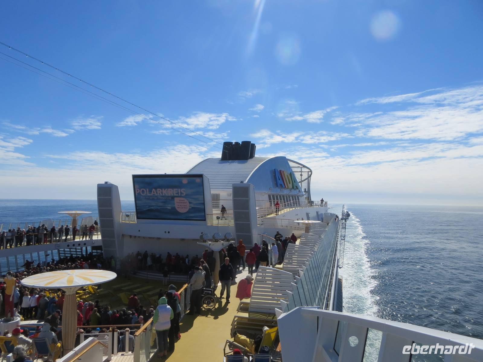 Natürlich hatten wir erneut die Qual der Wahl, aus dem vielfältigen Bordprogramm das Passende auszusuchen. Mittags klarte der Himmel auf, es wird sonnig bei blauem Himmel ... dann ist es endlich soweit: 15.00 Uhr erleben wir unsere stimmungsvolle Polarkreistaufe in Winterrobe. Natürlich wollen wir die Eisbären sehen ... so schallte unser Ruf über das Pooldeck. Unser Kapitän ließ es sich nicht nehmen und unterzeichnete persönlich die Urkunden für diese Taufe. Trotz Sonne pur, sicher nicht nur angenehm, denn es dauerte mehr als zwei Stunden und der Wind war eisig kalt ... das Meer völlig glatt. In windgeschützten Ecken konnten wir im Freien sitzen und uns sonnen - nördlich des Polarkreises!
