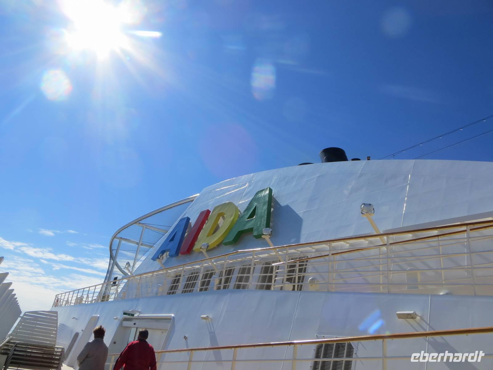 Schmuck strahlte sie ganz in Weiß mit der Sonne um die Wette, die AIDAluna. Wir wurden herzlich begrüßt und gingen sofort zum Einschiffen. Alle Formalitäten konnten wir zügig und ohne langes Anstehen erledigen. Bereits 16.00 Uhr hatten alle „Seefahrer auf Zeit" ihre Kabine, das zu Hause für die nächsten 17 Nächte, geentert. Auf die Koffer mussten wir noch etwas warten ... aber das ist verständlich. Unser Kapitän, Marc-Dominique Tidow, begrüßte uns alle über die Bordlautsprecher und erläuterte den Ablauf der Seenotrettungsübung. 17.00 Uhr ertönte das Signal und wir begaben uns zu unserer Musterstation. Man konnte erkennen, dass hier eine eingespielte Crew arbeitet.