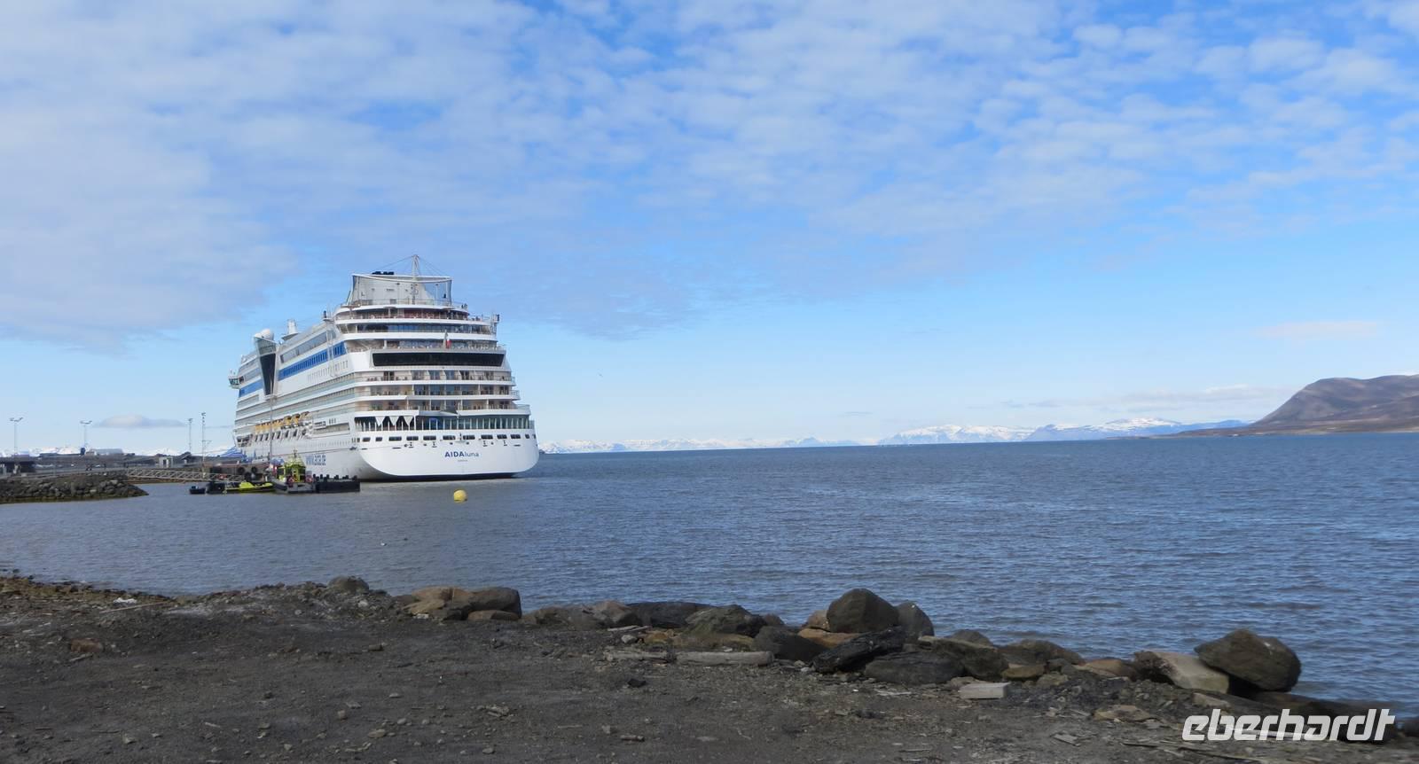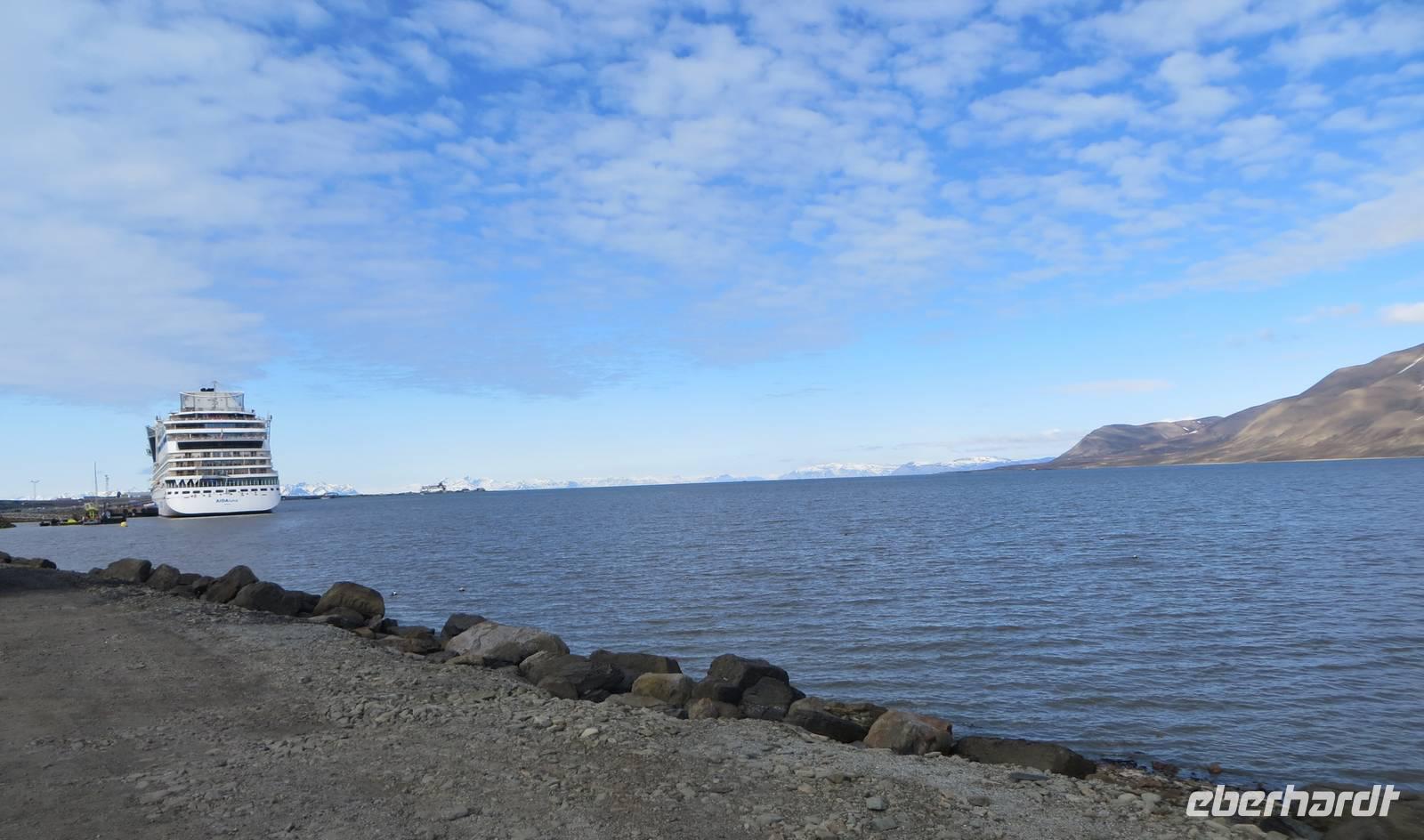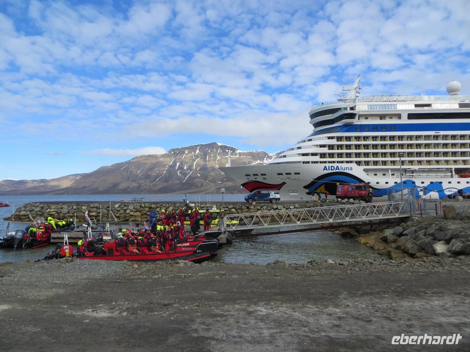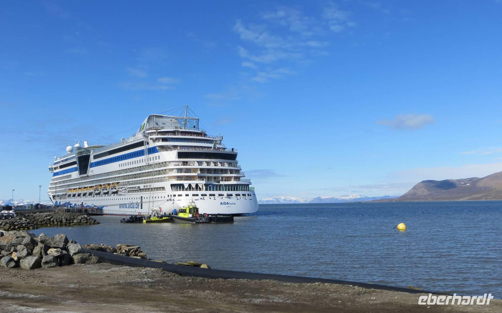 Die Nacht war erneut ruhig. Ganz langsam glitt die AIDAluna durch den Isfjord, erneut vor einer majestätischen Bergkulisse, der Siedlung Longyearbyen entgegen. Pünktlich 08.00 lagen wir am Hafenkai auf Spitzbergen. Ein gekonntes Manöver der Männer von der Brücke, doch das stimmte nicht ganz, denn die AIDAluna wurde heute von zarter Frauenhand gesteuert: Zweiter Offizier Isabell hatte das Kommando. Spektakulär, die Pier war zu kurz, und so ragte das Schiff einfach links und rechts darüber hinaus. Wir konnten problemlos am Deck 3 aus- und einsteigen. Alle fieberten dem Erlebnis Spitzbergen entgegen. Die Sonne lachte mit uns um die Wette und dies bei wohligen 5 °C und in der Sonne gefühlten 10 °C, frühlingshaft und für uns äußerst angenehm.