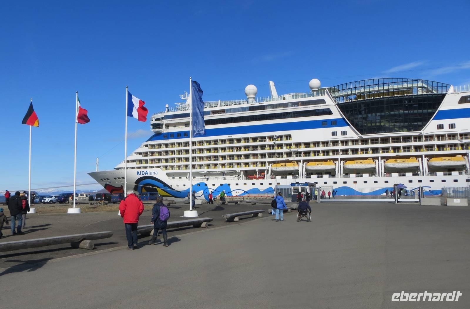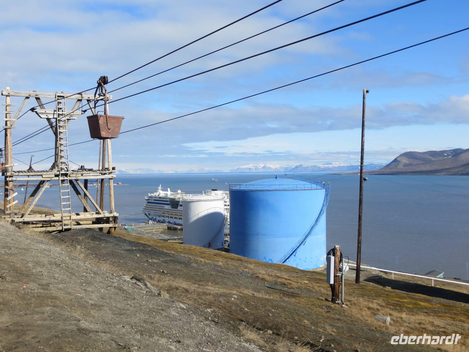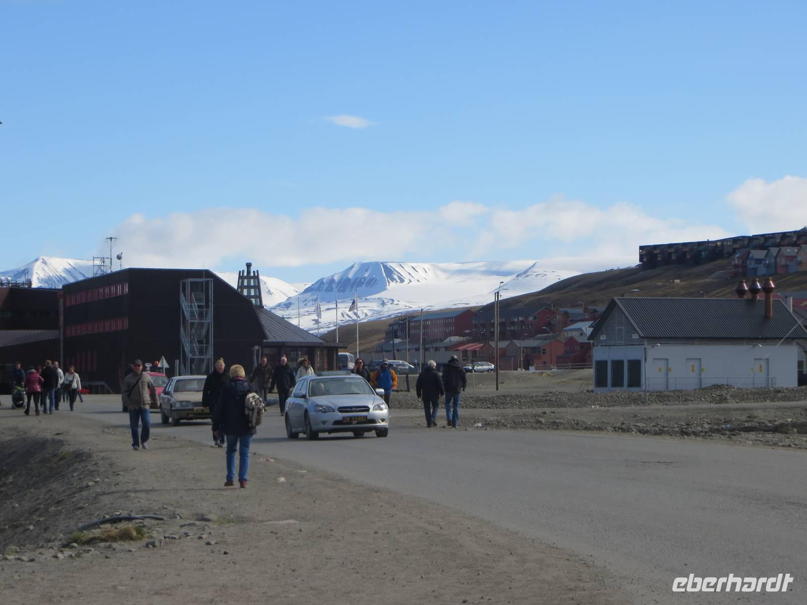 Die Nacht war erneut ruhig. Ganz langsam glitt die AIDAluna durch den Isfjord, erneut vor einer majestätischen Bergkulisse, der Siedlung Longyearbyen entgegen. Pünktlich 08.00 lagen wir am Hafenkai auf Spitzbergen. Ein gekonntes Manöver der Männer von der Brücke, doch das stimmte nicht ganz, denn die AIDAluna wurde heute von zarter Frauenhand gesteuert: Zweiter Offizier Isabell hatte das Kommando. Spektakulär, die Pier war zu kurz, und so ragte das Schiff einfach links und rechts darüber hinaus. Wir konnten problemlos am Deck 3 aus- und einsteigen. Alle fieberten dem Erlebnis Spitzbergen entgegen. Die Sonne lachte mit uns um die Wette und dies bei wohligen 5 °C und in der Sonne gefühlten 10 °C, frühlingshaft und für uns äußerst angenehm.