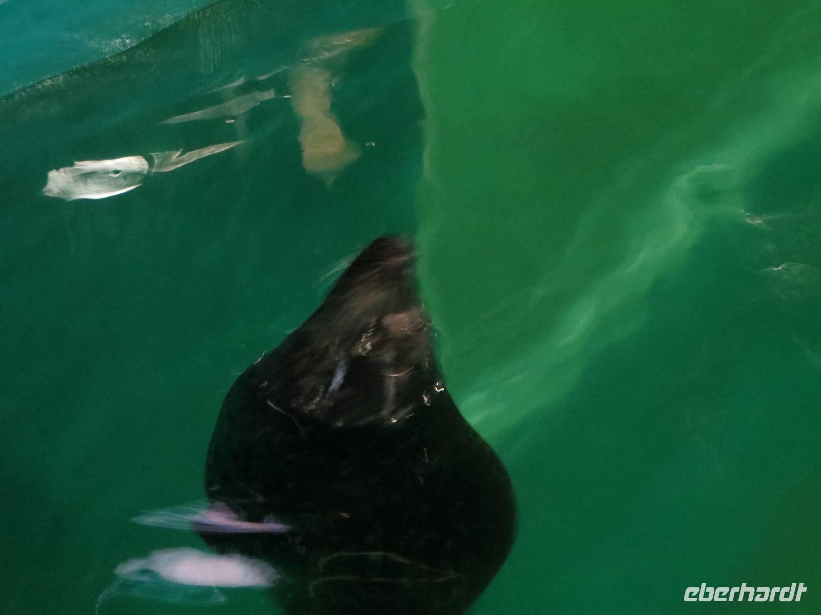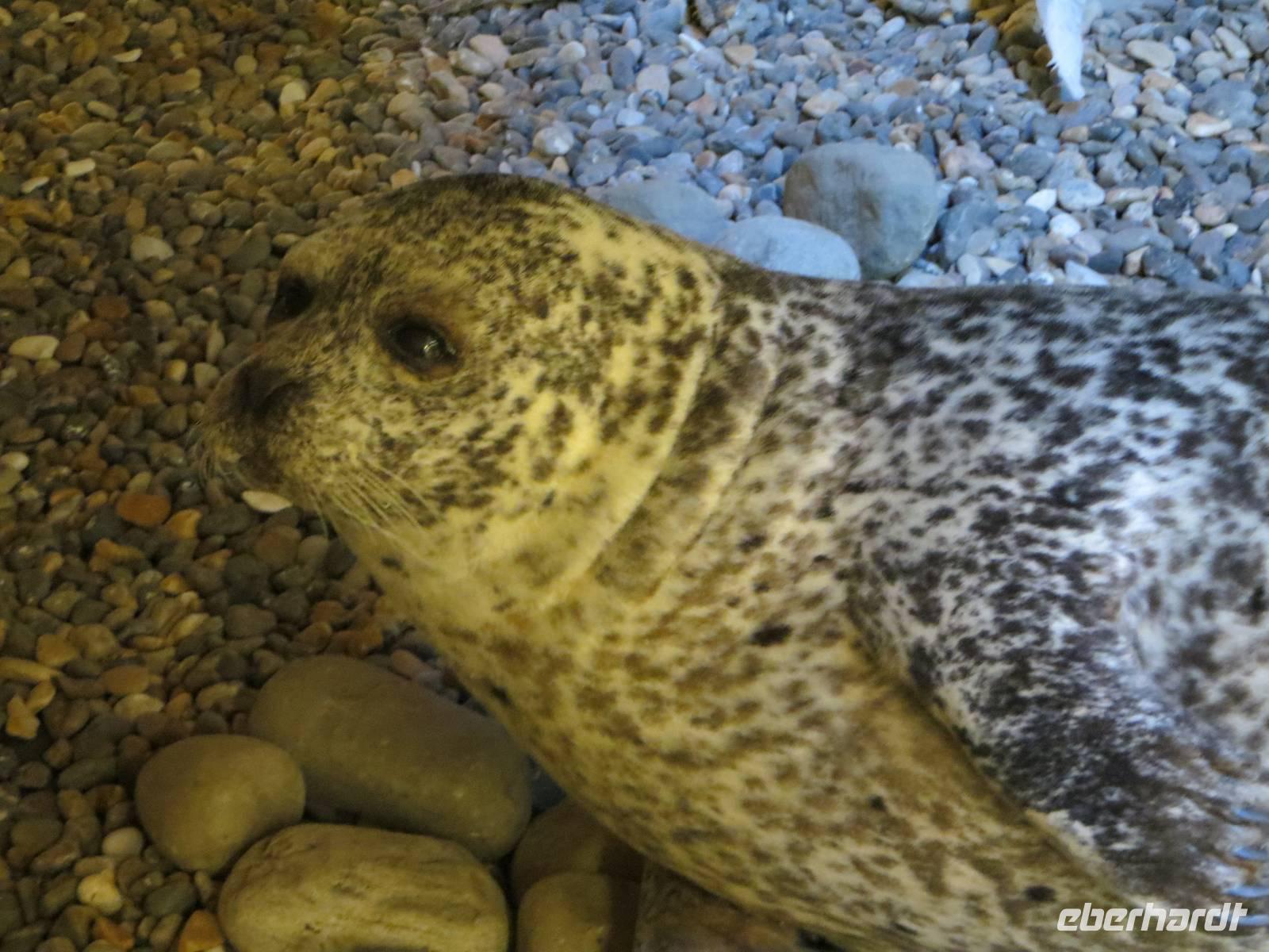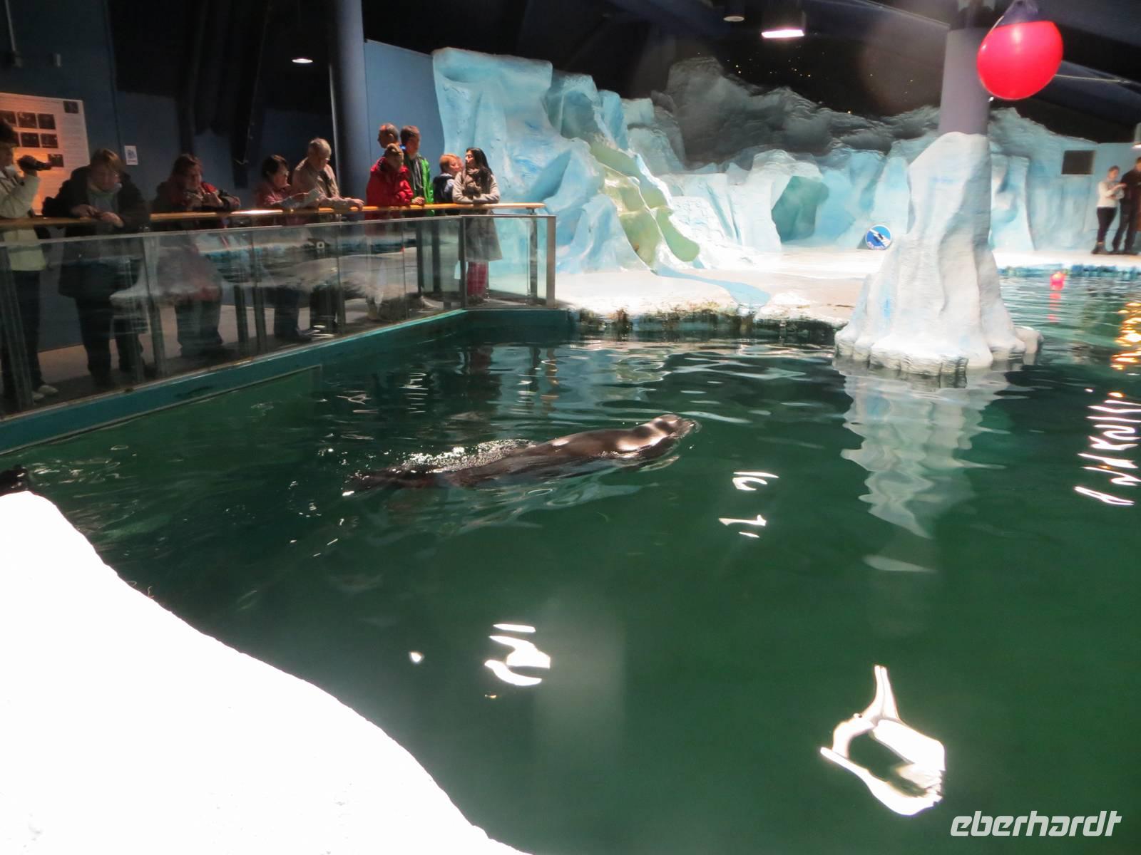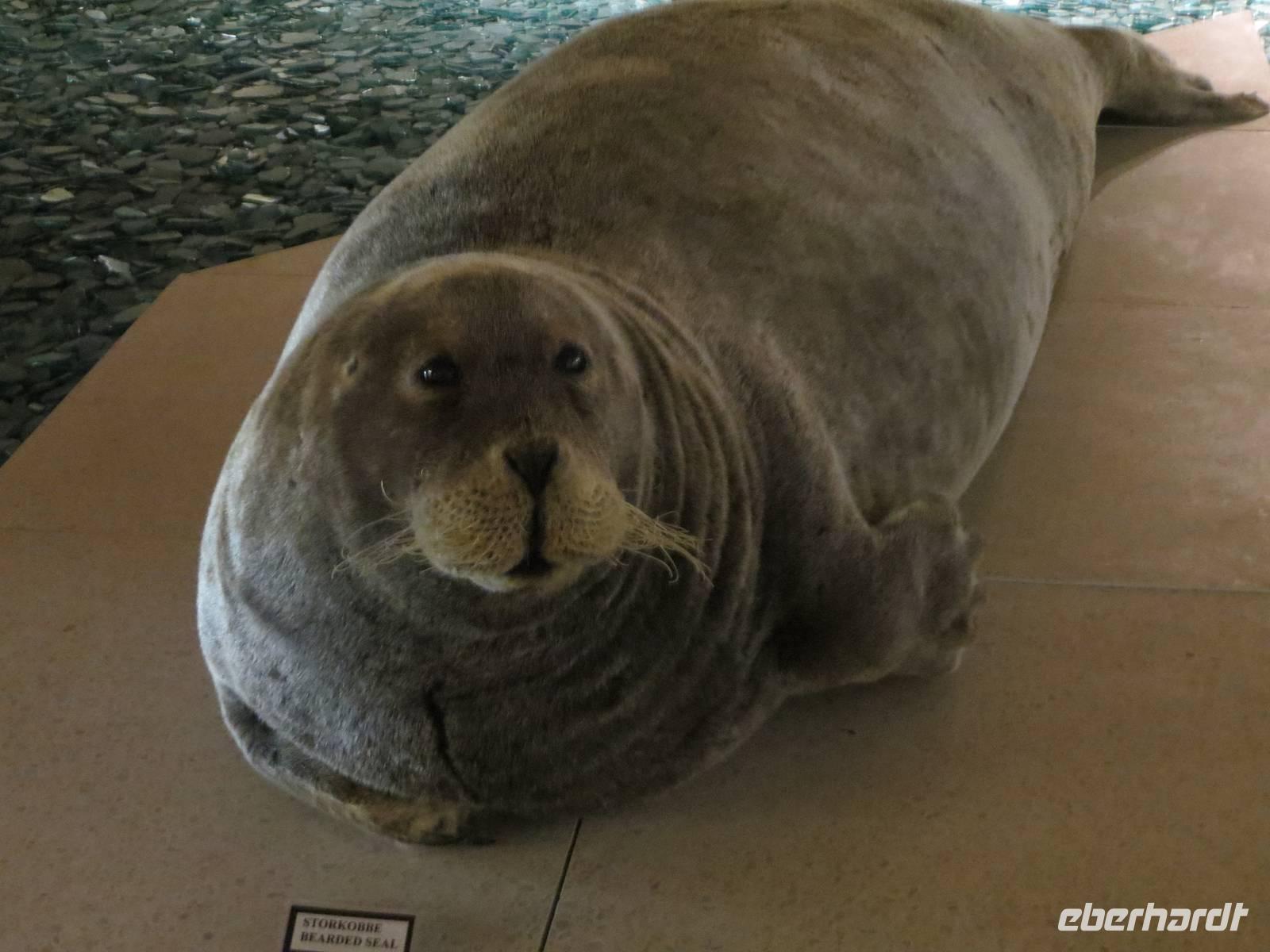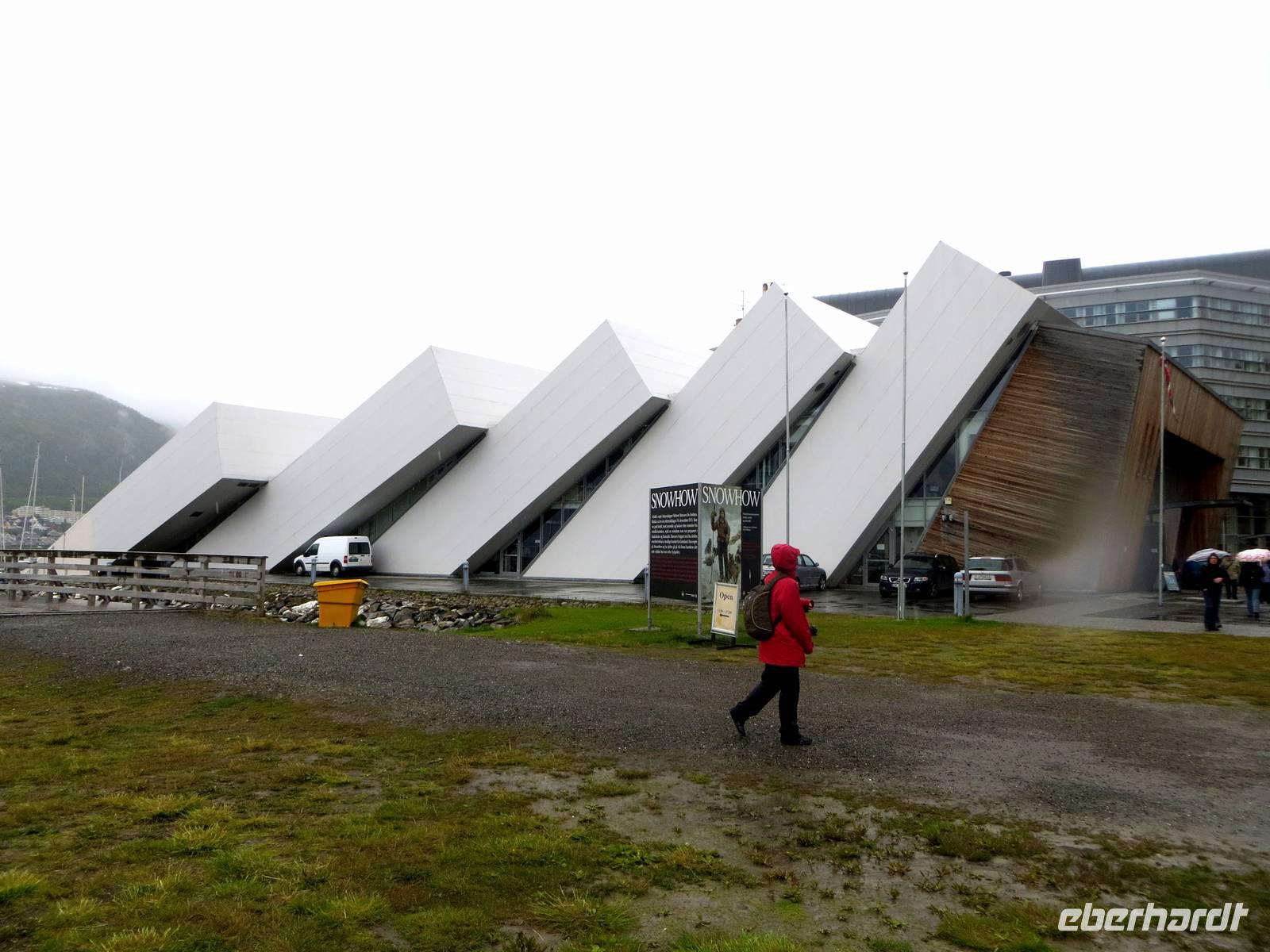 Mit der örtlichen Reiseleiterin Vanessa begaben wir uns auf eine kombinierte Stadtrundfahrt. Sie berichtete von der Bedeutung Tromsøs als Ausgangspunkt vieler Expeditionen in das Polarmeer. So fuhren wir an den Denkmälern von Umberto Nobile und Roald Amundsen vorbei. Zugleich sahen wir die Gebäude der Universität, an der mehr als 10.000 Studenten lernen. Überall erblickten wir Schilder in zwei Sprachen - Norgwegisch und Samisch. In der ethnologischen Abteilung des Tromsø-Museums erhielten wir sehr interessante Informationen zur Geschichte der Samen, der Ureinwohner des Nordens, zum Samischen Parlament und wie heute Traditionen, Sitten und Bräuche gepflegt und belebt werden. Unsere anschließende Panoramafahrt führte uns vorbei an der 1861 vollendeten Domkirche, einer der größten Holzkirchen des Nordens, über die Tromsø-Brücke, fast 1.000 Meter lang, hinüber in die Neustadt. Wollten wir doch mit der Seilbahn auf den 420 Meter hohen Hausberg, den Storsteinen. Aber er hüllte sich in dichte Wolken, aus denen es nun kräftig regnet. Schade! Da ereilte uns die Nachricht, dass die Bahn heute nicht in Betrieb ist. Also, wurde kurz umdisponiert! Für uns ein Glücksfall - es geht zum modernen Polaria-Erlebniscenter, das wie große Eisschollen gestaltet ist. Wir hatten Zeit zu einem ausführlichen Besuch. Der Film „Svalbard - eine arktische Wildnis" weckte in uns die noch so frischen Erinnerungen an unseren Aufenthalt auf Spitzbergen. Wir besichtigten ebenso den Museumsteil. Durch den Unterwassertunnel begaben wir uns zur eindrucksvollen Robbenanlage und zum Aquarium. Alle hat diese aktuelle Programmänderung begeistert.