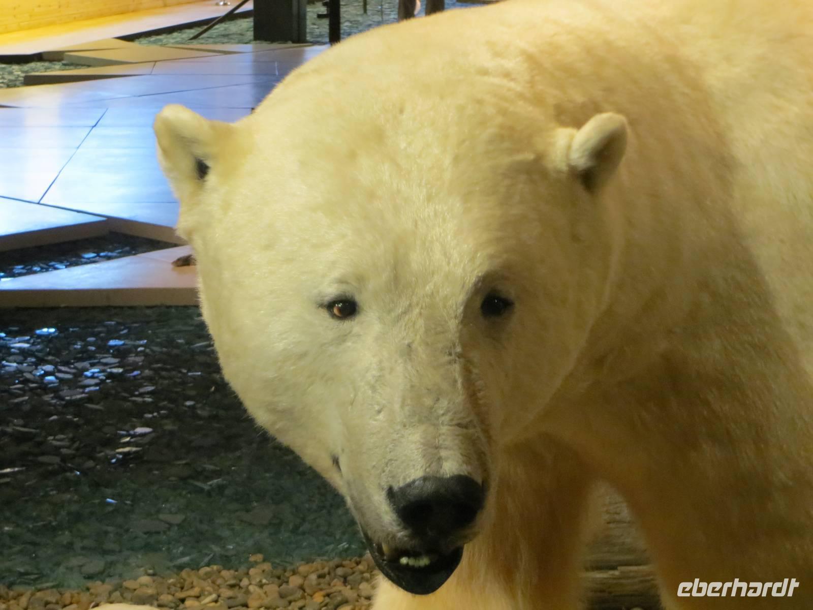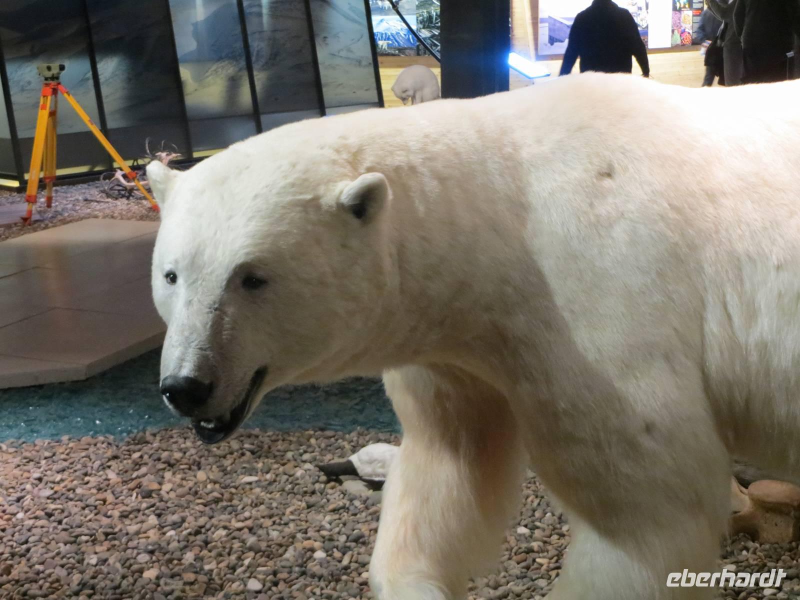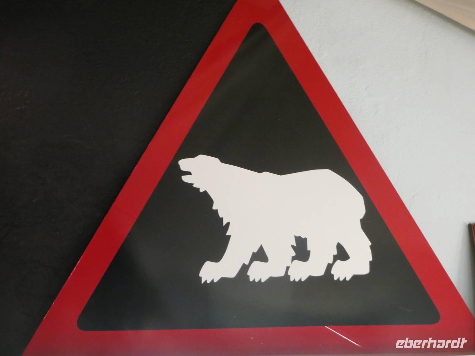 In der Galerie von Svalbard sahen wir anschließend, wie Künstler die Region mit ihren Augen sehen. KunsthandwerkerInnen boten ihre Erzeugnisse zum Erwerb an. In einem kleinen Museumsteil betrachteten wir alte Landkarten mit Darstellungen, wie sich die Menschen früher den Nordpol vorstellten. Und dann Geldscheine: norwegisch, englisch und russisch. Da es den Lohn immer erst am Ende des Monats gab, nutzten die Zechen ihre eigenen Geldscheine zwischendurch. Übrigens: Hier gibt es keinen Kumpeltod, wie wir es kennen. Jeder hat eine Karte für Alkohol pro Monat: 24 Flaschen Bier und 2 Liter Spirituosen pro Monat. Und dies wird bei jedem Erwerb exakt registriert. Zum Schutz vor Eisbären trägt jeder beim Verlassen der Siedlung ein Gewehr und eine Leuchtpistole bei sich. Das ist aus Sicherheitsgründen Vorschrift. Wir haben keinen lebenden Eisbär gesehen, aber es sollen 5.000 dieser mächtigen Tiere gemeinsam mit Walrossen und Robben auf den Inseln Spitzbergens leben.