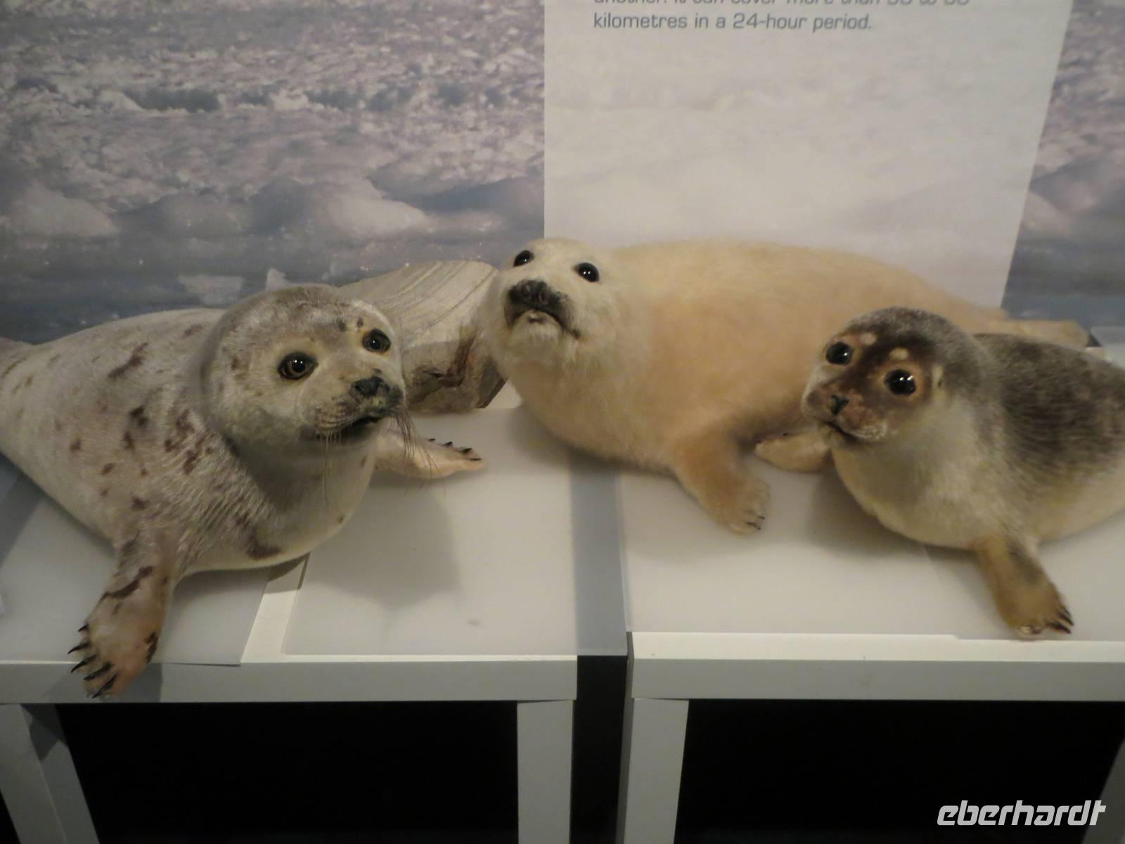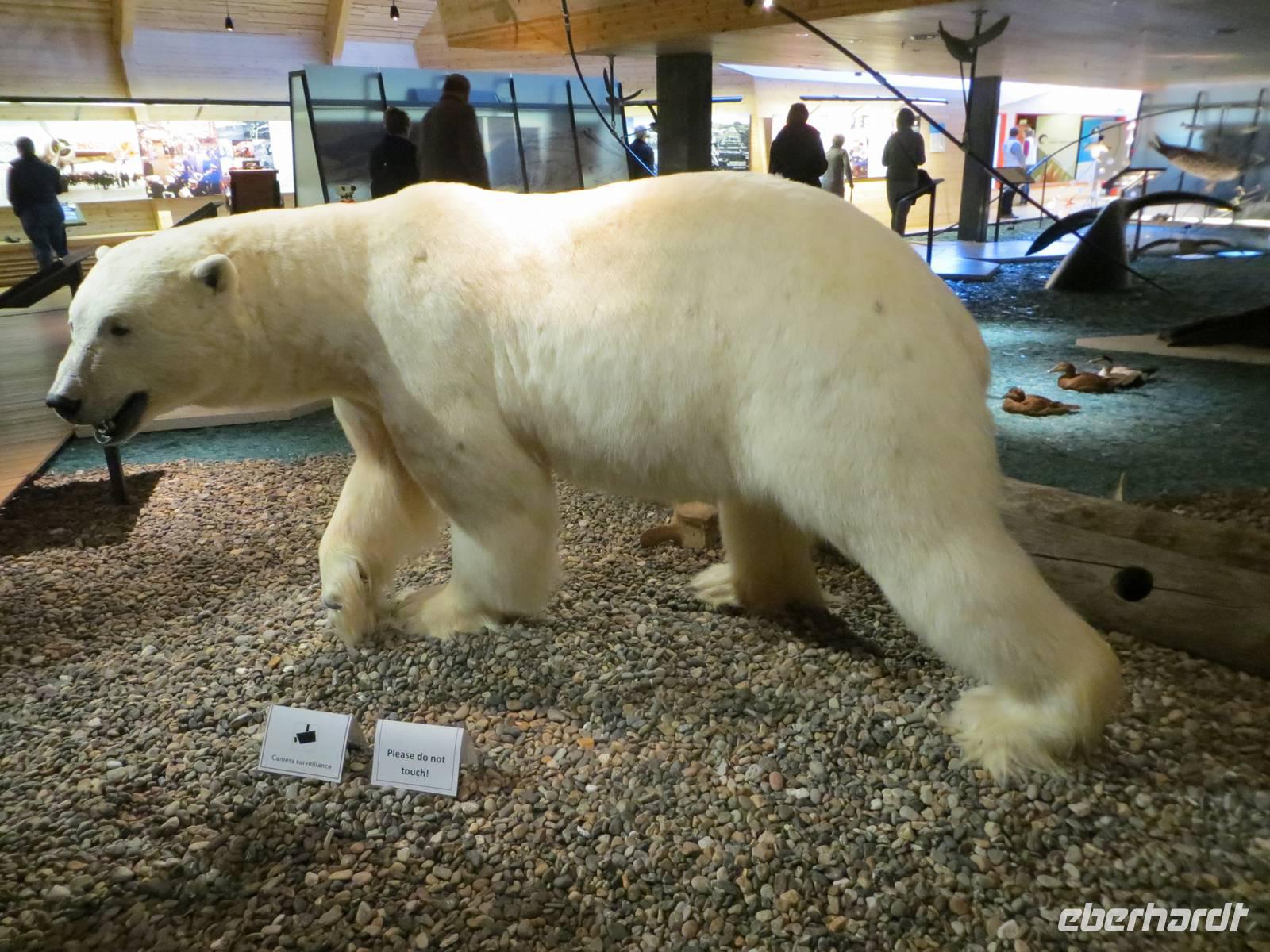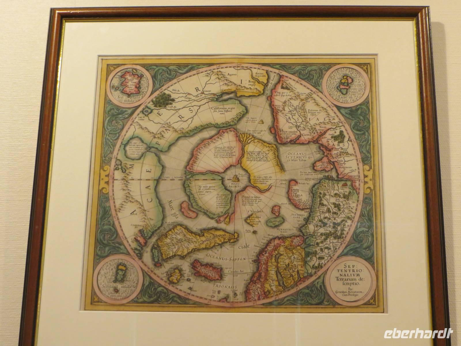 In der Galerie von Svalbard sahen wir anschließend, wie Künstler die Region mit ihren Augen sehen. KunsthandwerkerInnen boten ihre Erzeugnisse zum Erwerb an. In einem kleinen Museumsteil betrachteten wir alte Landkarten mit Darstellungen, wie sich die Menschen früher den Nordpol vorstellten. Und dann Geldscheine: norwegisch, englisch und russisch. Da es den Lohn immer erst am Ende des Monats gab, nutzten die Zechen ihre eigenen Geldscheine zwischendurch. Übrigens: Hier gibt es keinen Kumpeltod, wie wir es kennen. Jeder hat eine Karte für Alkohol pro Monat: 24 Flaschen Bier und 2 Liter Spirituosen pro Monat. Und dies wird bei jedem Erwerb exakt registriert. Zum Schutz vor Eisbären trägt jeder beim Verlassen der Siedlung ein Gewehr und eine Leuchtpistole bei sich. Das ist aus Sicherheitsgründen Vorschrift. Wir haben keinen lebenden Eisbär gesehen, aber es sollen 5.000 dieser mächtigen Tiere gemeinsam mit Walrossen und Robben auf den Inseln Spitzbergens leben.