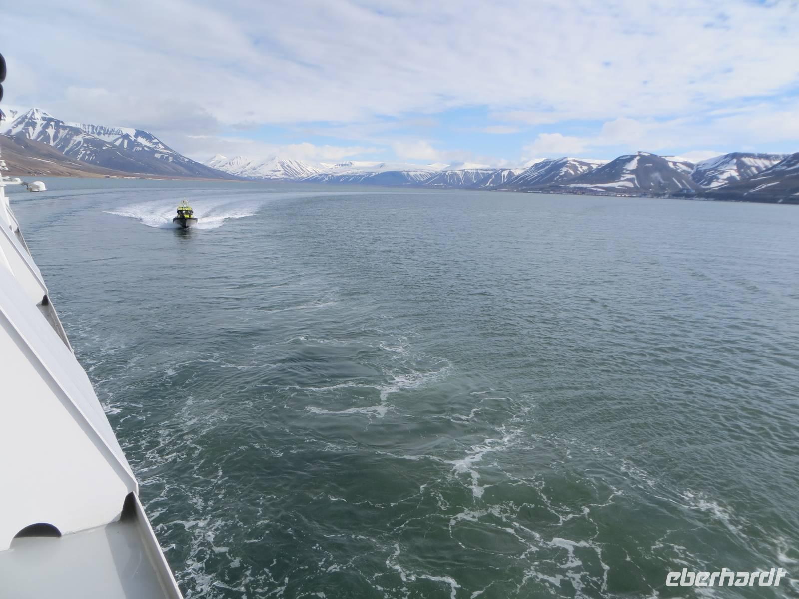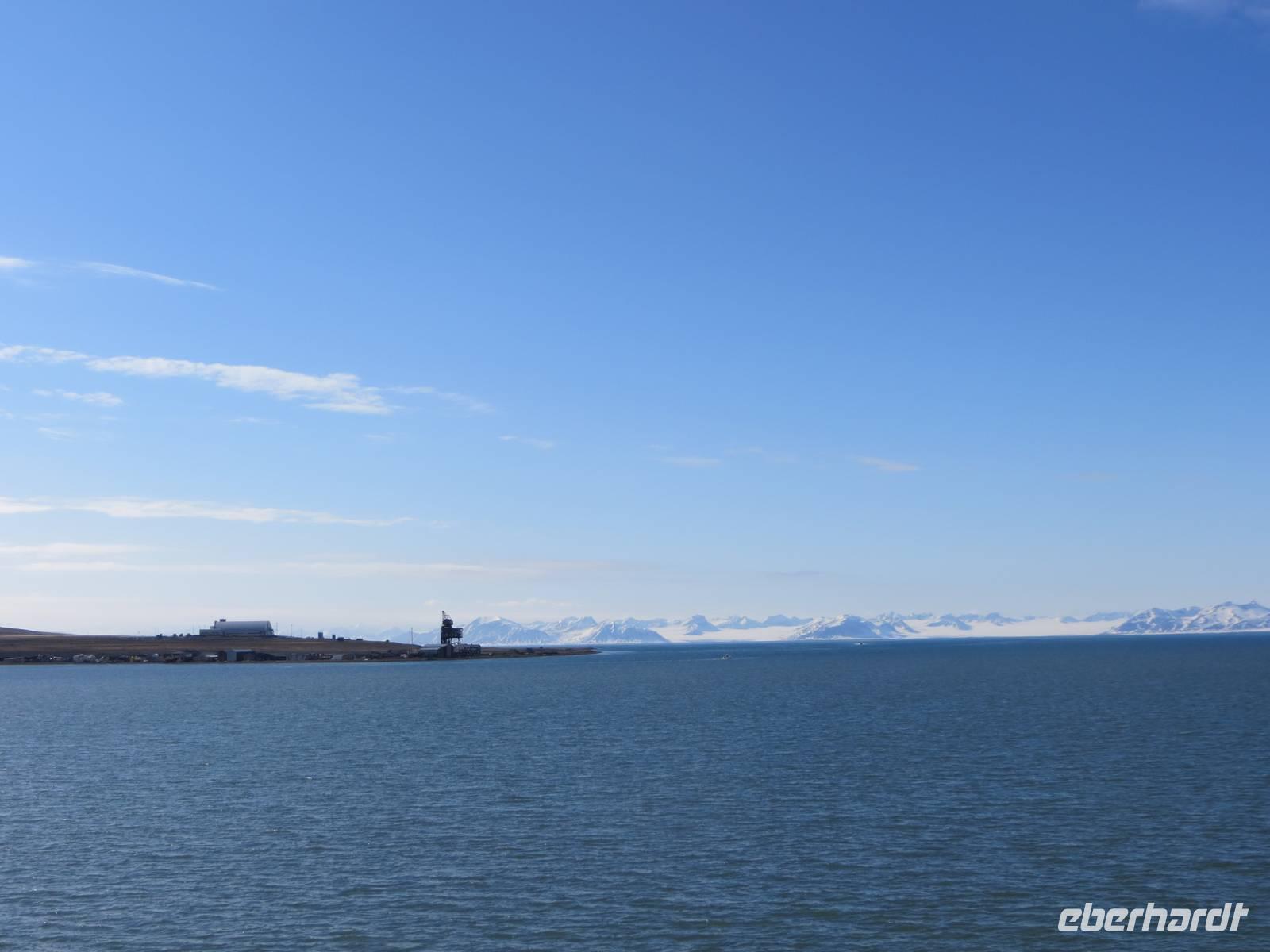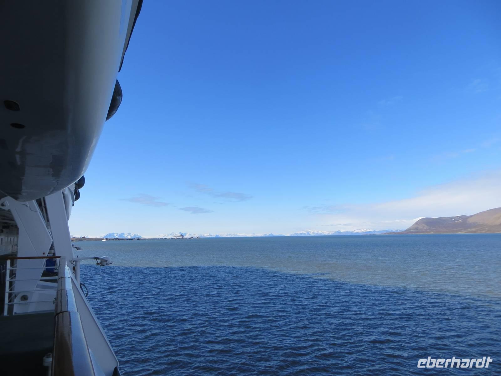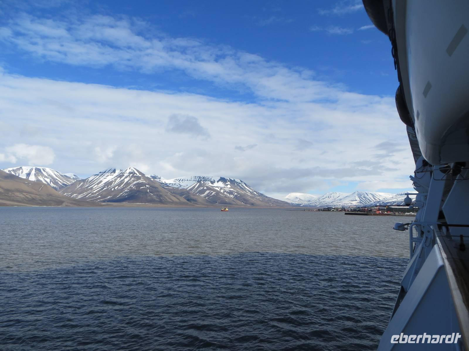 Pünktlich 16.00 Uhr legte unser Schiff von der kleinen Pier wieder ab. Ganz langsam ging es vorbei an den Bergriesen, an der Grube 3 und am Flughafen hinaus in die Barentssee. In der Sonne war es noch immer angenehm. Und so konnten wir uns im Freien an der Landschaft im wahrsten Sinn des Wortes satt sehen, aber das war nicht möglich ... die schnee- und eisbedeckten Gipfel vor strahlend blauem Himmel, dazu imposante Wolkenformationen. Erlebten wir dies alles wirklich? Es war ein Traum!