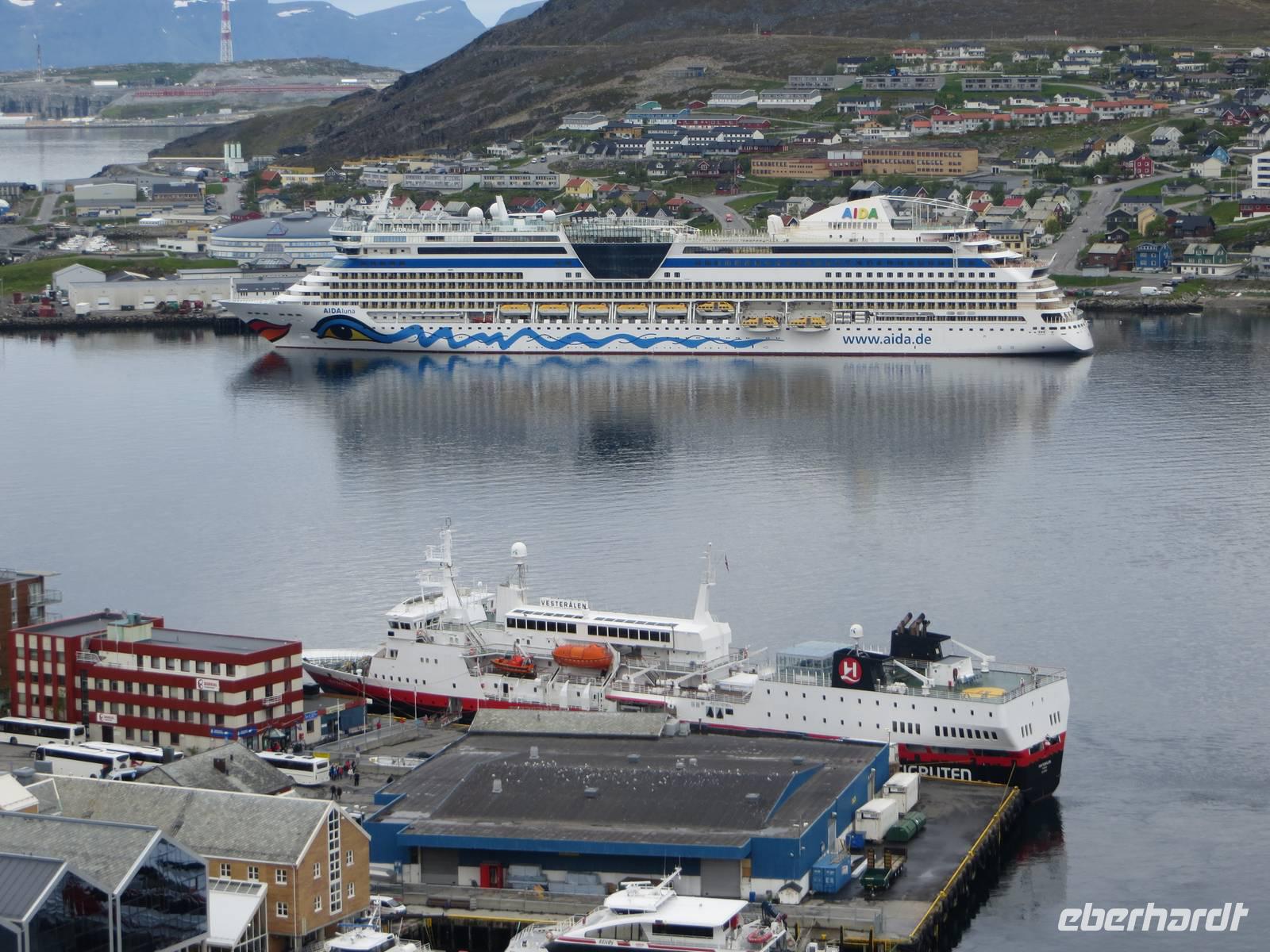 Der Nachmittag blieb für individuelle Besichtigungen oder zum Erholen vorbehalten. Im Sonnenschein verließen wir den Hafen von Hammerfest. Am Abend erfreuten wir uns an der stimmungsvollen, etwas schrägen Show „Die kleine Sissi" im Theatrium, eine herzliche Parodie auf die Filme um Kaiserin Sissi. Thematisch passen, stieg später in der AIDA-Bar das typische „Alpenglühen".