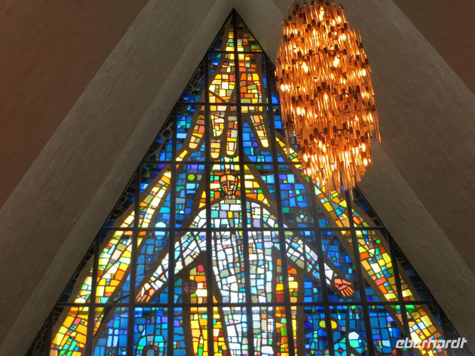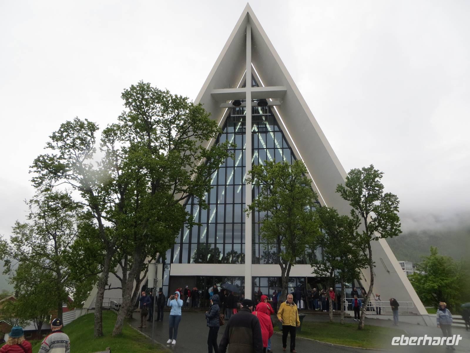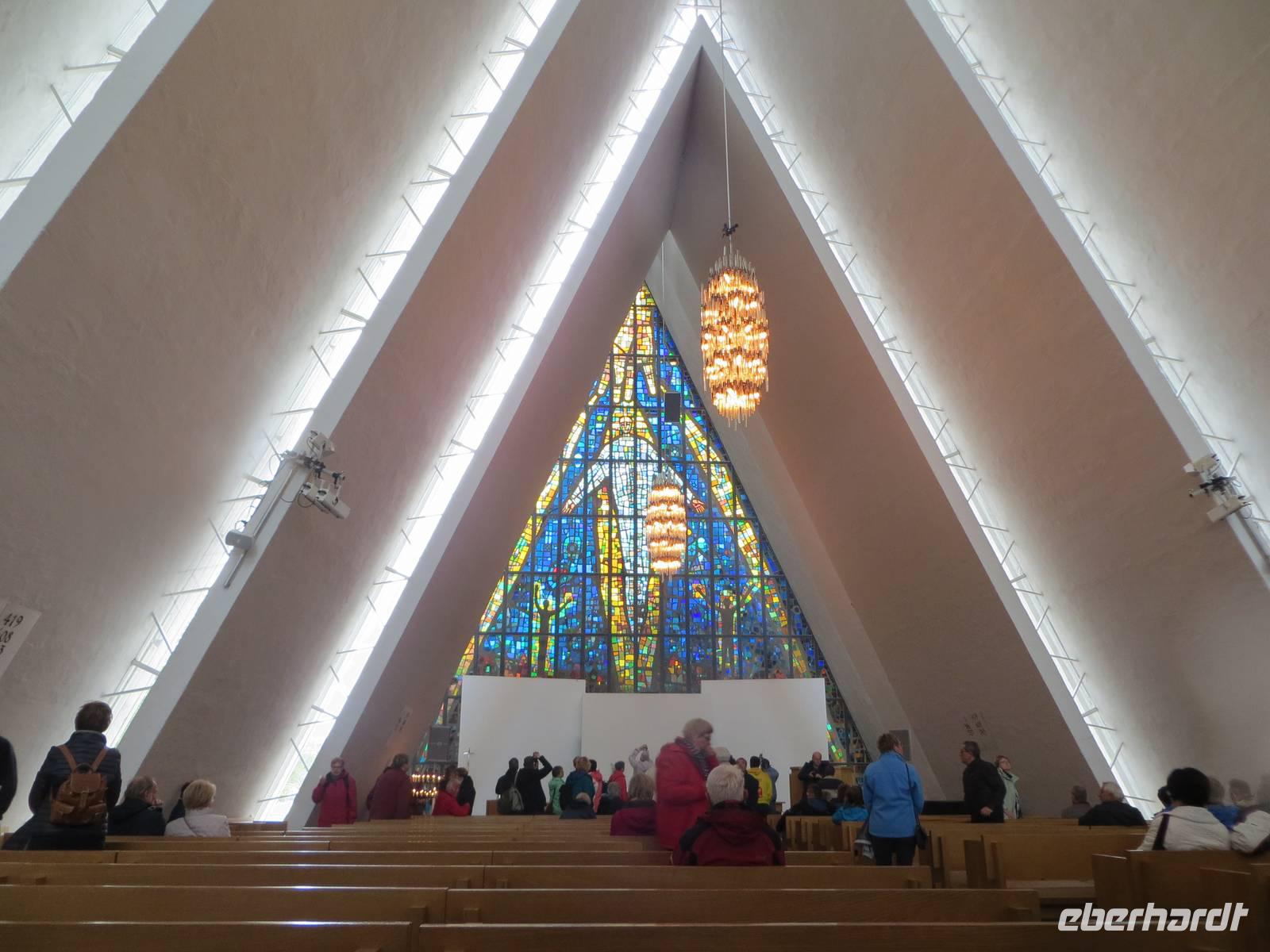 Vorbei am Polarmuseum und der Traditionsbrauerei MACK erreichten wir, erneut über die Tromsø-Brücke fahrend, ein weiteres Wahrzeichen der Stadt, die berühmte Eismeerkathedrale. Sie prägt die Silhouette der Neustadt. Ihre Dreieckform ist einzigartig und erinnert an die mächtigen Gestelle für Trockenfisch. Hier schuf der Architekt Jan Inge Horge dem über Jahrhunderte Haupt-Erwerbszweig der Fischerei ein bleibendes Denkmal. Im Inneren bestaunten wir eines der größten Glasmosaike Europas, mit dem Motiv von Christi Wiedergeburt. Es soll bei Sonnenlicht in besonders hellen Farben erstrahlen. Dieser Anblick war uns heute leider nicht gegönnt. Nach genügend Zeit zur Innen- und Außenbesichtigung fuhren wir zurück zu unserem schwimmenden Hotel.