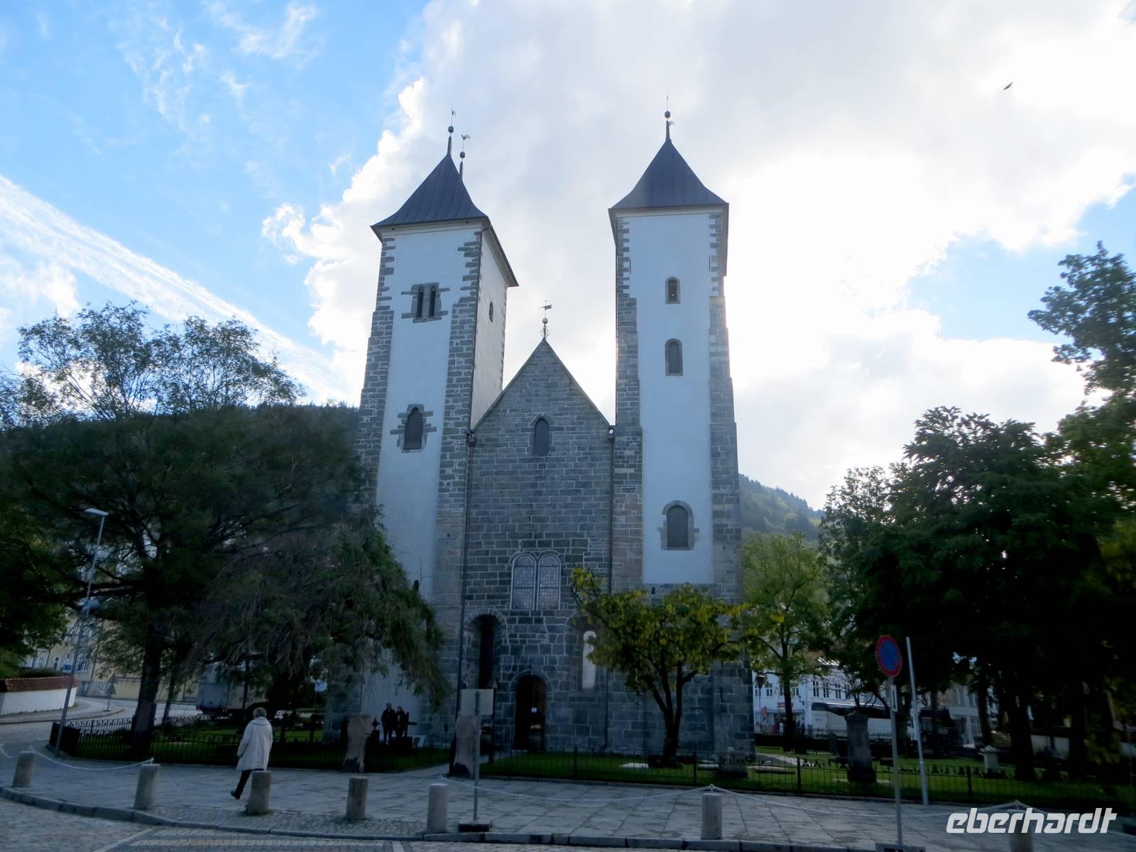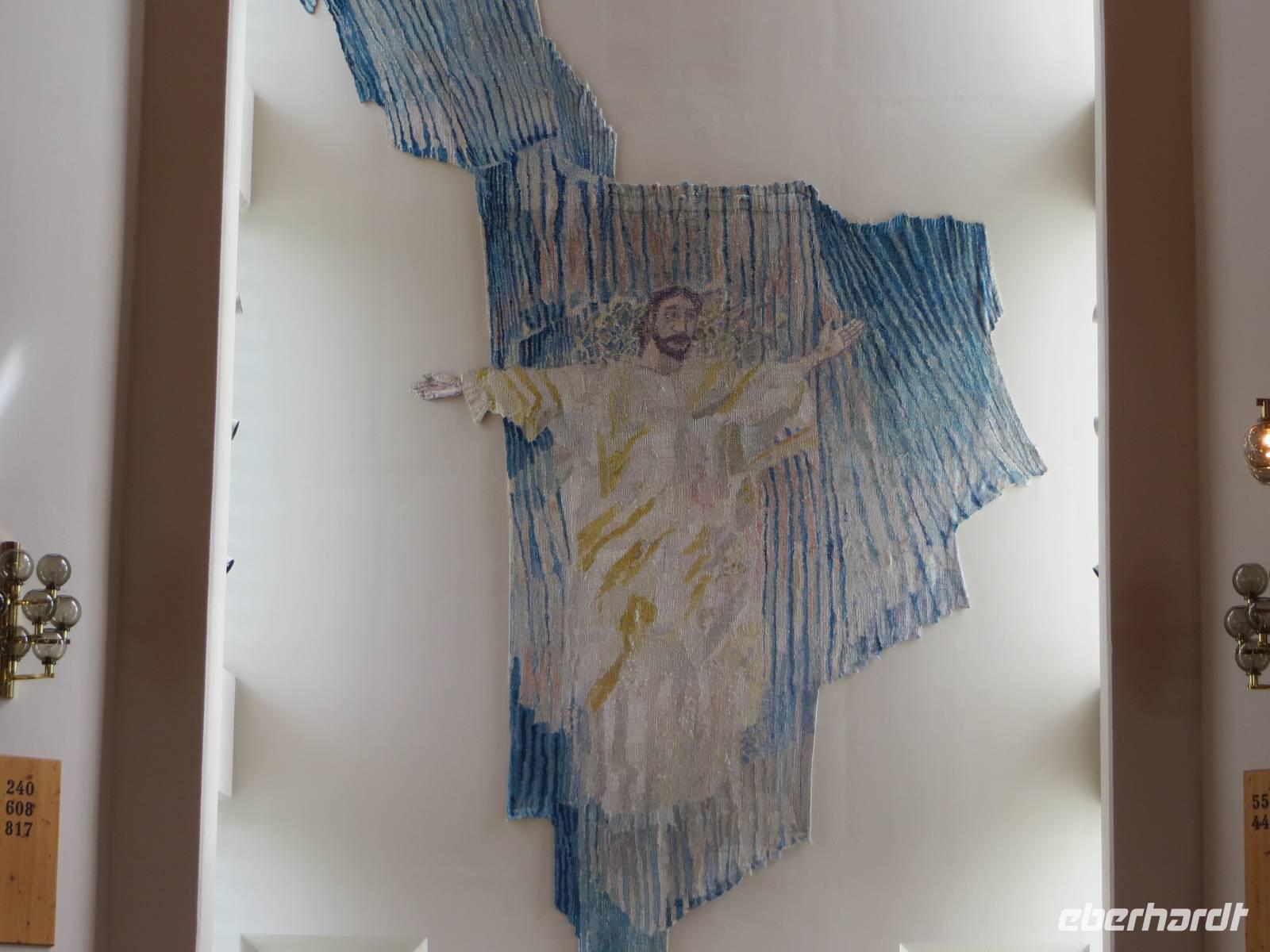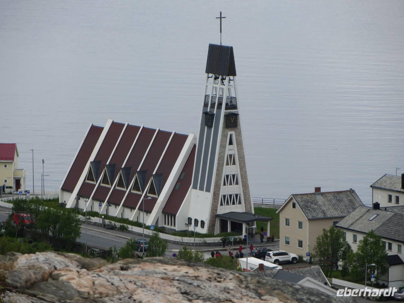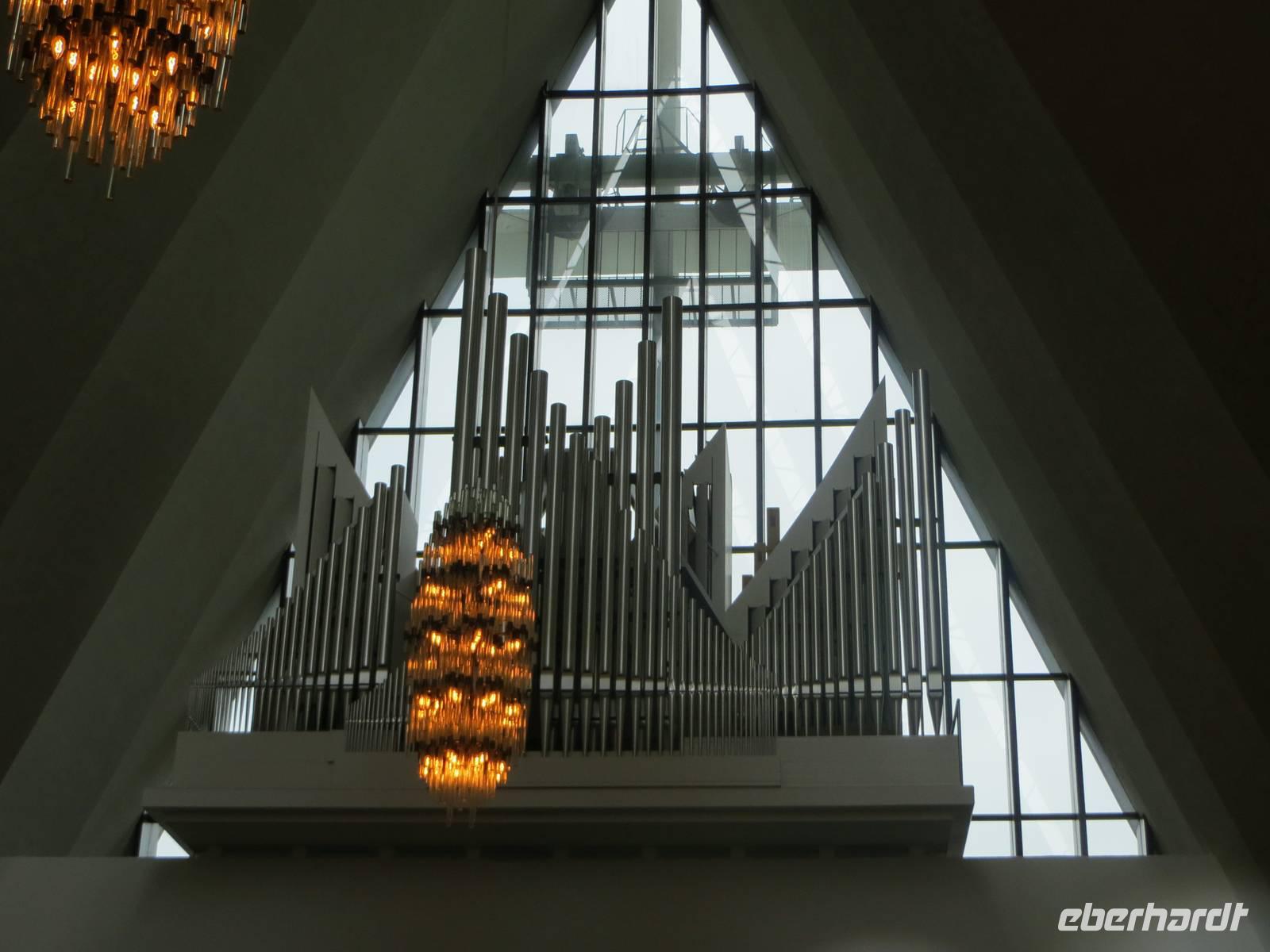 Vorbei am Polarmuseum und der Traditionsbrauerei MACK erreichten wir, erneut über die Tromsø-Brücke fahrend, ein weiteres Wahrzeichen der Stadt, die berühmte Eismeerkathedrale. Sie prägt die Silhouette der Neustadt. Ihre Dreieckform ist einzigartig und erinnert an die mächtigen Gestelle für Trockenfisch. Hier schuf der Architekt Jan Inge Horge dem über Jahrhunderte Haupt-Erwerbszweig der Fischerei ein bleibendes Denkmal. Im Inneren bestaunten wir eines der größten Glasmosaike Europas, mit dem Motiv von Christi Wiedergeburt. Es soll bei Sonnenlicht in besonders hellen Farben erstrahlen. Dieser Anblick war uns heute leider nicht gegönnt. Nach genügend Zeit zur Innen- und Außenbesichtigung fuhren wir zurück zu unserem schwimmenden Hotel.