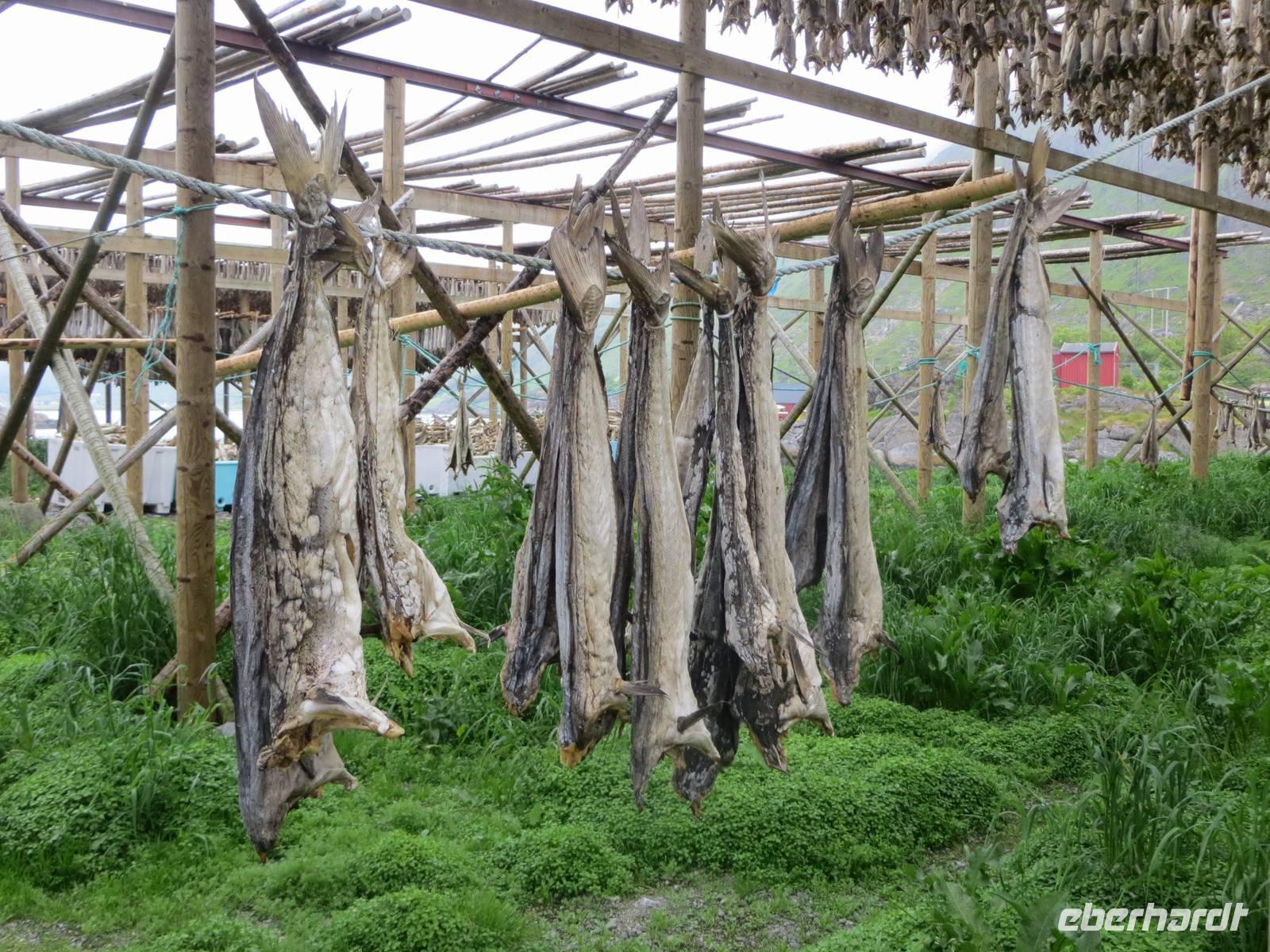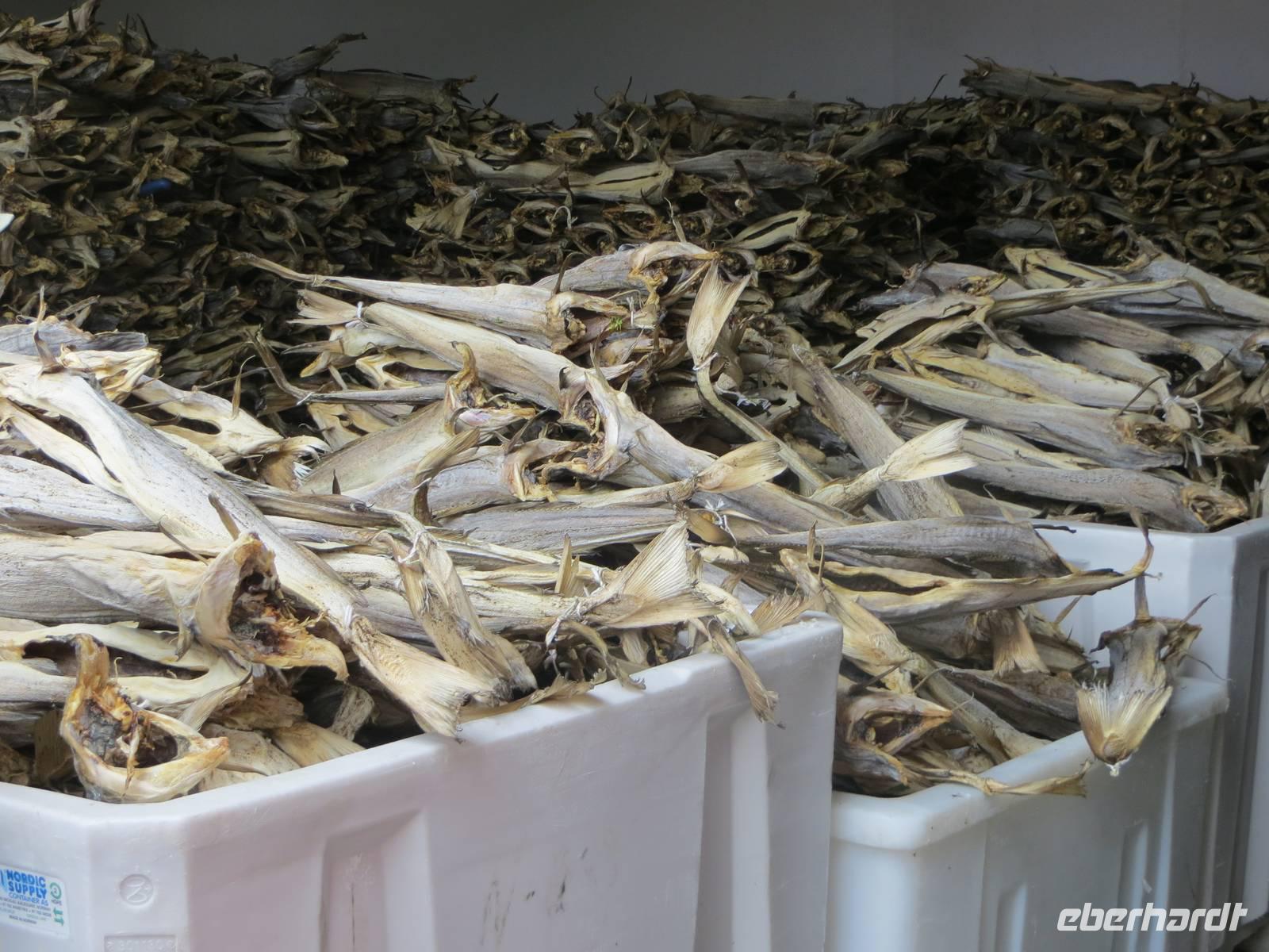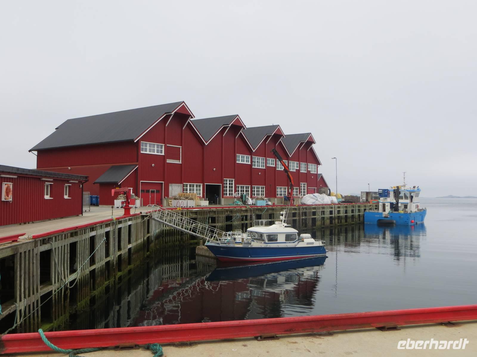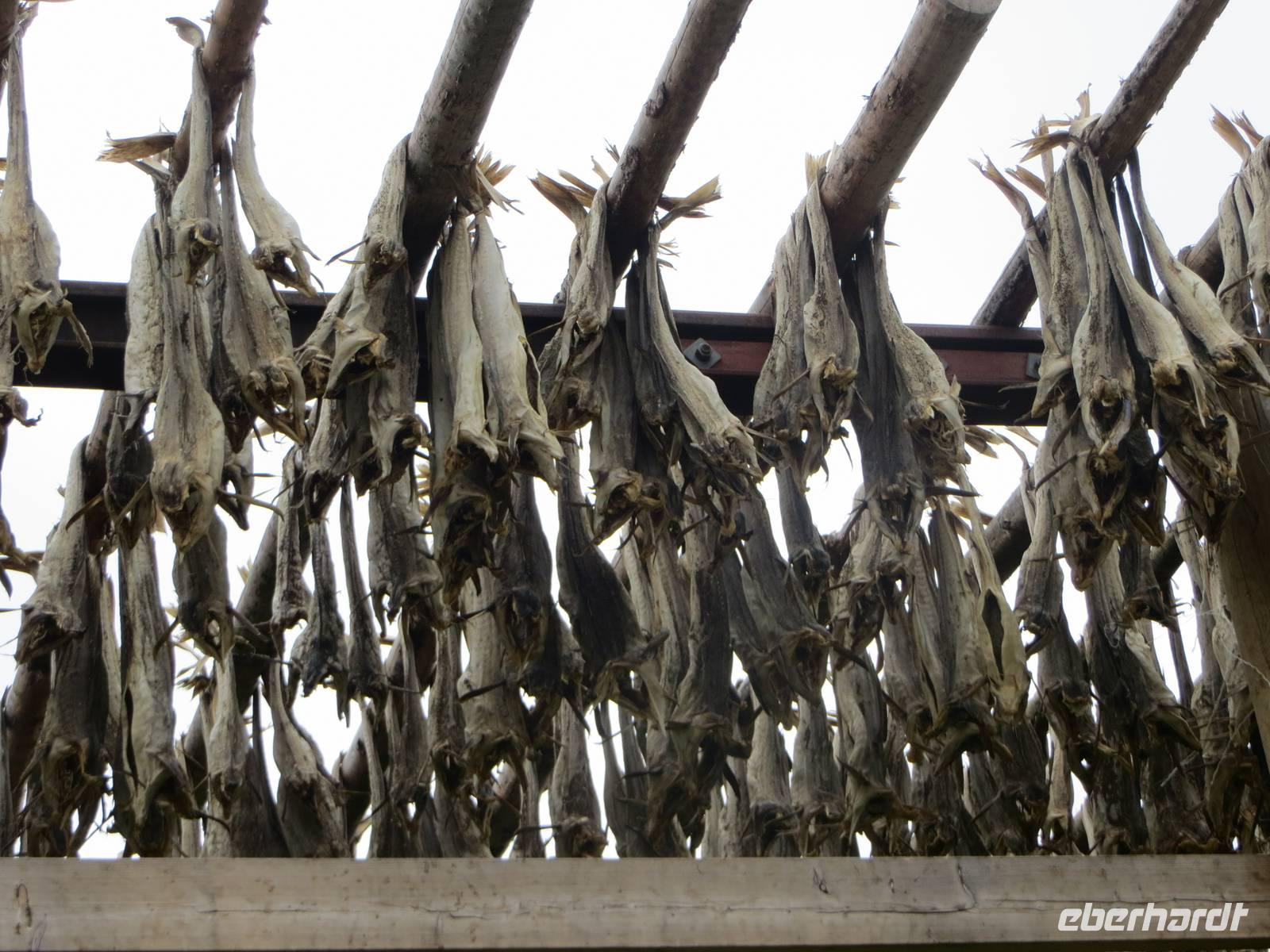 14 °C, neblig und leicht bewölkt so zeigte sich der Morgen. Unsere AIDAluna liegt heute in der Bucht vor Gravdal auf Reede. Zum ersten und einzigen Mal war Tendern angesagt. Also trafen wir uns etwas eher und fuhren mit einem der ersten Tenderboote zur Pier hinüber. Hier begrüßte uns unsere örtliche Reiseleiterin Magdalena zu unserem zweiten Eberhardt-Inklusiv-Ausflug während unserer Kreuzfahrt. Sie führte uns sehr sachkundig und engagiert über die Hauptinsel Vestvagøy. Zuerst fuhren wir durch das Verwaltungszentrum der Lofoten, Leknes, nach Stamsund. Unterwegs stoppten wir an einem ganz kleinen Hafen, und sahen die Stockfisch-Herstellung, wo die Fische bis zu 70 Prozent ihrer Flüssigkeit abgeben. Magdalena erläuterte das Verfahren, die einzelnen Qualitätsstufen und die unterschiedlichen Zubereitungsarten. Kennen Sie den Unterschied zwischen Stock- und Klippfisch? Gern lüften wir das Geheimnis bei einer unserer Reisen.