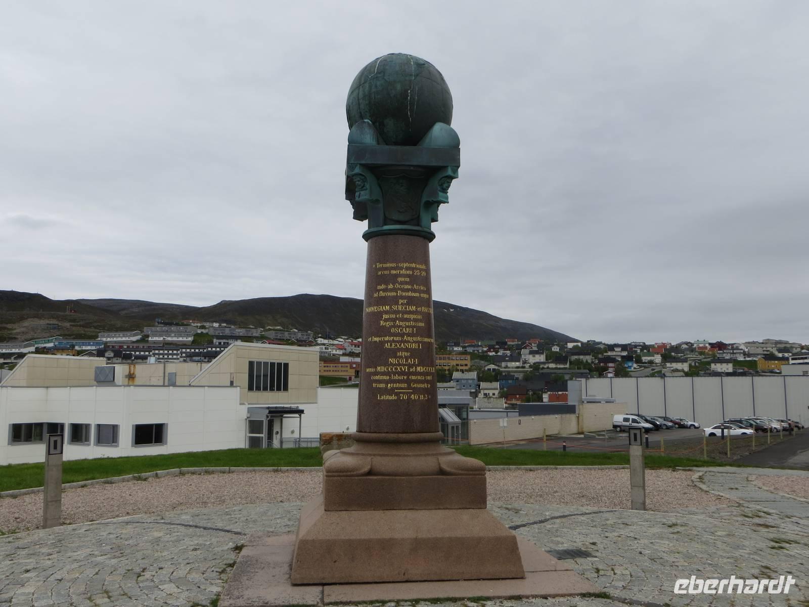 Zurück in Hammerfest besuchten wir den Eisbärenclub in der Touristinformation, gleich neben der Anlegestelle der berühmten Hurtigrute. Das kleine angeschlossene Museum gab uns Einblicke in die Tierwelt und den Fischfang. Vorbei an der berühmten, evangelischen Kirche, 1961 in der Form eines überdimensionalen Trockengestells für Fische errichtet, an der modernen Kunsthalle und am Rathaus erreichten wir den Industriehafen mit der AIDAluna. Bevor wir wieder an Bord gingen, spazierten wir zur Meridiansäule. Diese erinnert an die Erdvermessung durch den russischen Astronom und Geodät Friedrich Georg Struve, der von 1816 bis 1855 die Erde von Hammerfest bis nach Ismail am Schwarzen Meer an 325 Punkten auf 2.821.853 Kilometern vermessen hatte. Der Struve-Meridianbogen durchläuft Norwegen, Schweden, Finnland, Russland, Estland, Lettland, Litauen, Weißrussland, Moldawien und die Ukraine und stellt einen Meilenstein der Wissenschaft dar. Das Denkmal gehört wie der ganze Bogen zum UNESCO-Weltkulturerbe und wurde als erstes technisch-wissenschaftliches Objekt in diese Liste eingetragen.
