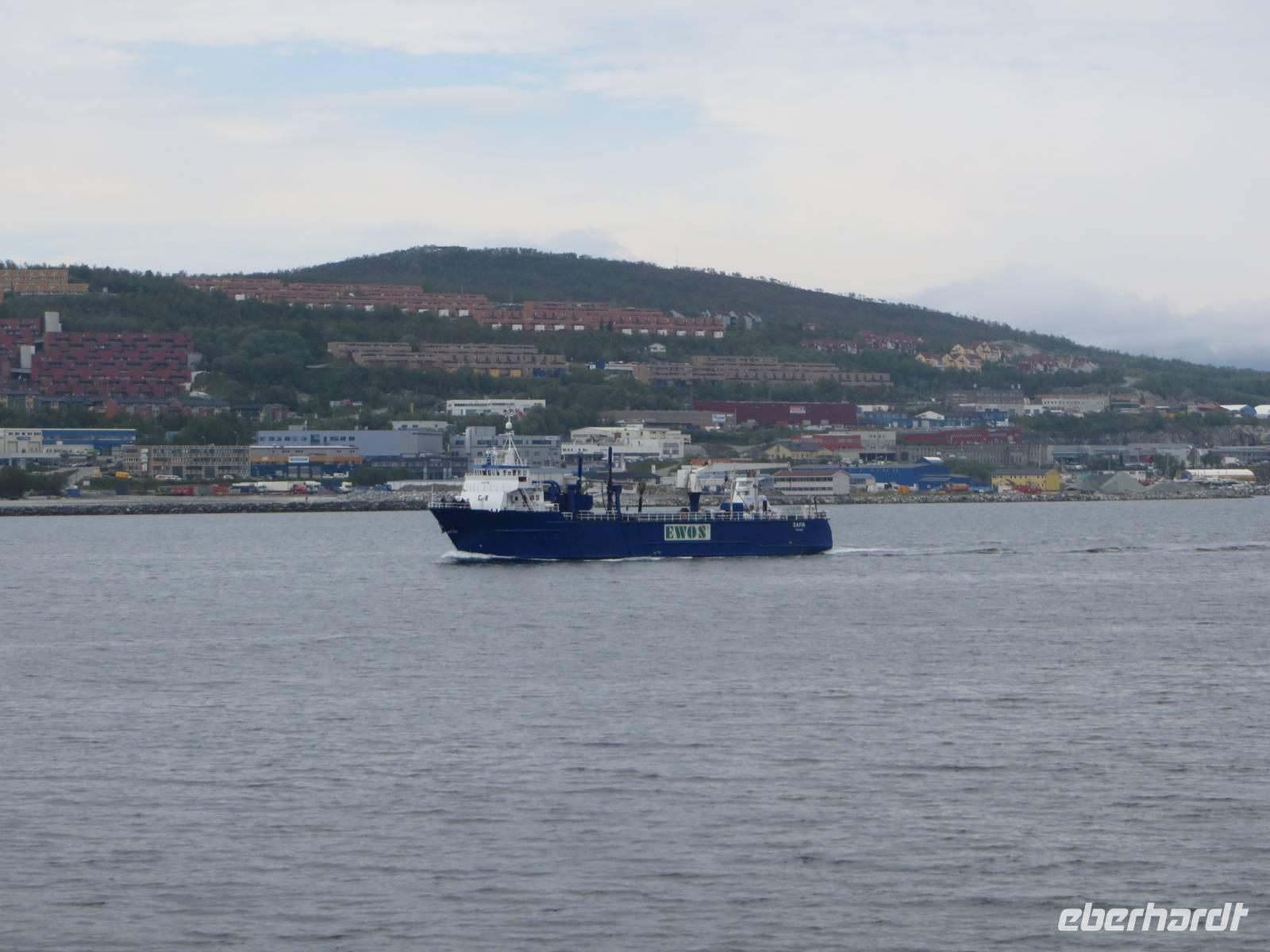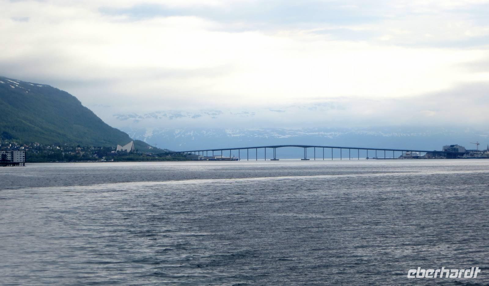 Erneut zeigte sich das Meer ganz ruhig. Doch leider war es heute bewölkt und nebelig. Gern hätten wir auch diese Metropole Nord-Norwegens bei Sonnenschein besichtigt. Das Stadtpanorama ist geprägt durch die gewaltige Brücke über dem Tromsøfjord, die sich über der Fahrrinne imposant in den Himmel streckt, um die Durchfahrt für Schiffe zu ermöglichen.