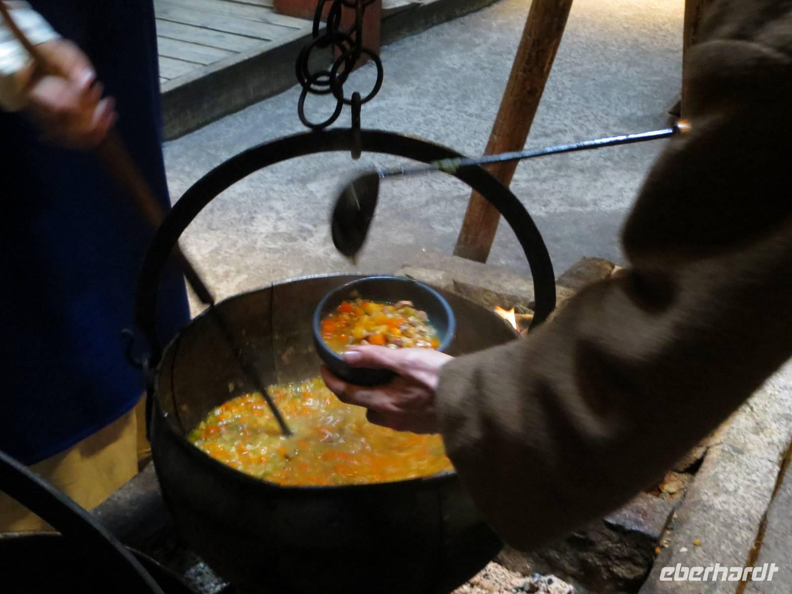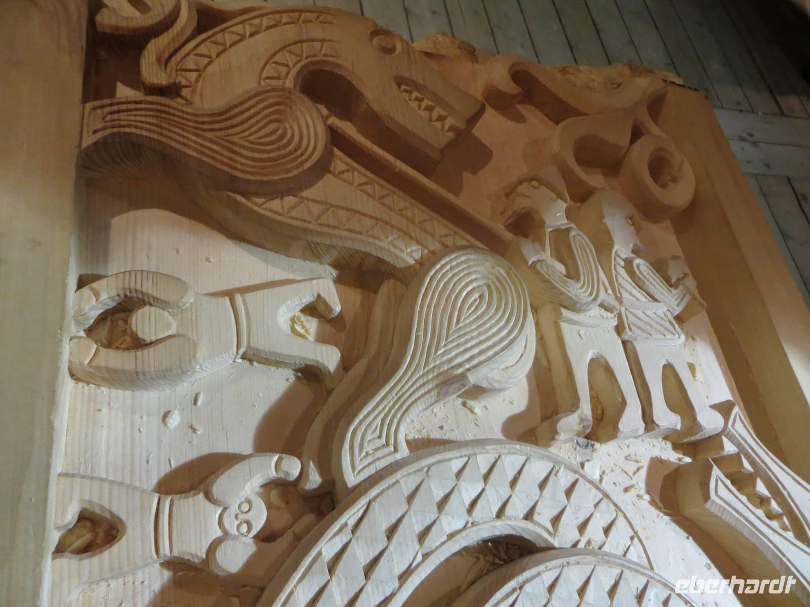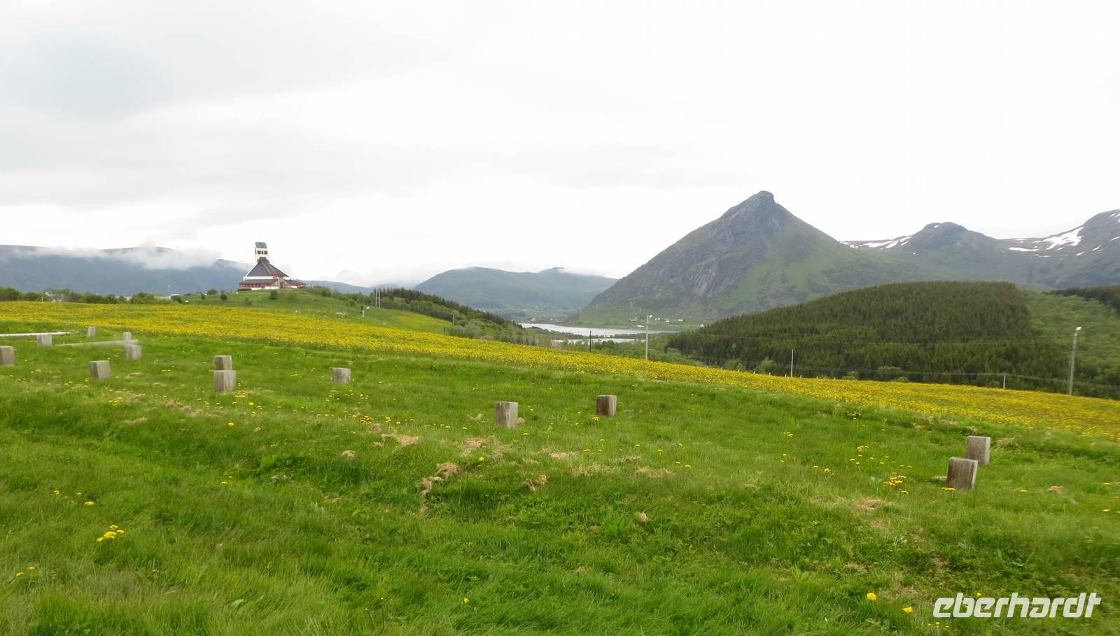Anschließend reisten wir in das Inselinnere vorbei an Wäldern sowie an Wiesen und Weiden. Diese erstrahlten in kräftigem Grün und voller gelber Butterblumen. Die Sonne gab dieser Szenerie einen festlichen Glanz. In Borge verblieb uns Zeit, um die kleine Kirche zu besichtigen und dem Spiel der Orgel, unterstützt von Trompete und Tuba, zu lauschen. Für uns wurde danach im Museum Lofotr die Zeit der Wikinger lebendig. Das interaktive Museum vermittelte uns einen interessanten Einblick in die Geschichte: zum Entdecken des Wikingerhofes aus der späten Eisenzeit durch einen Bauern und zum Leben an diesem Hof. Manfred, unser Führer im historischen Gewand, brachte uns zum original getreuen Nachbau des Langhauses (83 Meter lang). Er berichtete über das Leben der Wikinger und die Götterwelt jener Zeit. Wir sahen der Holzkünstlerin beim Fertigen neuer Eingangsportale zu. Nun wurde es Zeit, uns zu stärken. In der großen Festhalle war für uns eine kräftige, deftige Wikingermahlzeit vorbereitet. Und es hat uns sehr gut geschmeckt ... hm. Das Rezept geben wir nur mündlich weiter. Es blieb uns etwas Zeit, um auch andere Handwerke auf dem Wikingerhof kennenzulernen. Wir hatten erneut ein tolles Museum besichtigt.