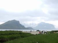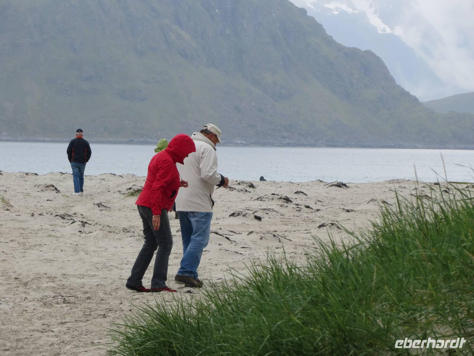 Leider präsentierte sich das Wetter nun nicht mehr von der freundlichen Seite. Magdalena zeigte uns die kleine Festung Eggum, wo wir Stockfisch probierten. Schließlich legten wir am Sandstrand von Haukland eine Pause zum Strandbummel und Muschelsuchen ein. Es gab interessante Funde, selbst Perlmutt wurde entdeckt. Nun setzte starker Regen ein. Deshalb besichtigten wir Utakleiv, Gravdal und Ballstad ohne weitere Stopps vom Bus aus. Wir sahen die rot-weiße Buksnes-Stabkirche von Gravdal und in Ballstadt den Hafen mit der Werft. Am Trockendock erblickten wir das mit 3.000 Quadratmetern größtes Wandgemälde der Welt. Im Hafen von Gravdal erwärmten wir uns an einer Tasse heißen Tees, bevor wir zur AIDAluna zurückkehrten. Unser Bootsführer ließ das Tenderboot etwas schaukeln. Das hatten wir während unsere Kreuzfahrt bisher noch nicht erlebt ... wir hatten immer eine glatte See.