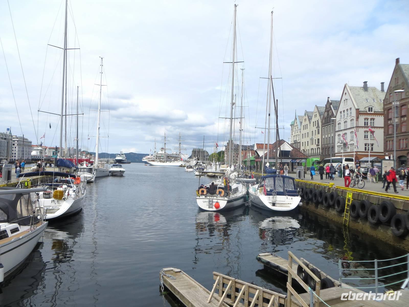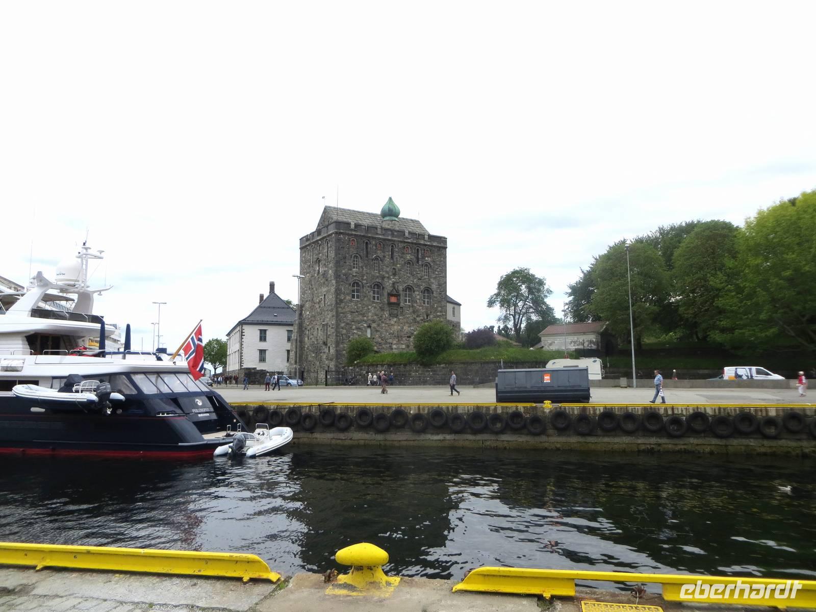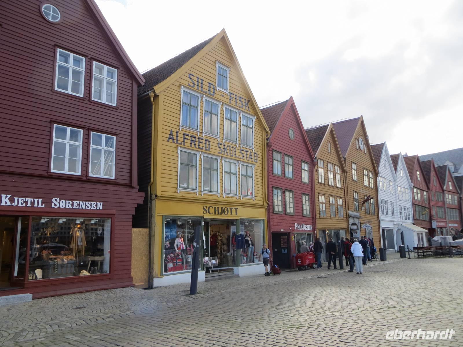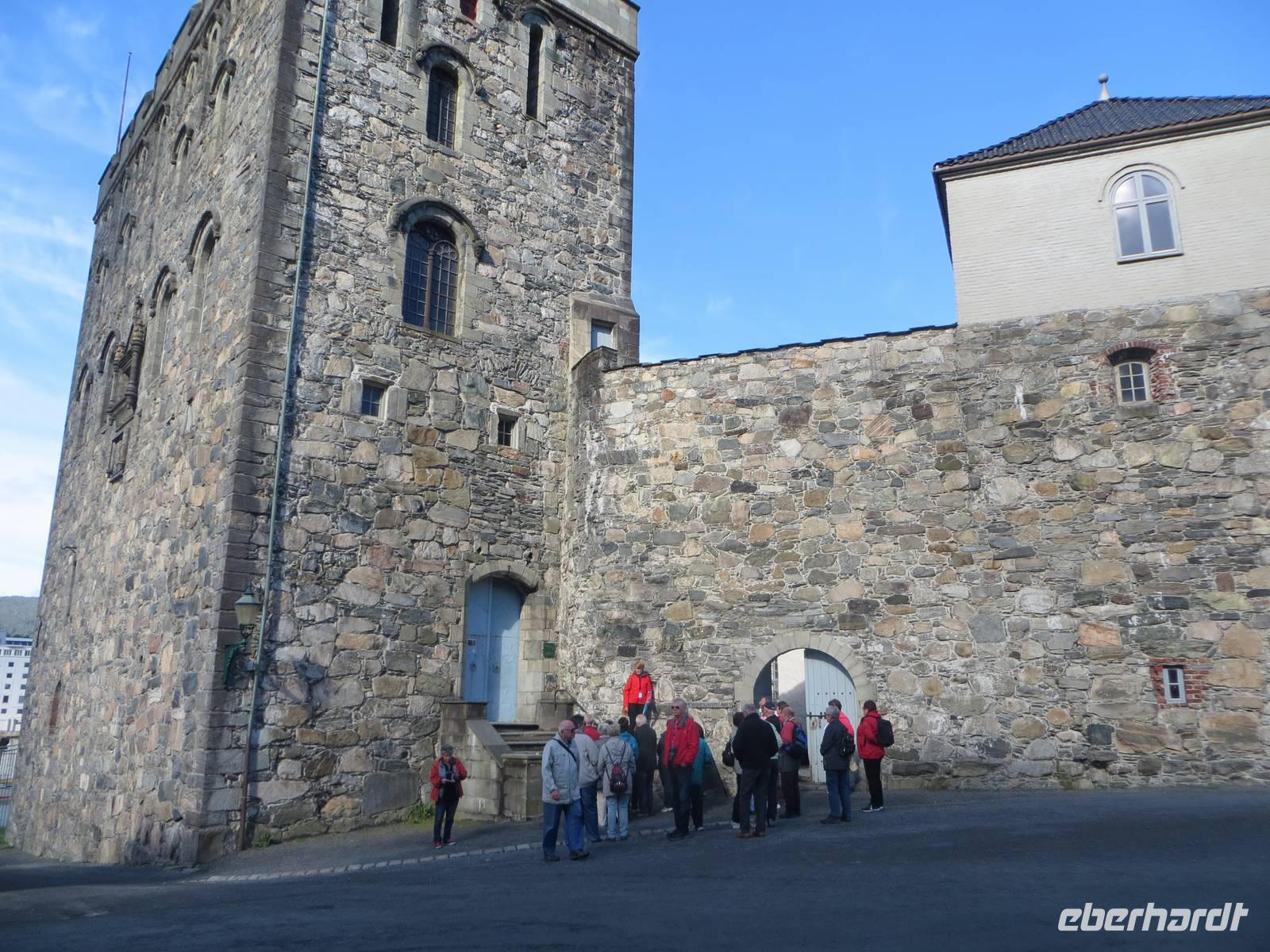 Der Blick aus der Kabine versprach bereits bei der Einfahrt in die gewaltige Bucht von Bergen einen schönen Tag: Sonnenschein, leicht bewölkt und 16 °C. Gleich nach dem Anlegen trafen wir unsere örtliche Reiseleiterin Sarah zum dritten Eberhardt-Inklusiv-Ausflug unserer Kreuzfahrt. Gemütlich spazierten wir zur Håkans-Halle und zur Festung Bergenhus, lauschten den Geschichten um den Rosenkrantz-Turm und die Marienkirche ... Dann standen wir am berühmten Viertel Tyske Brygge. Sarah berichtete aus dem Leben der Kaufmänner und erläuterte die „ehrbaren" Inschriften der Häuser. Natürlich flanierten wir durch das Gewirr der Gässchen, die miteinander verschachtelten Kontore und Galerien. Unser Besuch im Hanseatischen Museum vermittelte uns ein nahezu identisches Bild vom Leben der Kaufleute, der Gesellen und der Lehrlinge. Wir merkten kaum den Übergang von einem Kaufmannshaus in das andere.
