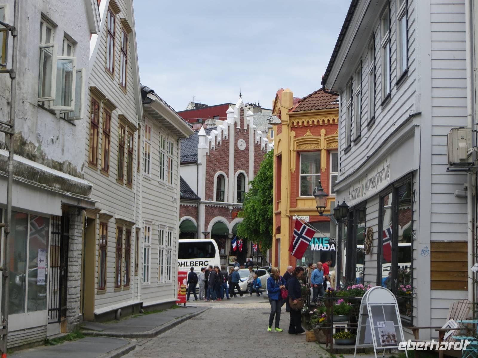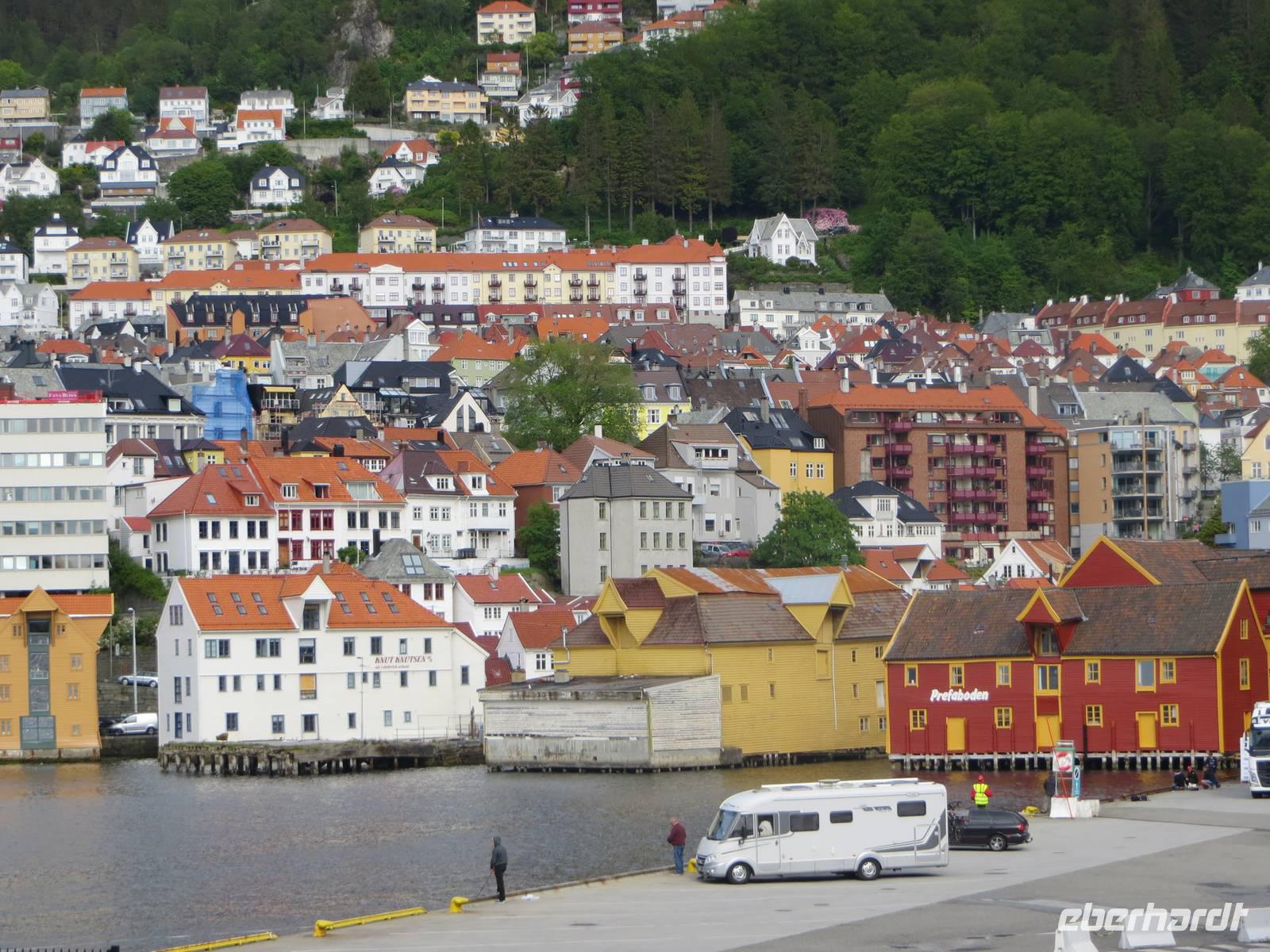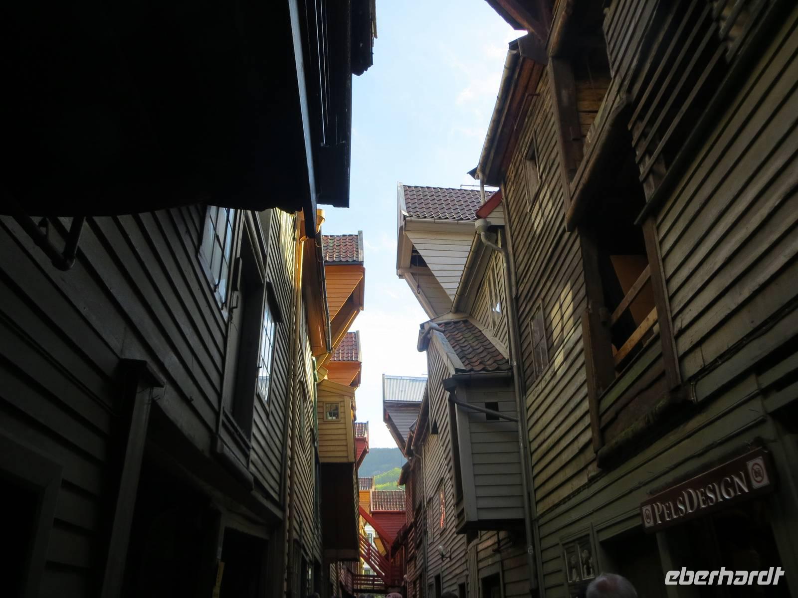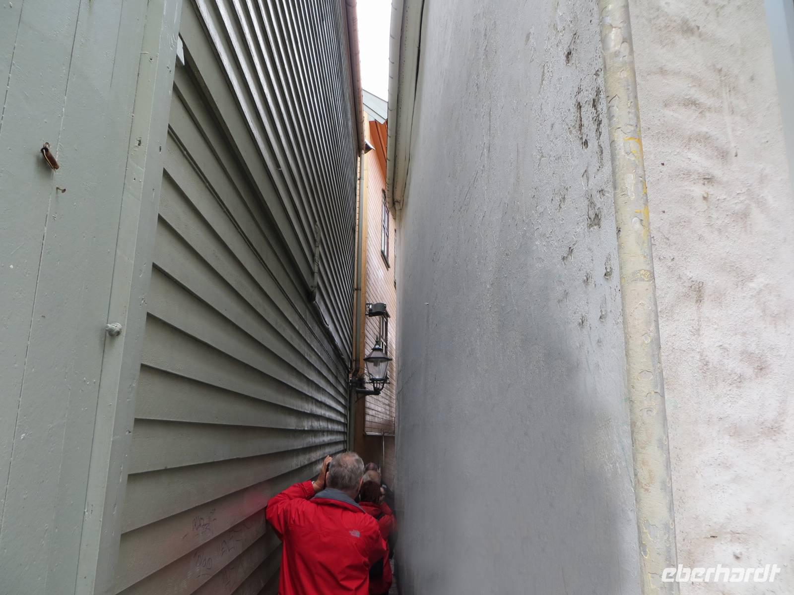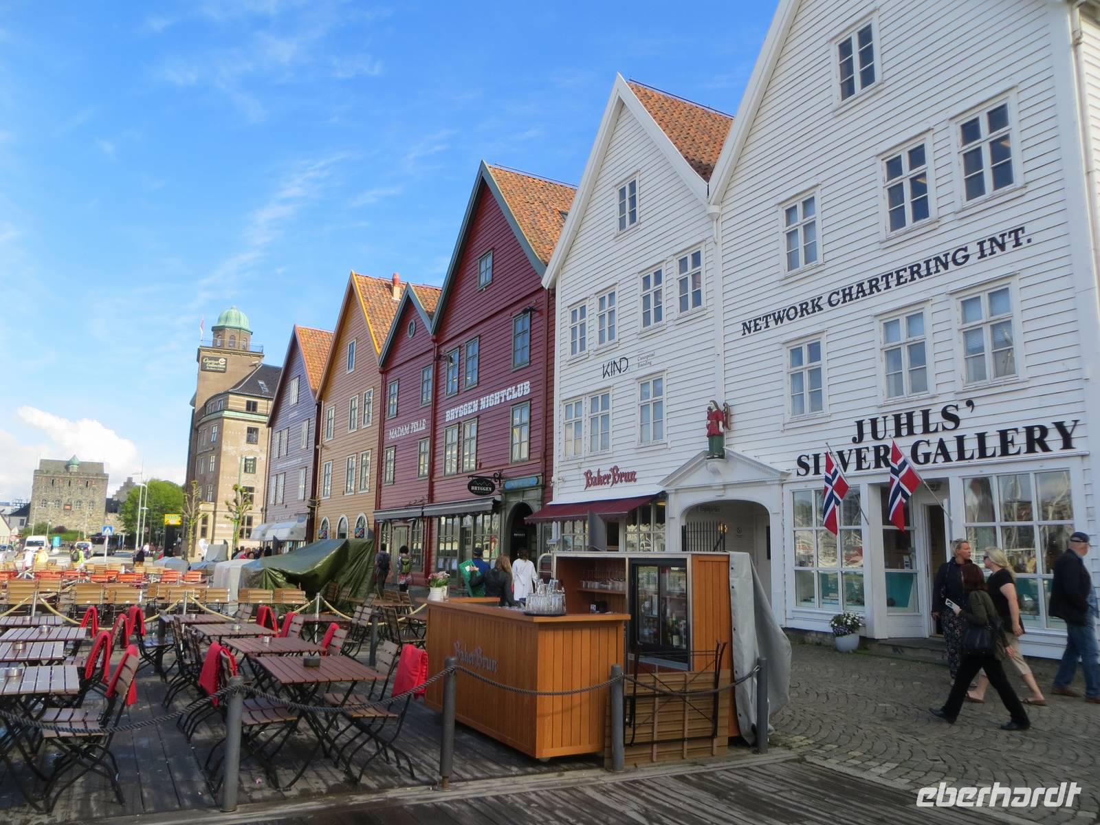 Der Blick aus der Kabine versprach bereits bei der Einfahrt in die gewaltige Bucht von Bergen einen schönen Tag: Sonnenschein, leicht bewölkt und 16 °C. Gleich nach dem Anlegen trafen wir unsere örtliche Reiseleiterin Sarah zum dritten Eberhardt-Inklusiv-Ausflug unserer Kreuzfahrt. Gemütlich spazierten wir zur Håkans-Halle und zur Festung Bergenhus, lauschten den Geschichten um den Rosenkrantz-Turm und die Marienkirche ... Dann standen wir am berühmten Viertel Tyske Brygge. Sarah berichtete aus dem Leben der Kaufmänner und erläuterte die „ehrbaren" Inschriften der Häuser. Natürlich flanierten wir durch das Gewirr der Gässchen, die miteinander verschachtelten Kontore und Galerien. Unser Besuch im Hanseatischen Museum vermittelte uns ein nahezu identisches Bild vom Leben der Kaufleute, der Gesellen und der Lehrlinge. Wir merkten kaum den Übergang von einem Kaufmannshaus in das andere.
