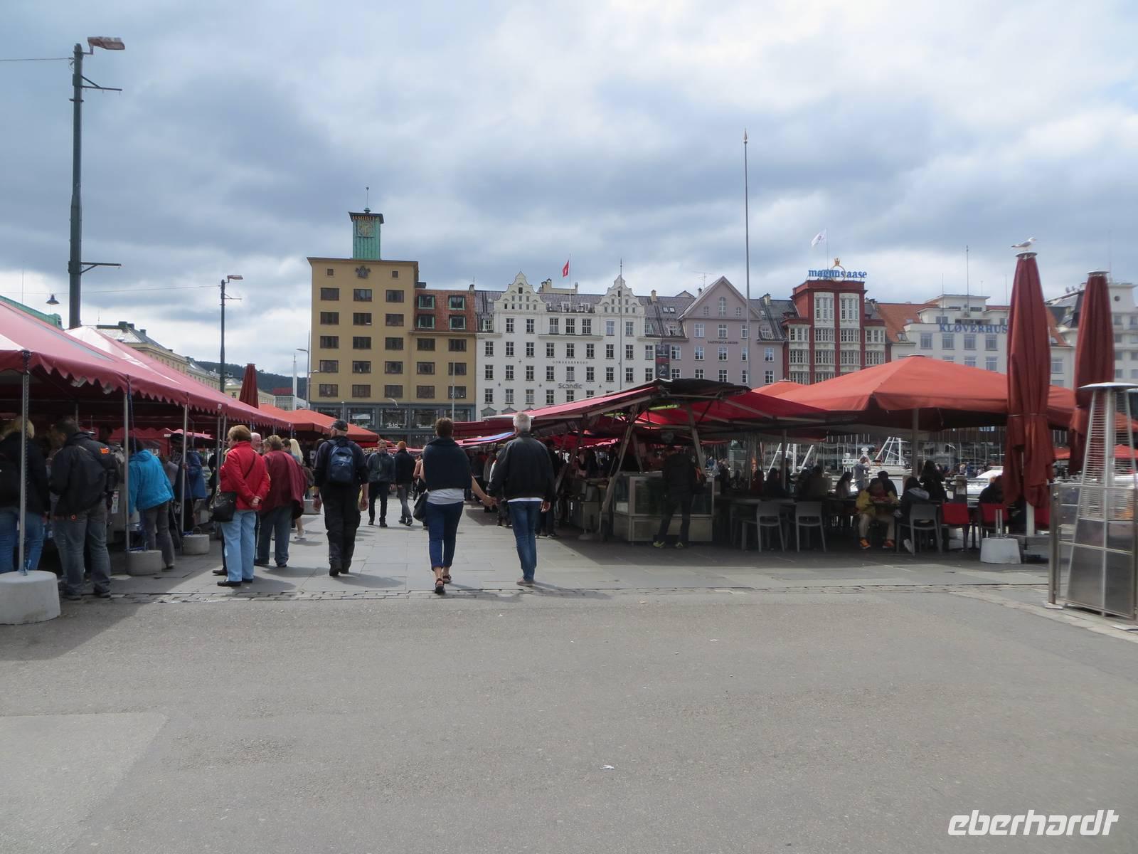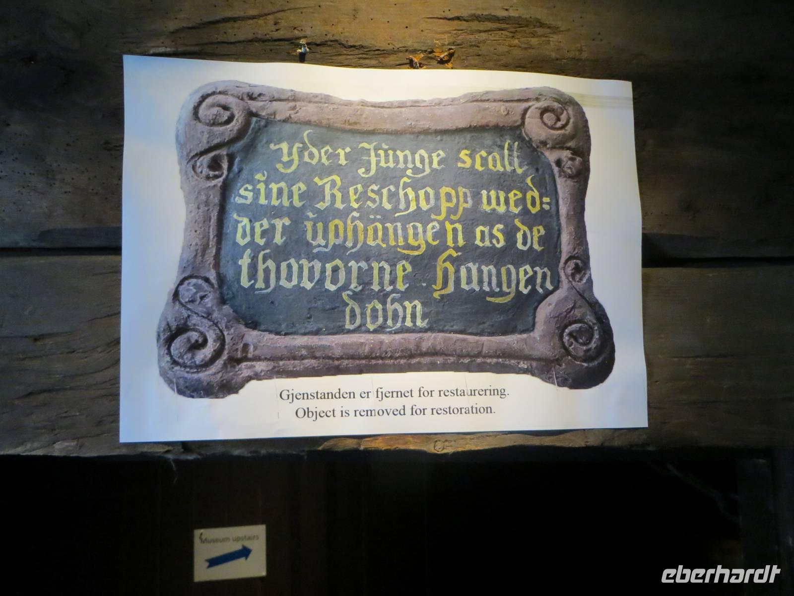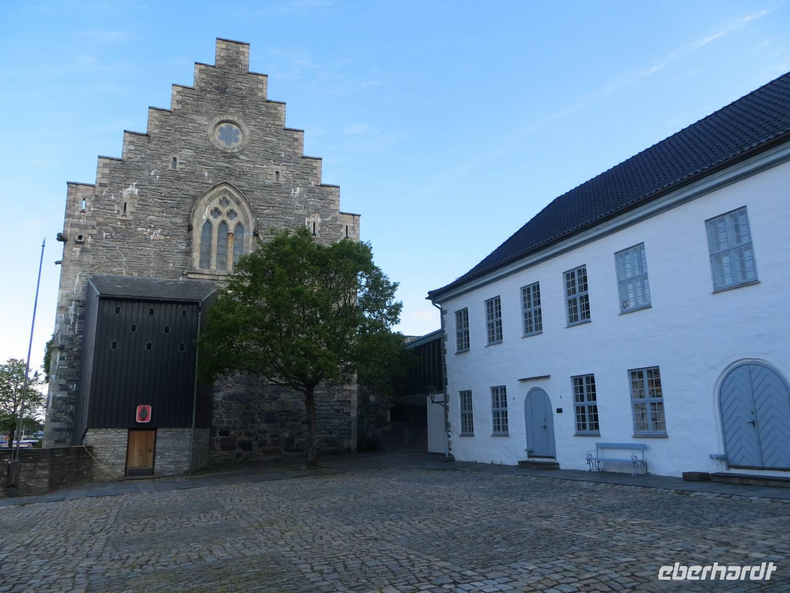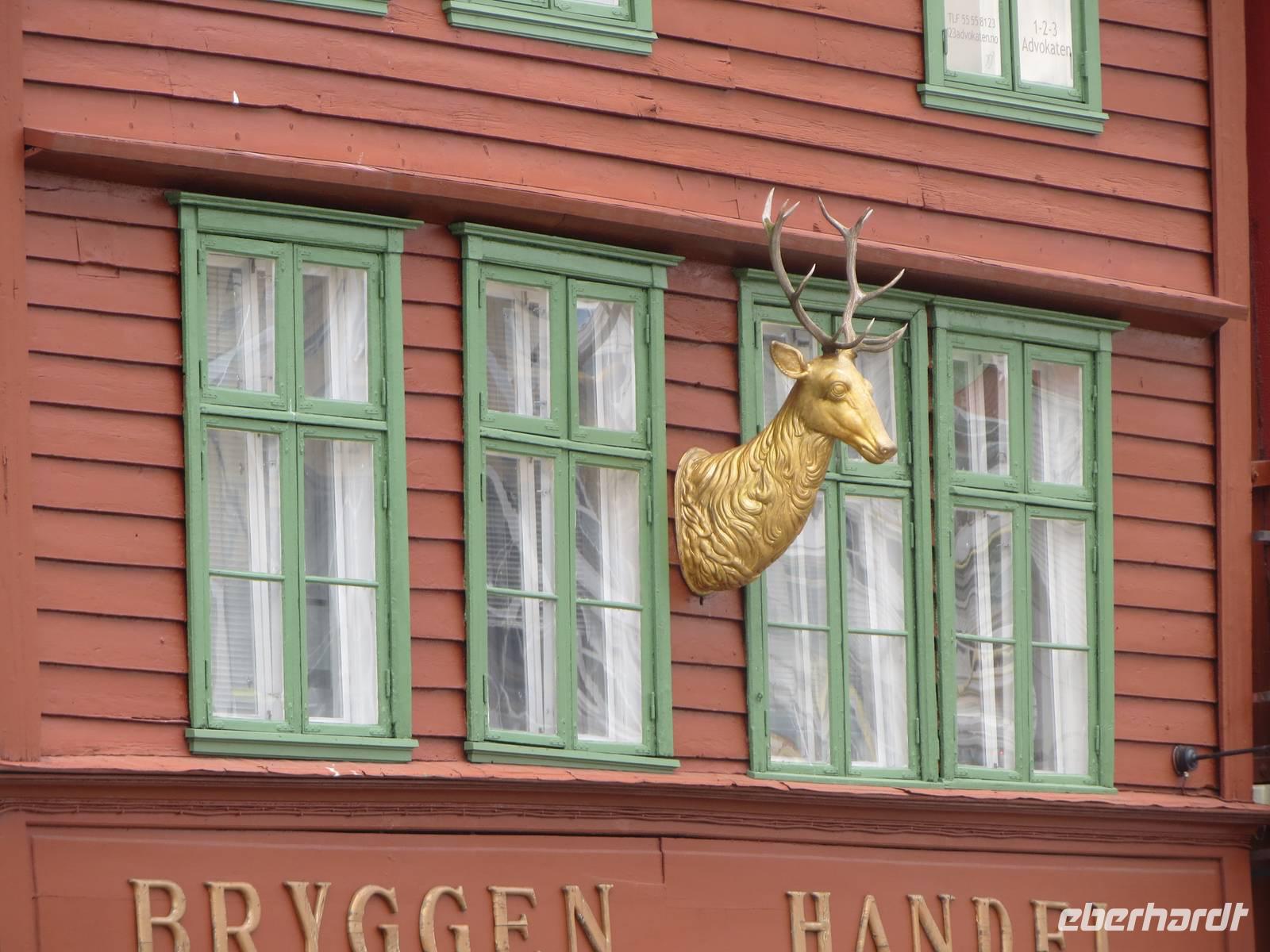 Der Blick aus der Kabine versprach bereits bei der Einfahrt in die gewaltige Bucht von Bergen einen schönen Tag: Sonnenschein, leicht bewölkt und 16 °C. Gleich nach dem Anlegen trafen wir unsere örtliche Reiseleiterin Sarah zum dritten Eberhardt-Inklusiv-Ausflug unserer Kreuzfahrt. Gemütlich spazierten wir zur Håkans-Halle und zur Festung Bergenhus, lauschten den Geschichten um den Rosenkrantz-Turm und die Marienkirche ... Dann standen wir am berühmten Viertel Tyske Brygge. Sarah berichtete aus dem Leben der Kaufmänner und erläuterte die „ehrbaren" Inschriften der Häuser. Natürlich flanierten wir durch das Gewirr der Gässchen, die miteinander verschachtelten Kontore und Galerien. Unser Besuch im Hanseatischen Museum vermittelte uns ein nahezu identisches Bild vom Leben der Kaufleute, der Gesellen und der Lehrlinge. Wir merkten kaum den Übergang von einem Kaufmannshaus in das andere.